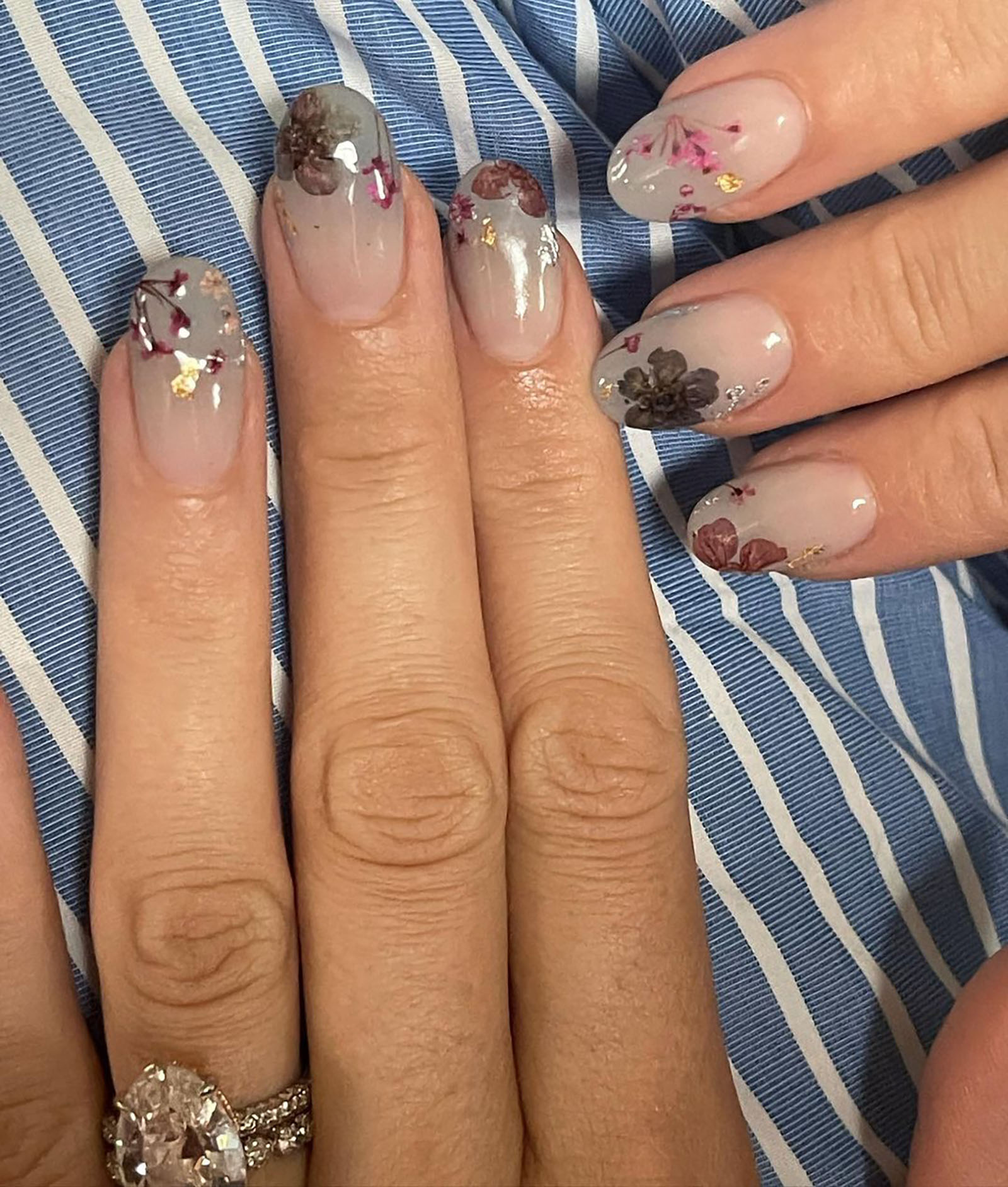 Ethereal and romantic, milk bath nails evoke inviting calm and a sense of wanderlust (and they’re super pretty). Blake Lively wears a creamy milk bath base with delicately placed floral decals that accentuate her ring.
