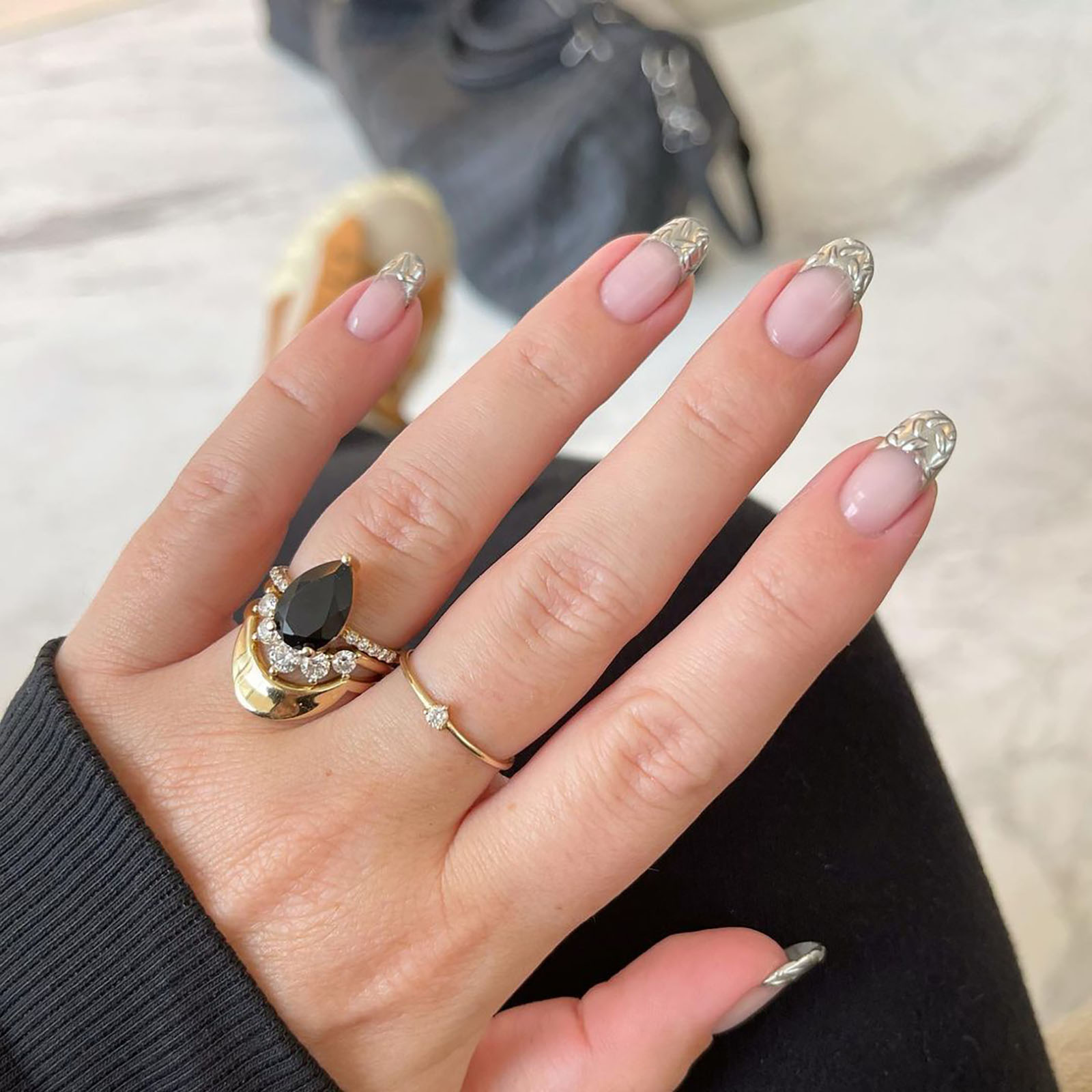 Once upon a time, the black mani was reserved for Halloween and/or angsty teens. No longer: black nails are a modern classic, and one of the chicest options for an engagement nail look. Just take a cue from Kourtney Kardashian. Dark, edgy, yet still very much romantic – we’re here for it.
