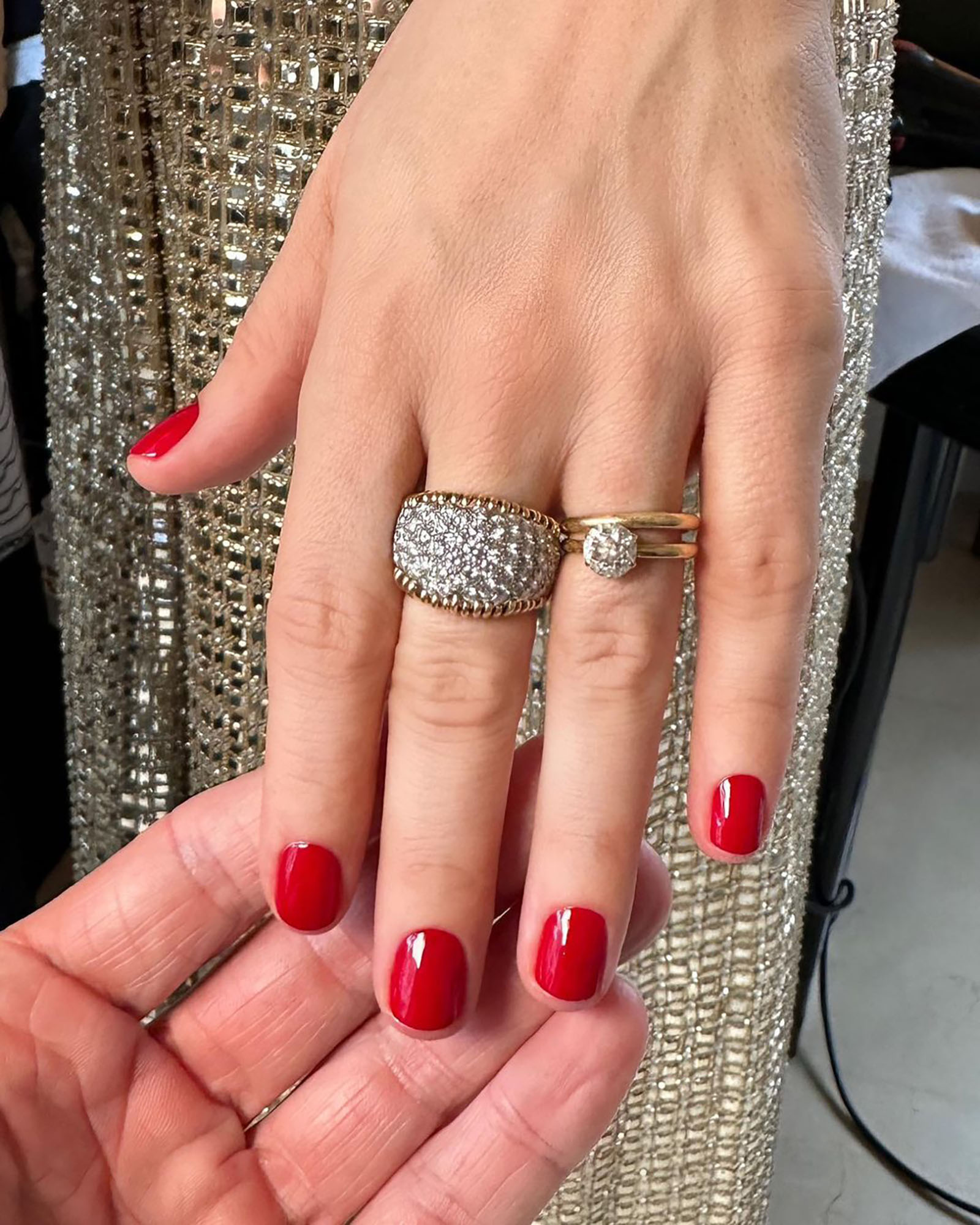 We love this warm gold-orange shade Beyoncé sports. It’s got a sheer coverage and a light metallic sheen that doesn’t overpower the stunning ring on her finger.