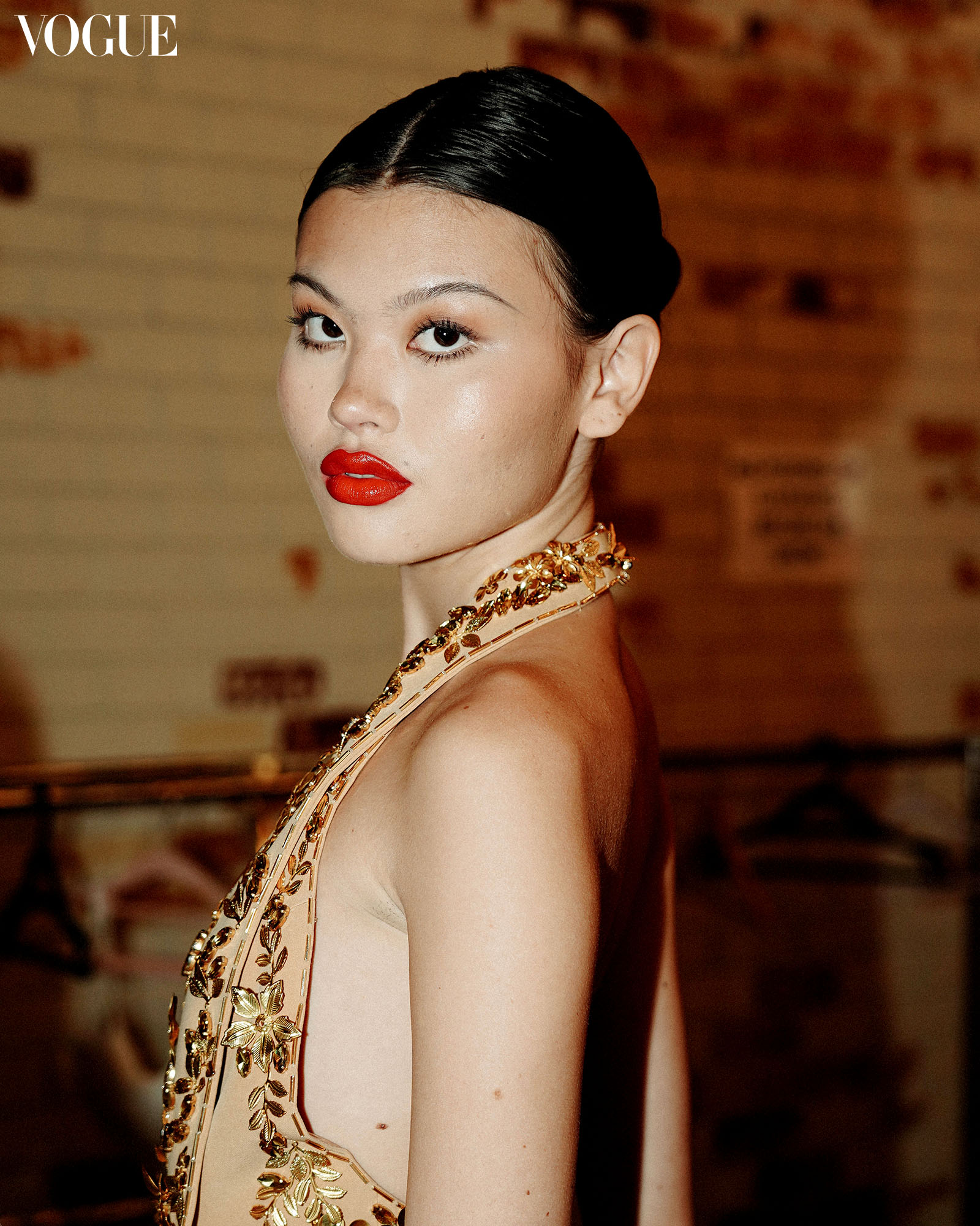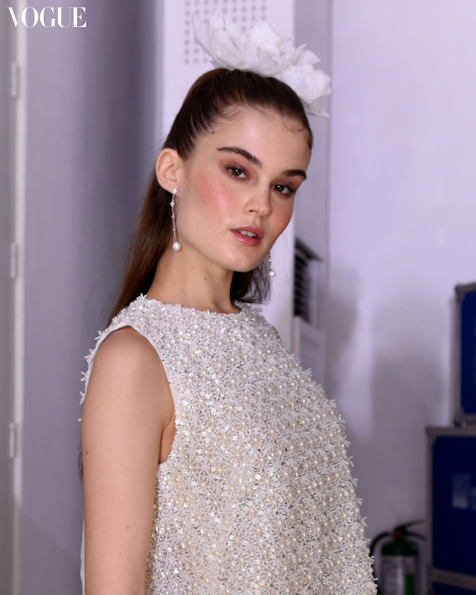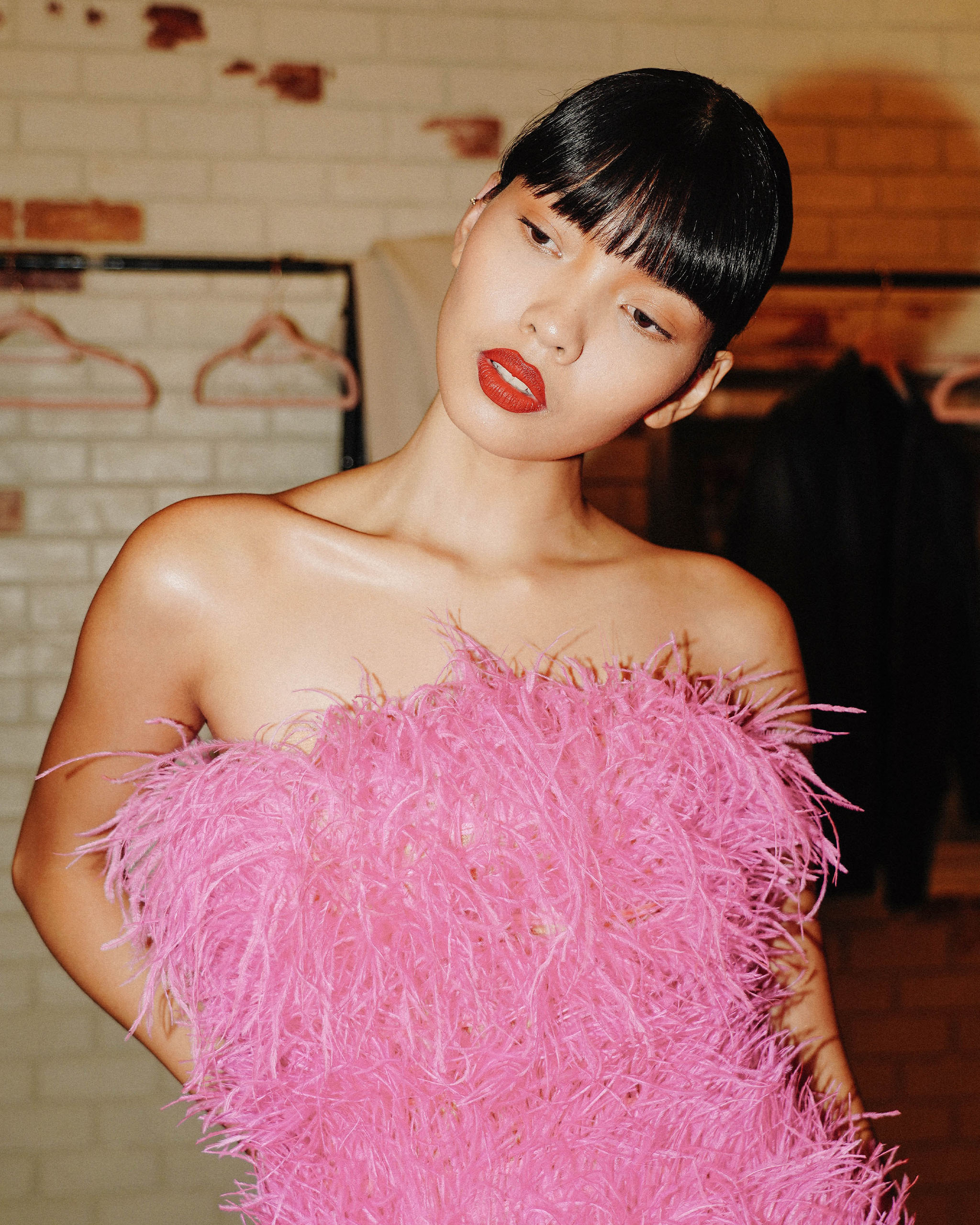 Cheetah Rivera’s beauty statement was the bold red lip. According to the designer, she imagines the Cheetah Rivera woman to be “dangerous and sexy, fearless and unapologetically expressive.” The red lip, drawn precisely with a cupid’s bow, perfectly embodies this ethos. A statement red lip is a timeless classic, and topped with a light sheer gloss, it takes on a renewed face as an accessory for the delicate feminine.
