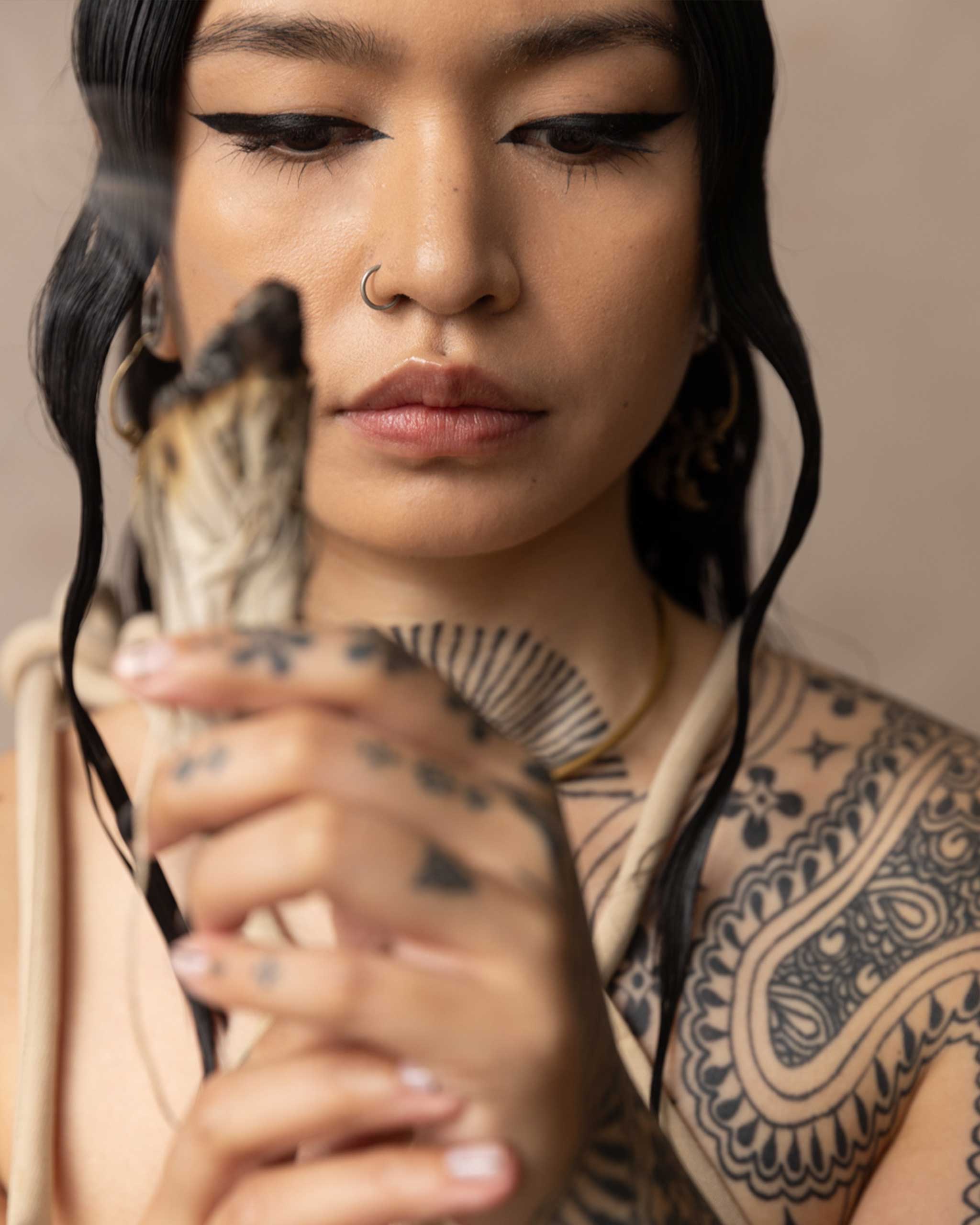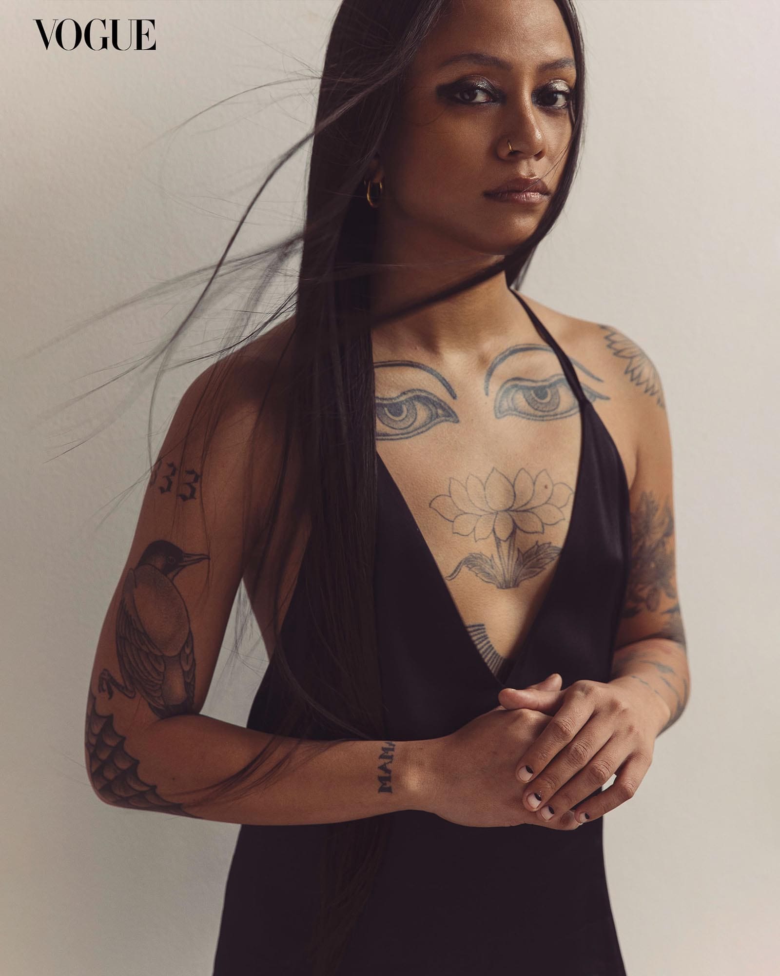 Growing up, Villanueva struggled with selective mutism. “I would always lie, and when I would smile, I would cover my mouth,” she admits. Her neck piece is placed specifically on the throat chakra for this reason, a reminder to honor her truth. On her right shoulder sits an armor that served as a symbol of strength during a difficult time, while the tattoos on her left hand celebrate the creativity that flows from her hands.