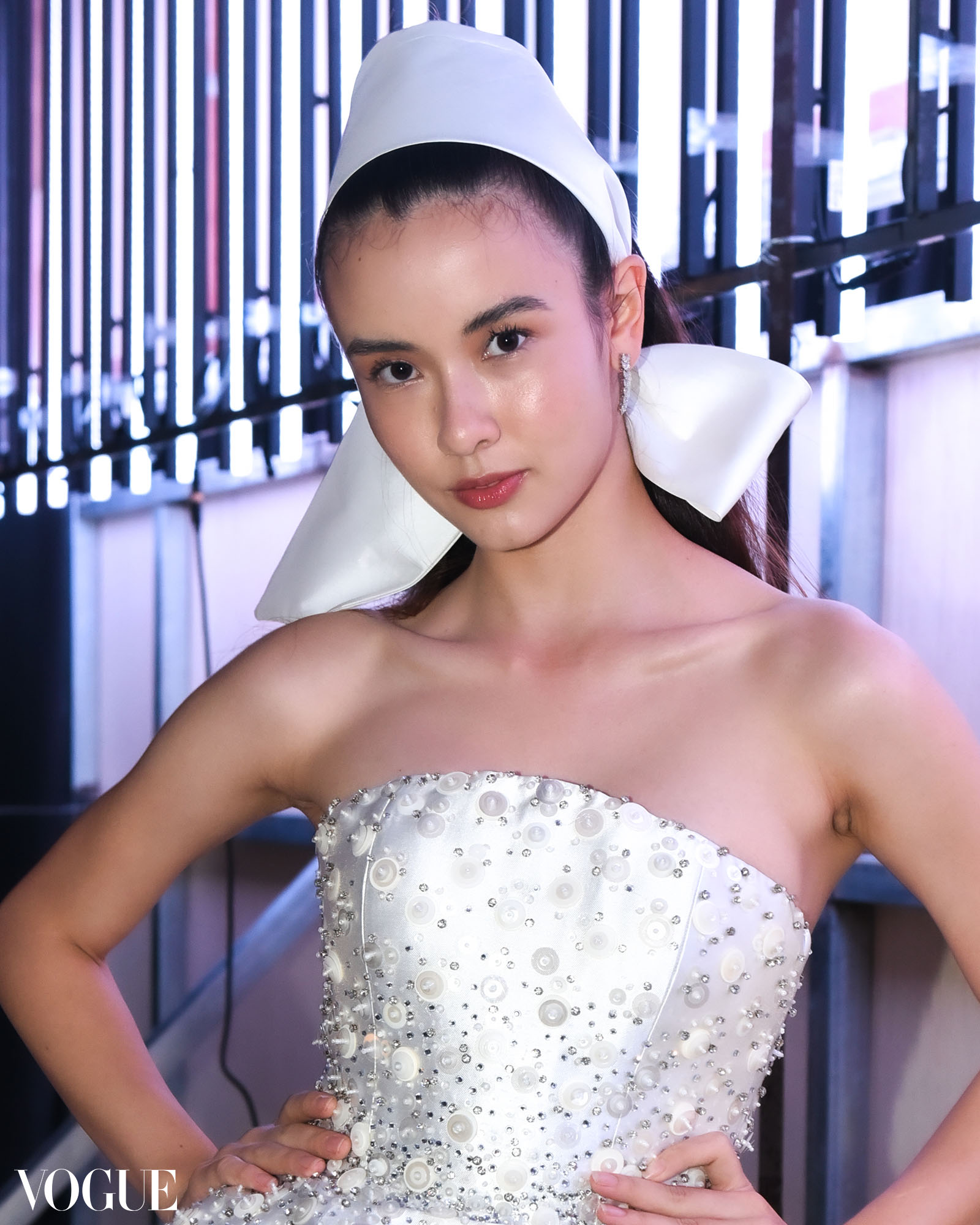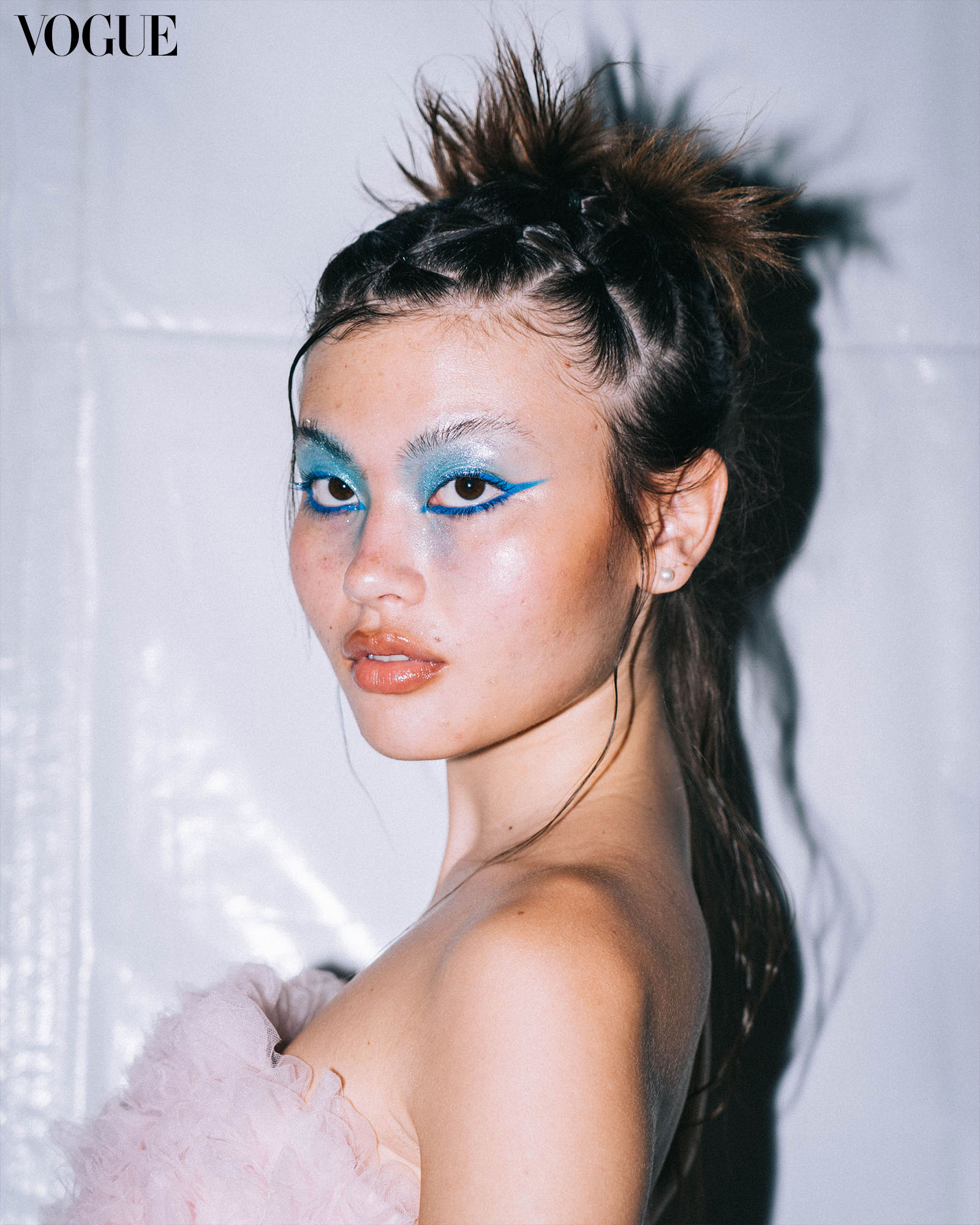 The weather forecast at Antonina showed only cold showers. Weathered hair, dewy skin, and sheer gloss were contrasted by icy accents meant to emulate splashes of water. Metallic icy-white pigment enveloped the eyes, extending into the brow and trickling down to the hollow of the eyes.