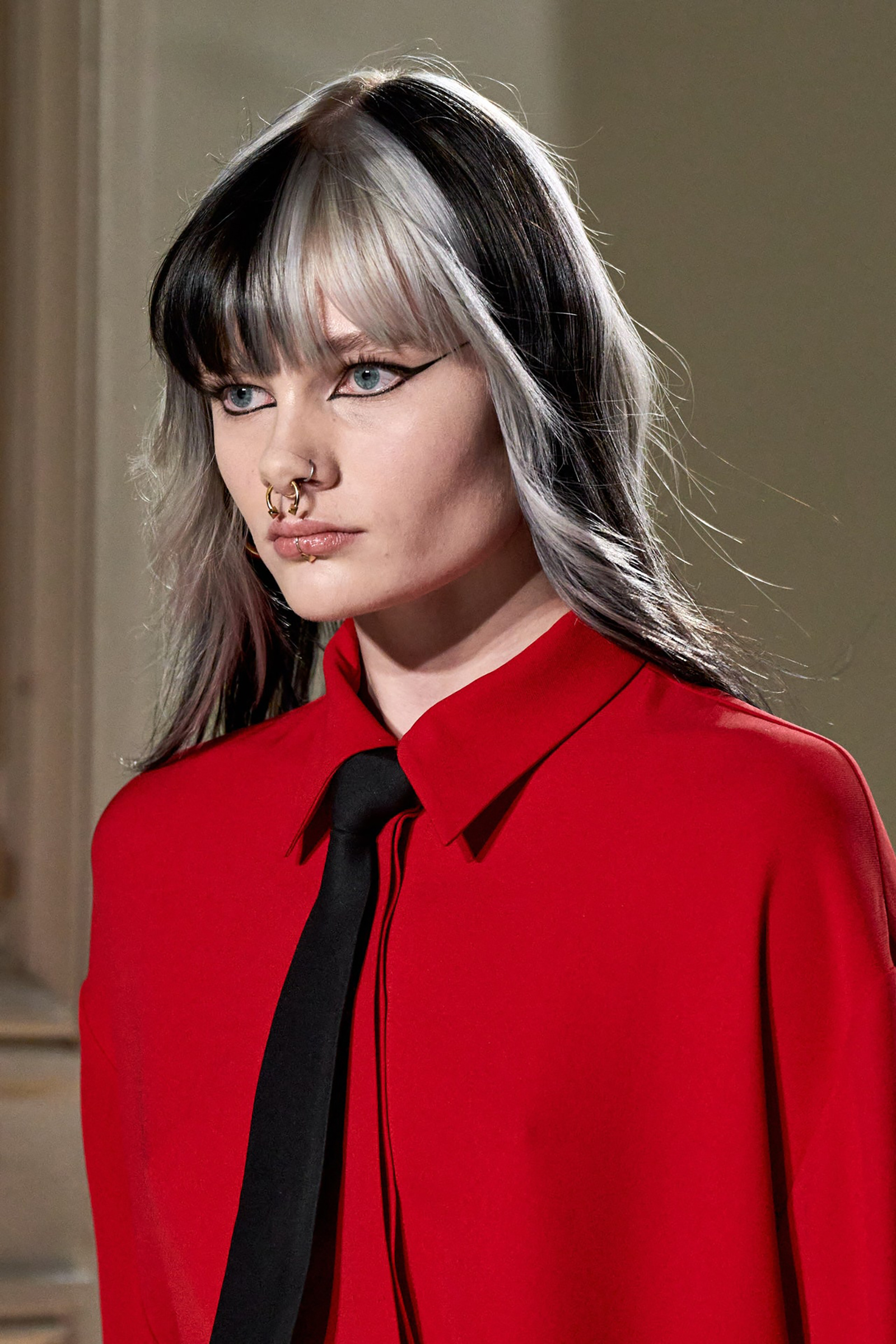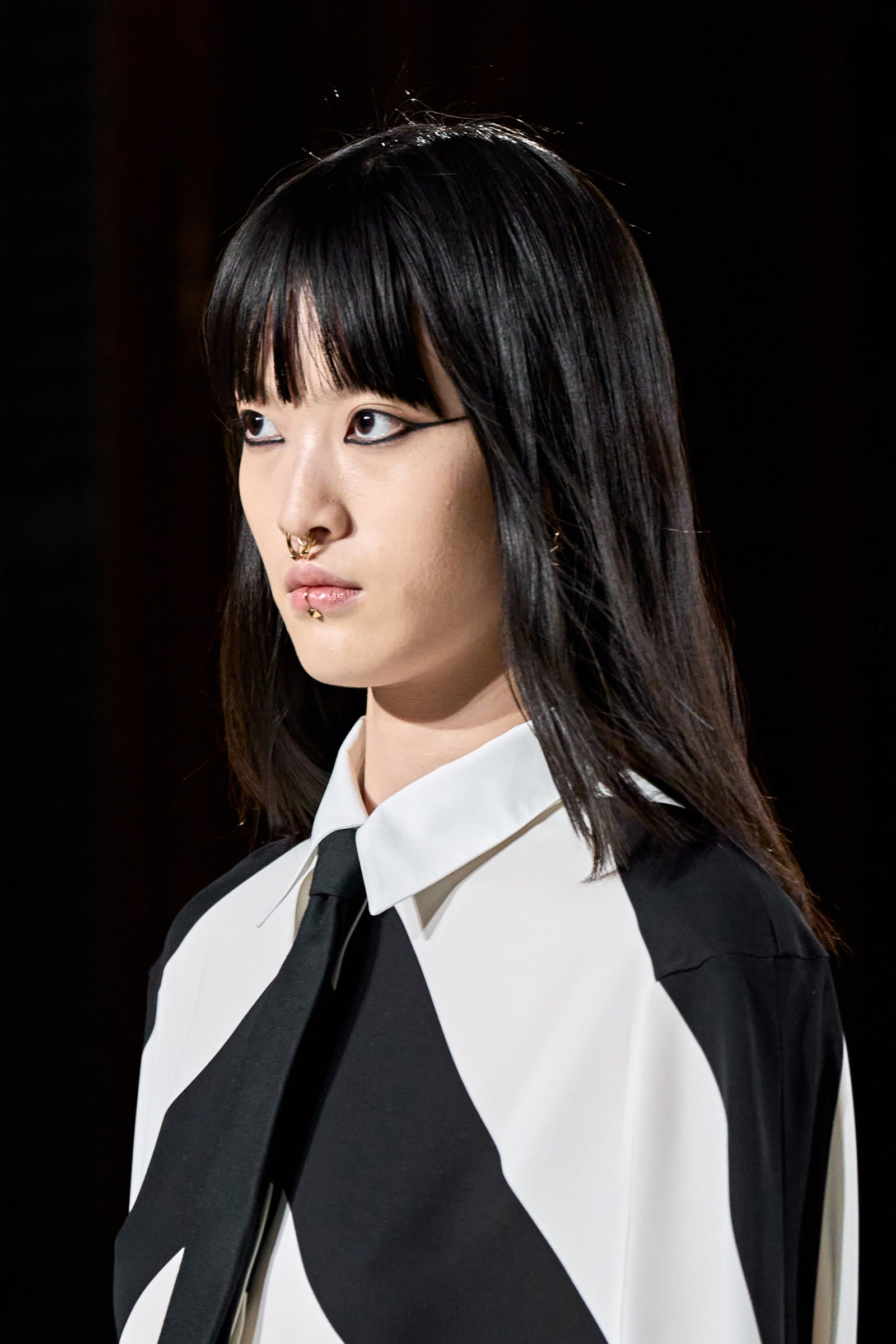 “The inspiration for the makeup was rooted in the collection’s exploration of power,” she tells Vogue. Set against designer Pierpaolo Piccioli’s neo-goth black and white collection, the eye statements were composed of “graphic lines and techniques designed to accentuate each model’s unique eye shape,” she explains. The effect was a dark—even moody—addition to the new wave of goth-y, deconstructed makeup seen this month.