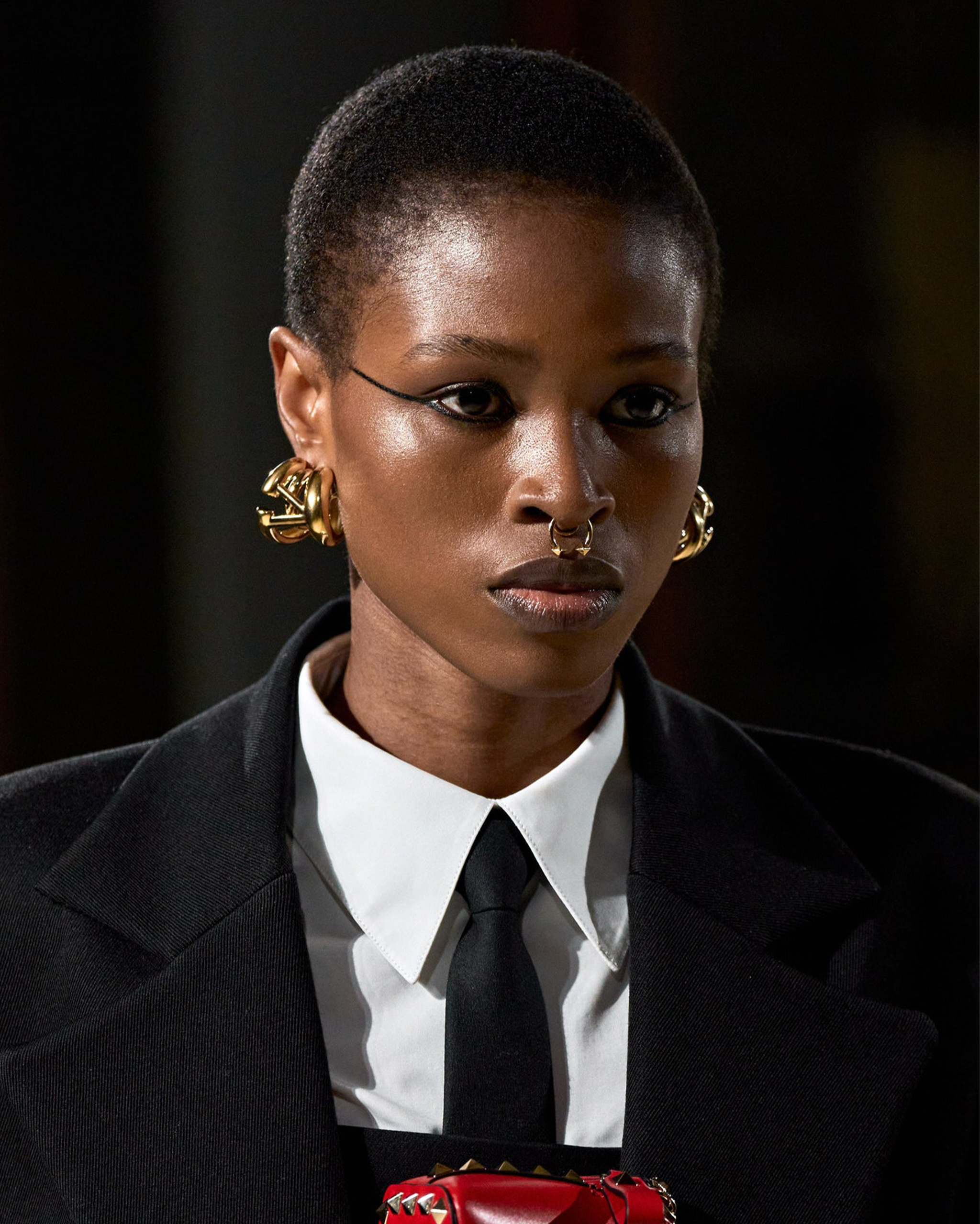 In the spirit of balance, McGrath kept skin fresh to showcase both the bold eye statements and the collection’s lip cuff and nose-jewelry accessories. “Pierpaolo and I were drawn to the idea of celebrating individuality,” McGrath says. “We wanted to create a look that was simultaneously different for each model, yet cohesive as a whole.” Once again, they delivered aspirational beauty to disrupt norms, celebrate identity, and create “an extravagant and immersive experience,” according to McGrath.