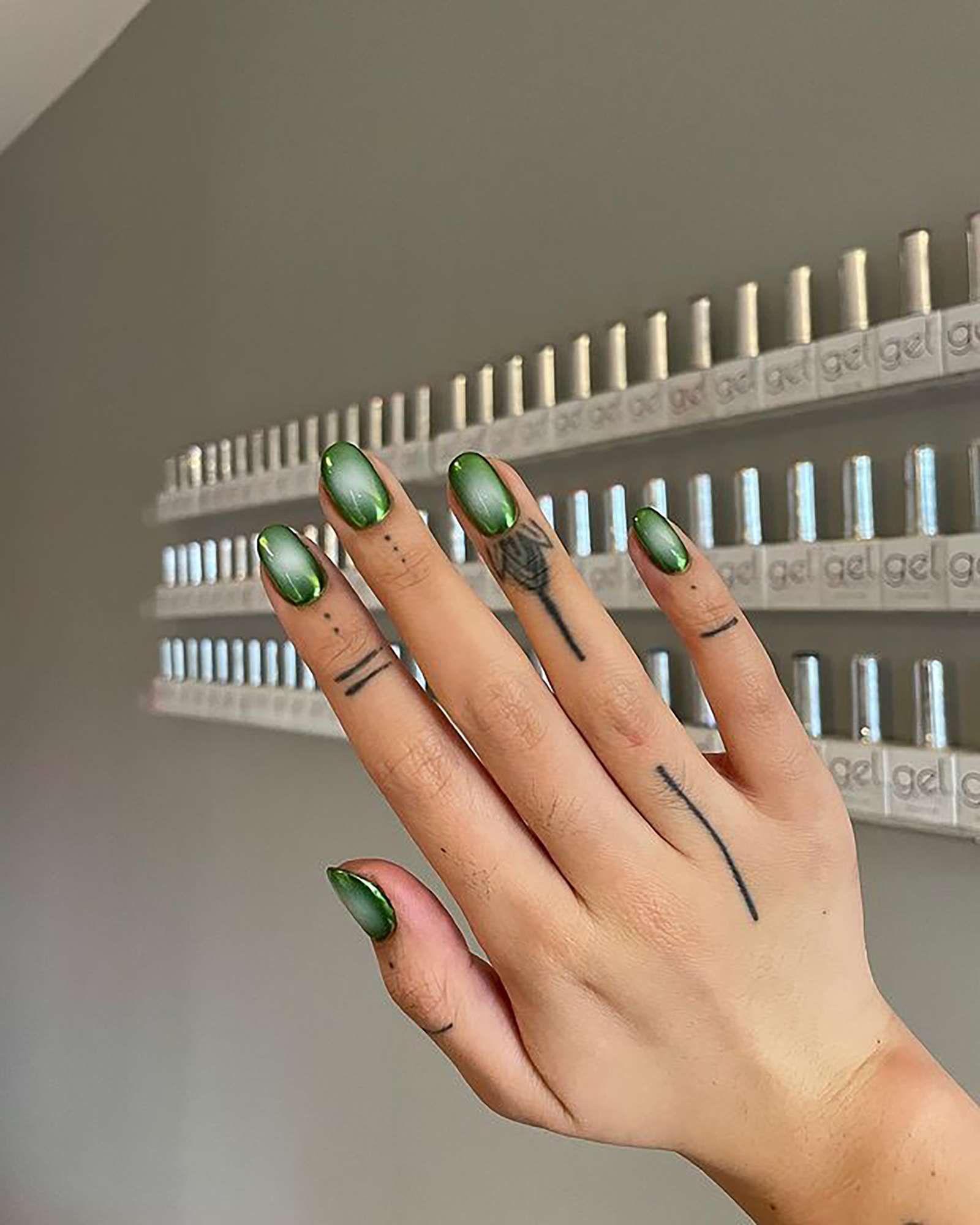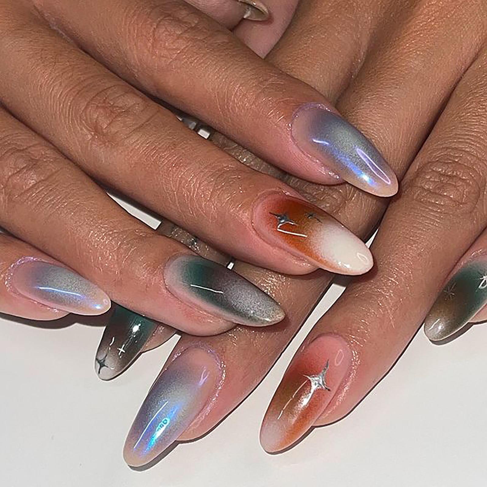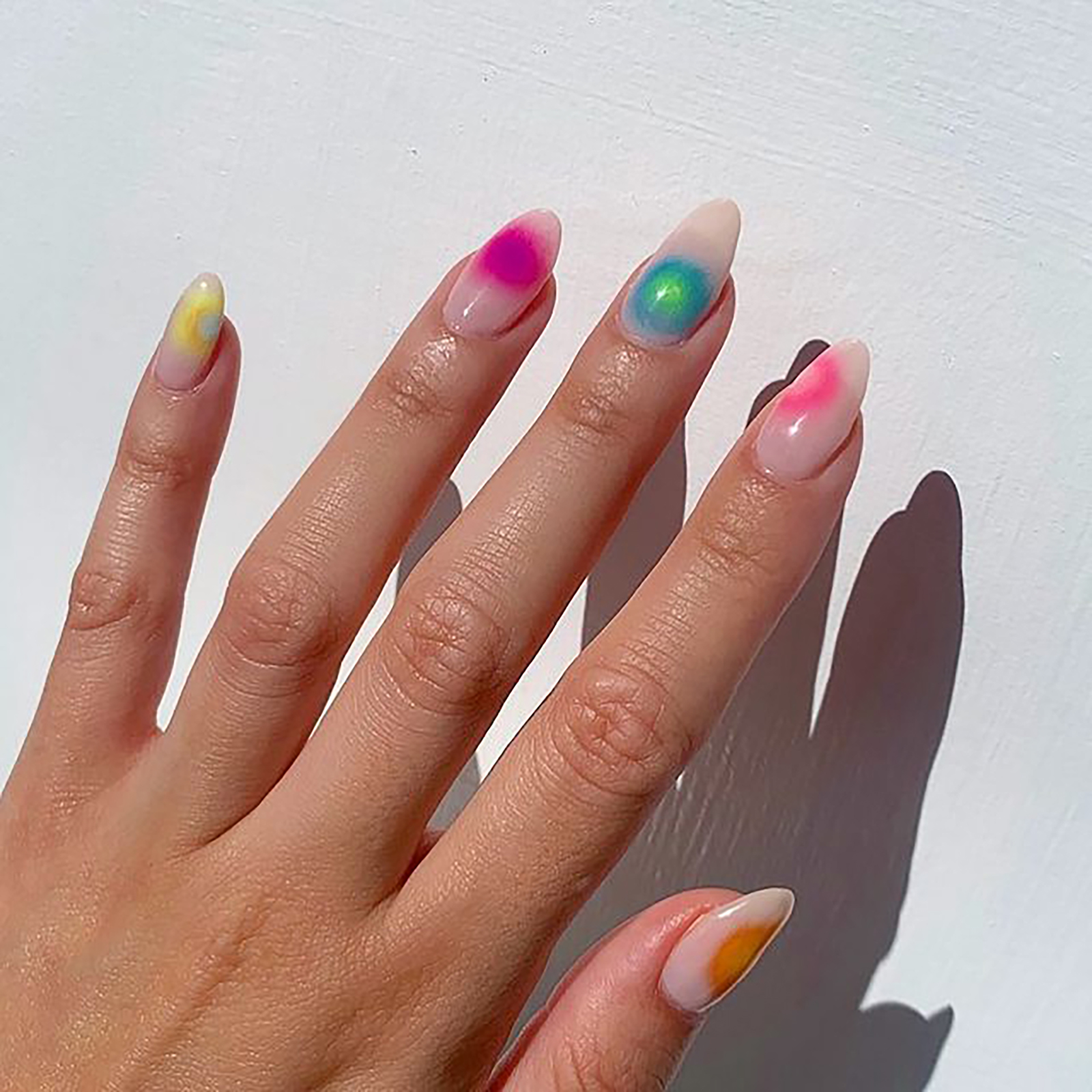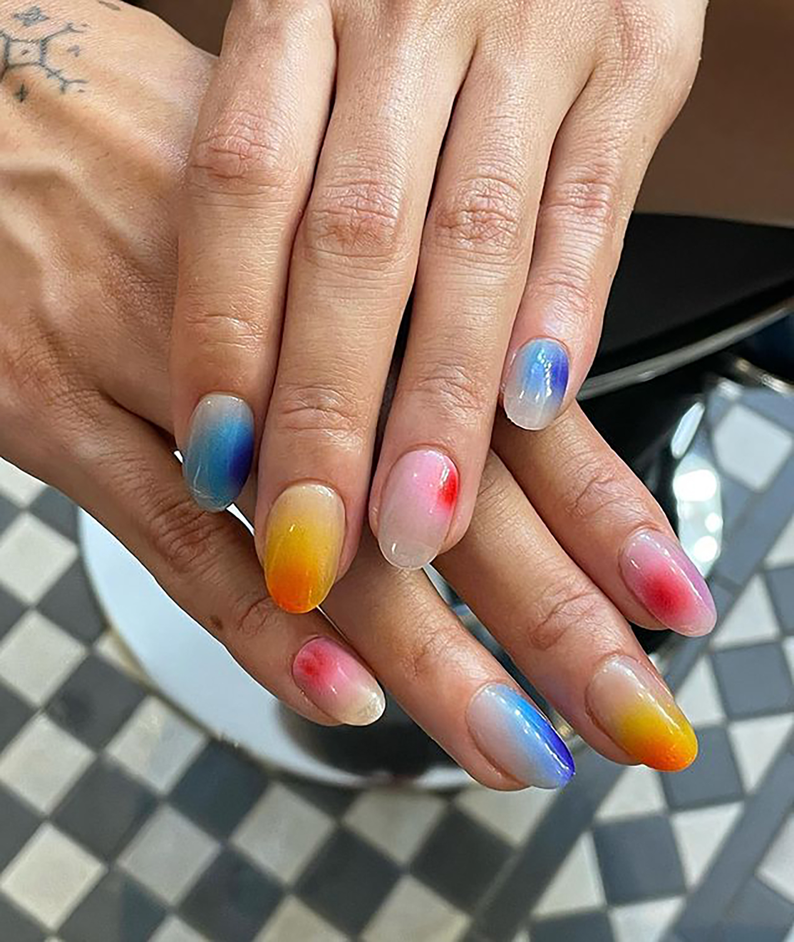 With four billion views on TikTok, aura nails often marry bright rainbow colors with a graduated, spherical design. “While bright colors are best used to create this effect because they stand out, it depends on the spiritual aura of the client – they may want specific colors to reflect how they are feeling,” explains Giorgia Cappella, training and education manager at The Gel Bottle, who says they’ve become increasingly popular. “While some clients want their nails to reflect their current aura, or the one they wish to give off, for others, it’s just a trend they love and like the look of.”