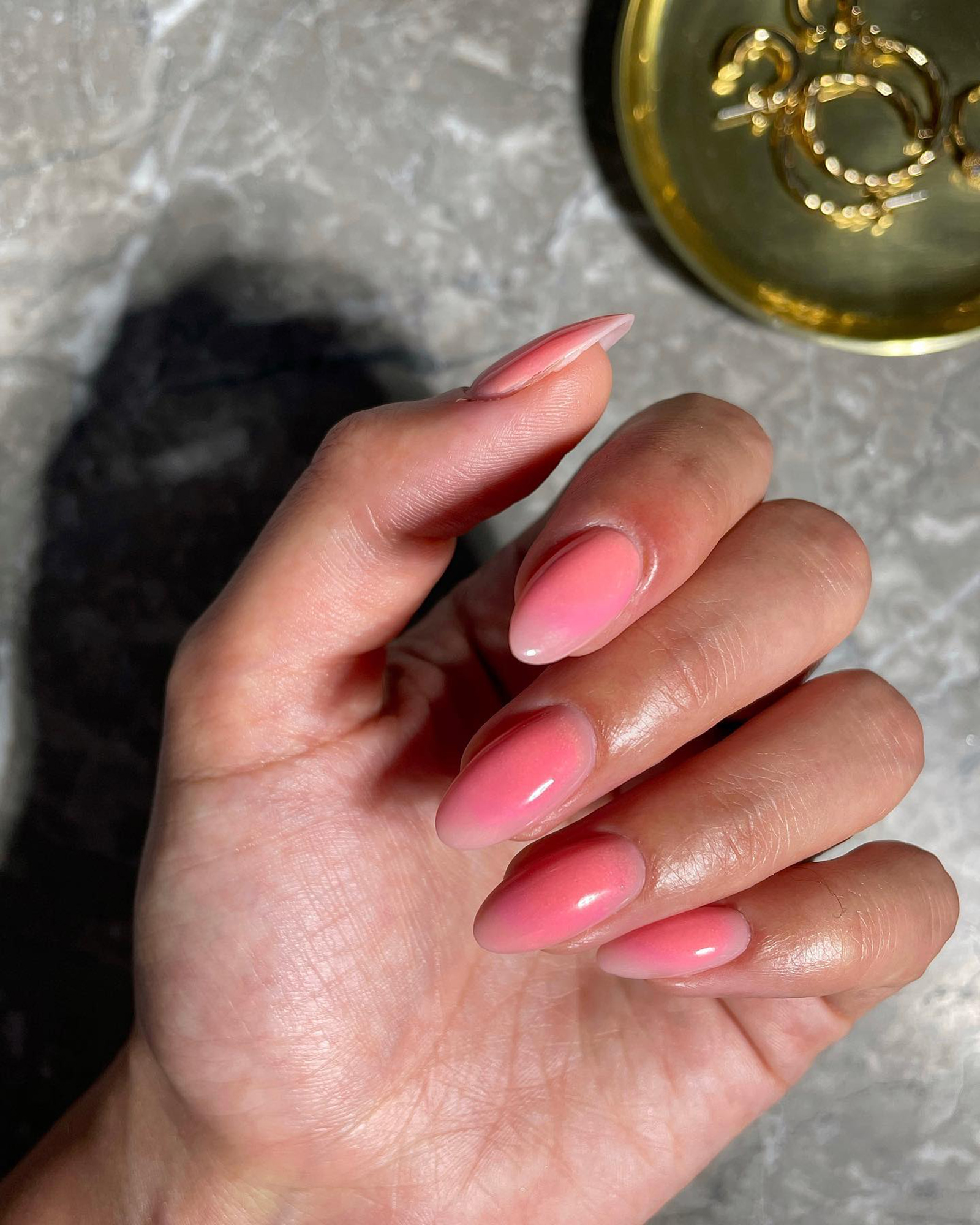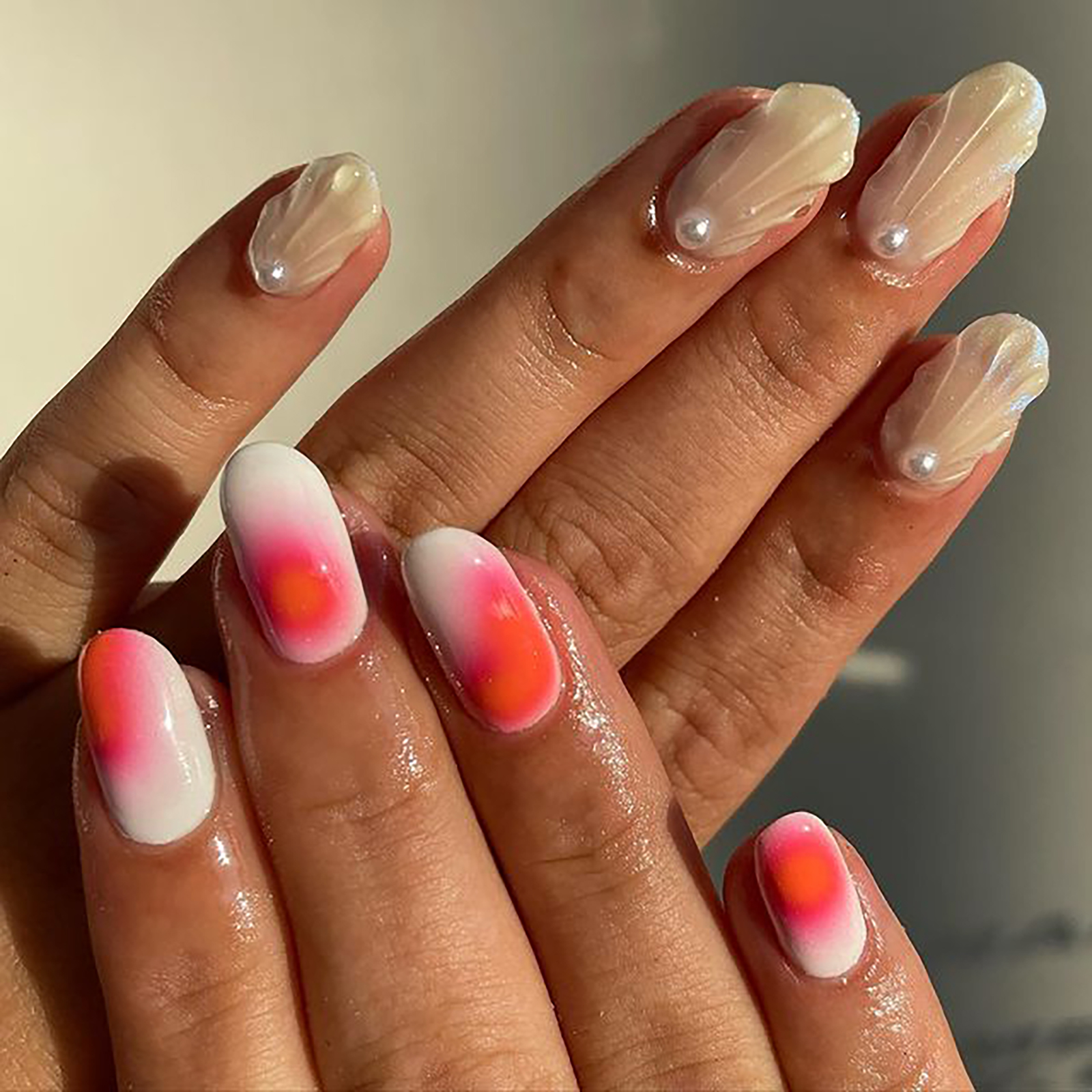 Some aura nails are created using airbrushing tools, but more commonly they’re created by gradually layering different shades and diffusing them onto a base color. “I love to use pink for the outer aura and orange for the center,” says Cappella. “These colors symbolize romance, self-love, confidence, and creativity, and they work beautifully together – both aesthetically and spiritually.”