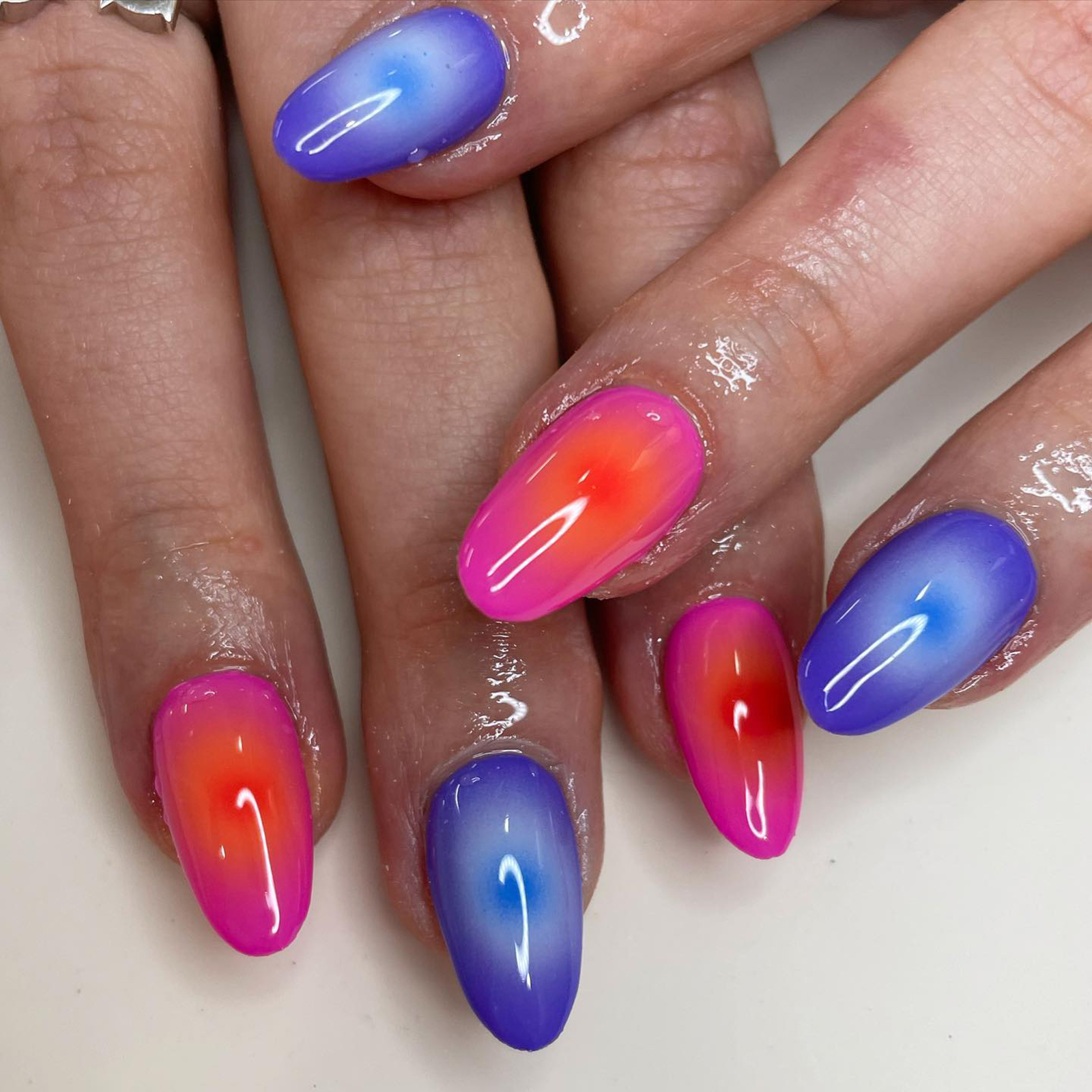 The design works well on all nail shapes, but especially on oval or almond, says Cappella. “The added length and tapered edge help to create the circular effect of an aura,” she adds. “It’s a bit trickier with square shapes.” Like sunsets on your fingertips – and a stellar way to help you manifest the mood you want—below, find some aura nails inspiration.