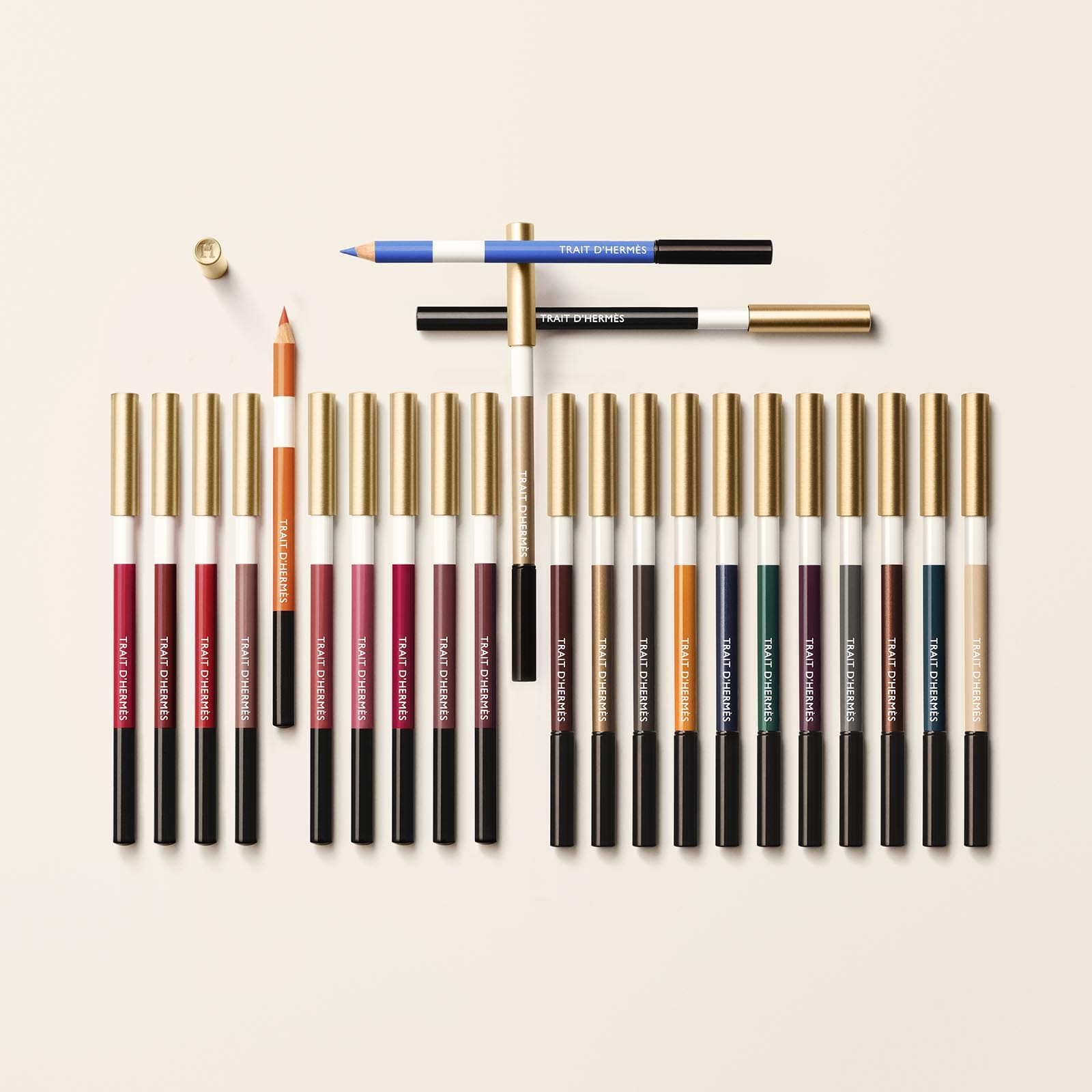 “When we apply color to our faces—to the eyes or anywhere else—we are, above all, accepting an invitation to show our feelings, our state of mind and especially our emotions,” says Gregoris Pyrrpylis, creative director of Hermès Beauty. With this in mind, Hermès launched its Trait d’Hermès collection last month, a selection of forty shades for the eyes and lips in the form of pencils.