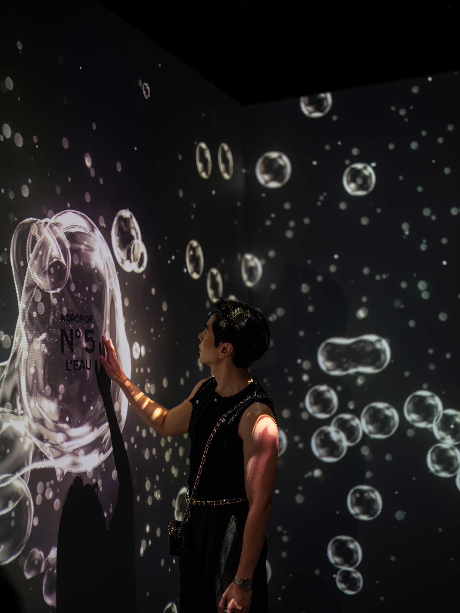 To launch the new perfume, the Chanel No. 5 L’Eau Drop event invited publishers, content creators, celebrities, and house ambassadors to an immersive experience that takes them on an emotional journey. Each chapter of the journey centers on an emotion: mystery, bravery, love, desire, and joy, with installations such as a rain wall, a steamed mirror, a room full of desirable objects, and an interactive room where guests’ movements animate the space.