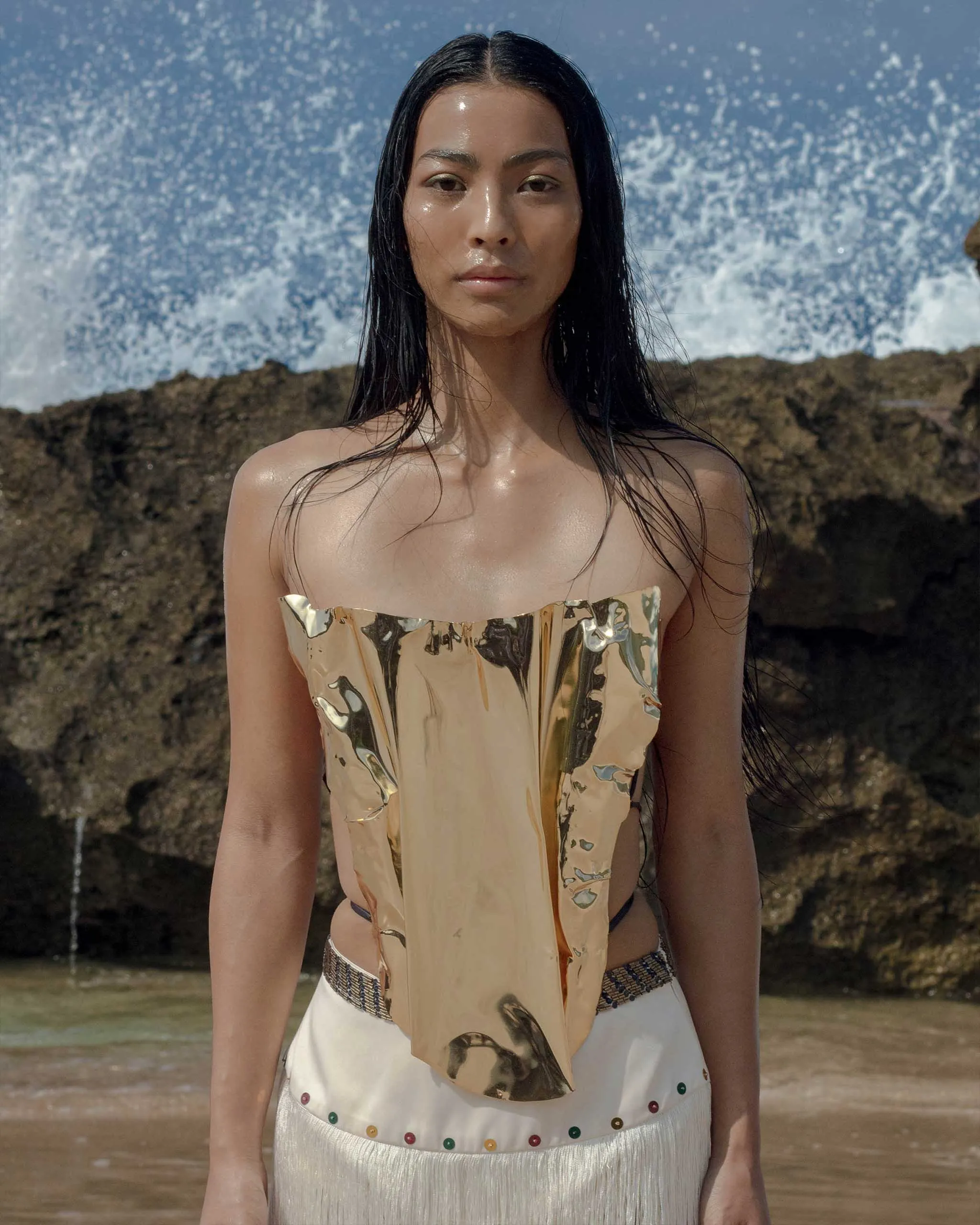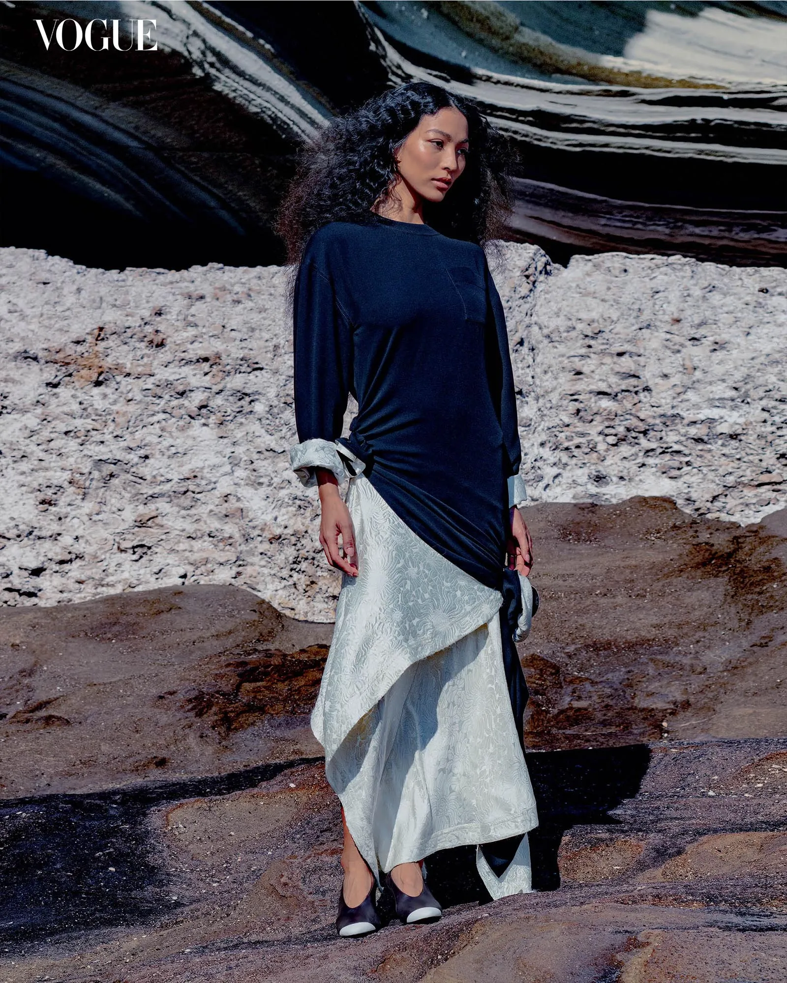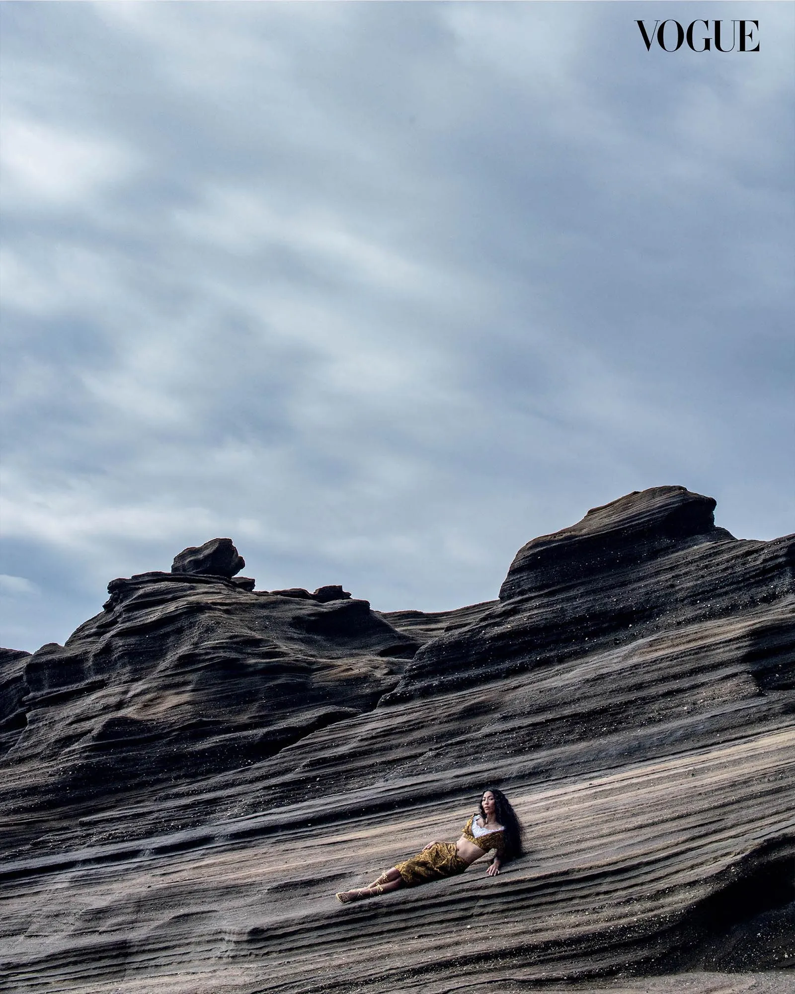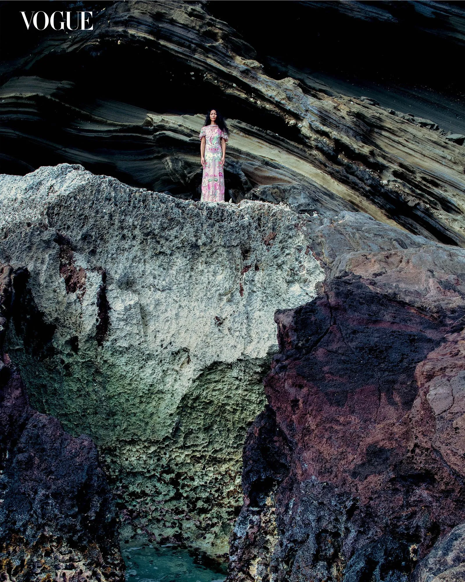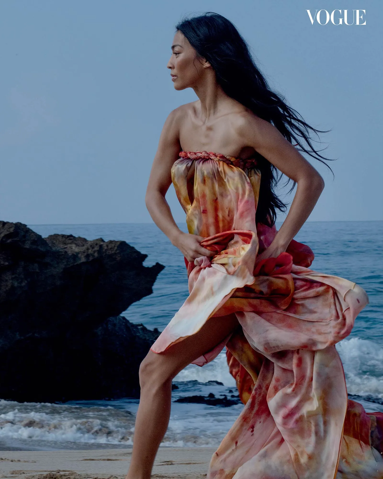 The shoot took place across several locations in Hawaii, including a cliff overlooking the ocean, a jungle stream near a waterfall, and a beach close to her home. At one point, she found herself hiking down a steep trail in full glam. “I was literally in full haute couture hiking down a mountain,” she laughs. The wardrobe featured a global range of designers, from Chanel to Zimmermann and Temperley London, alongside Asian designers like Shushu/Tong, and Vaishali, selected by the styling team.