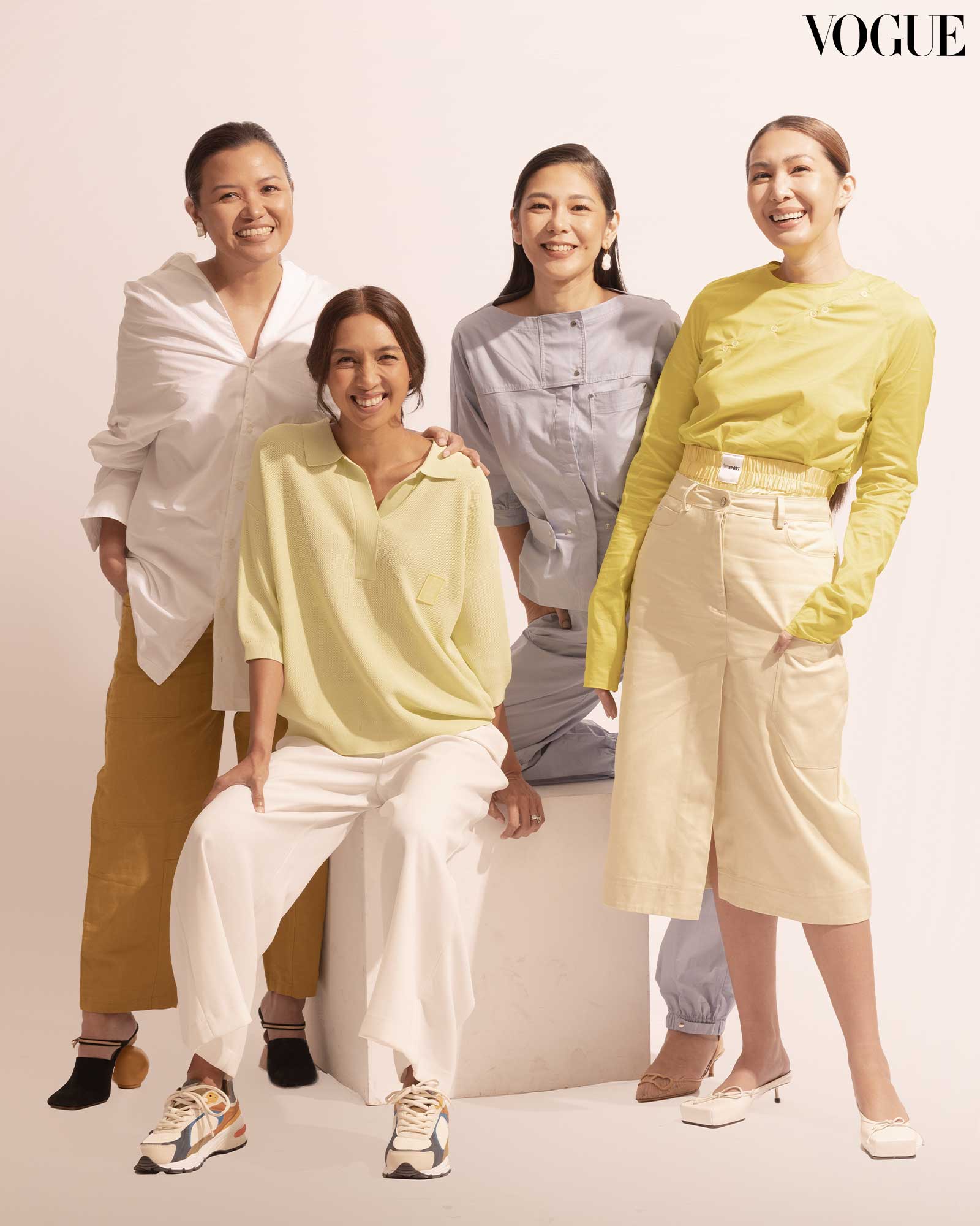 From left: Alex wears a HARLAN+HOLDEN shirt, Karina wears a COPERNI shirt, HARLAN+HOLDEN trousers, JACQUEMUS shoes, PRANCA earrings, Steph wears a GANNI top, OPÉRASPORT shorts, HARLAN+HOLDEN skirt, JACQUEMUS shoes, Kim wears a HARLAN+HOLDEN top and trousers, PRANCA earrings. Photo by Erwin Canlas
