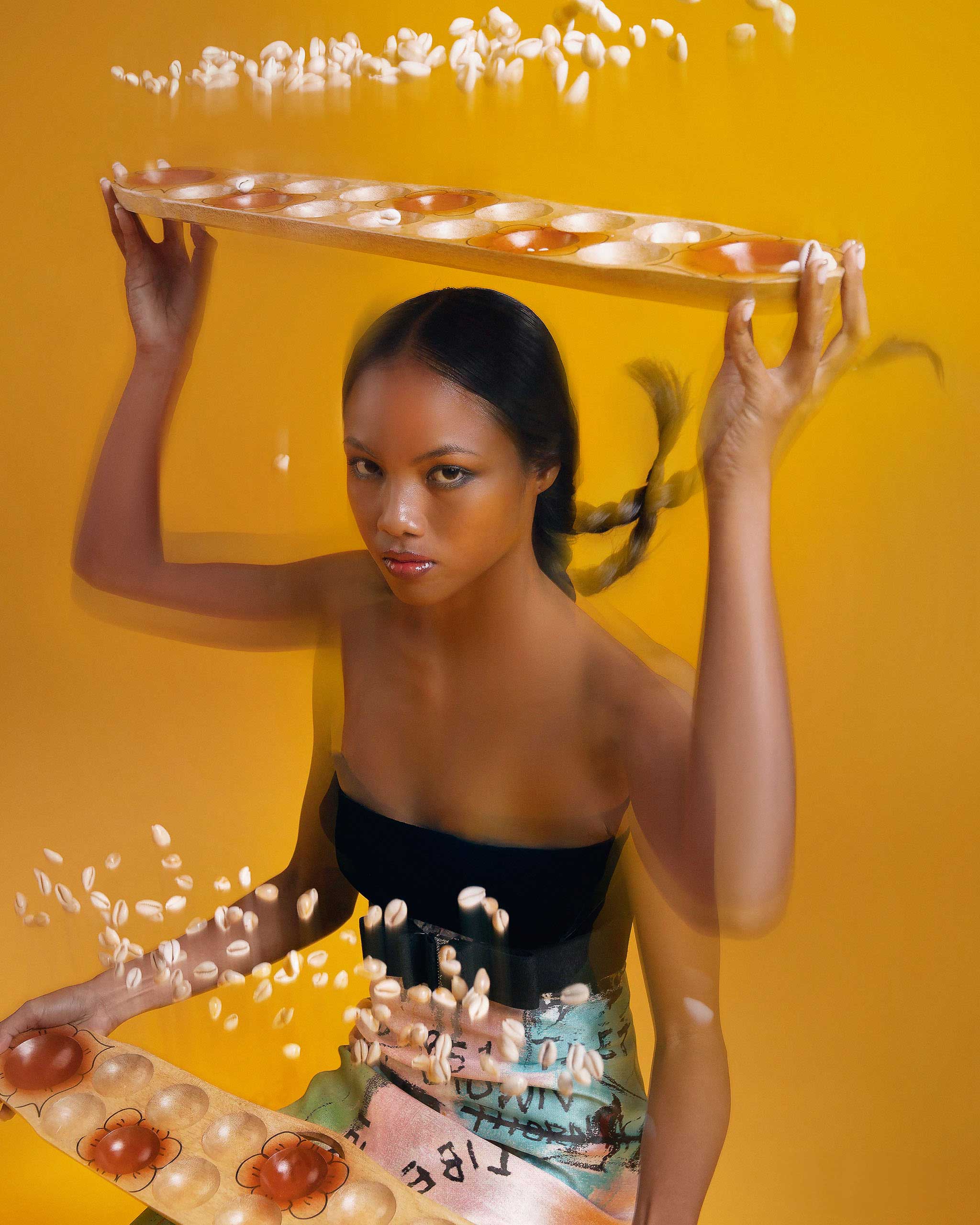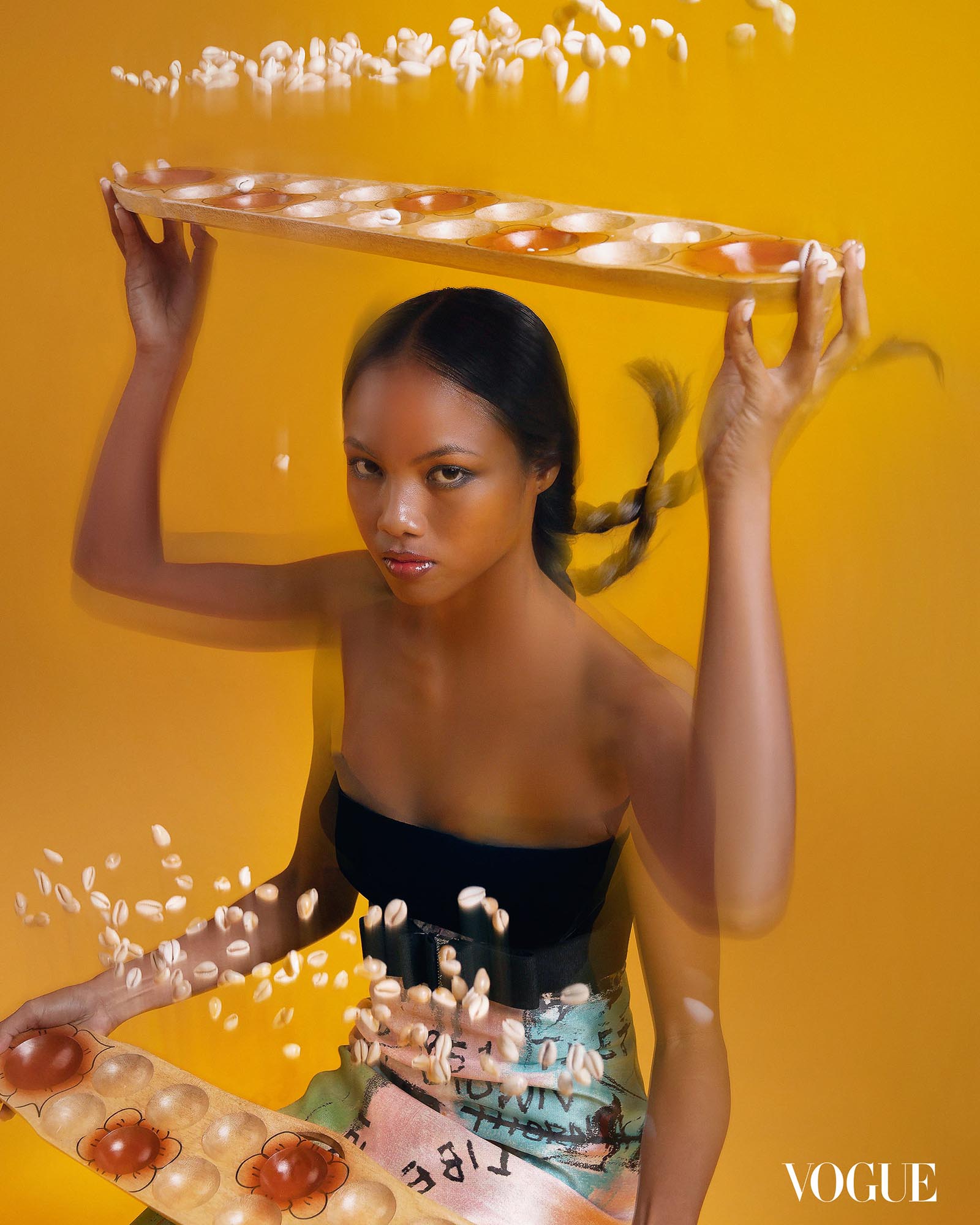 Sungka is a traditional two-player Filipino board game played on a boat-shaped wooden board with seven small pits on each side and two larger ones at the ends, called the head or ulo. Players take turns distributing the playing pieces (normally shells or pebbles) around the board, aiming to collect the most in their designated head pit. Naya wears archival VALENTINO dress. Photographed by Chiron Duong for the March 2025 Issue of Vogue Philippines