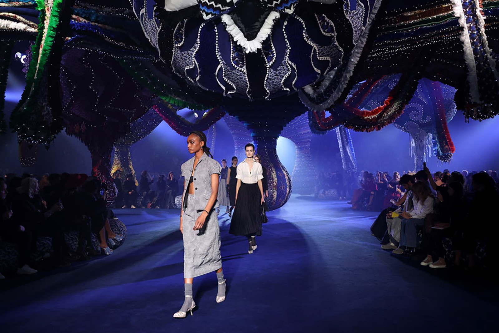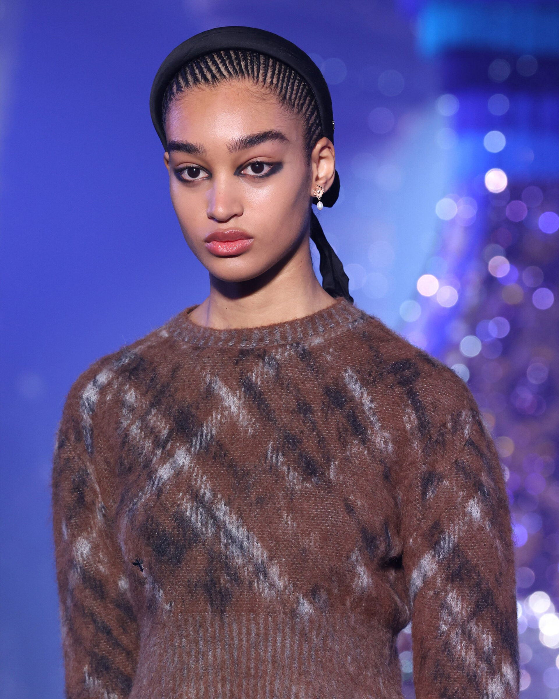 Hairstylist (and Vogue’s contributing beauty editor) Guido Palau created hair that was “punky in a way that’s kind of dishevelled”. “A lot of the girls have got a very simple ponytail that’s pulled back from the face,” he said. “I used Oribe’s volumising Maximista Thickening Spray to blow hair into the ponytail. They’re wearing a beautiful Dior headband, which has a crinkled ribbon attached to it.” Those with textured hair have fine, slightly angled braids. “It’s a very Maria Grazia idea of beauty,” Palau concludes. “Simplistic, but embraces personality.”