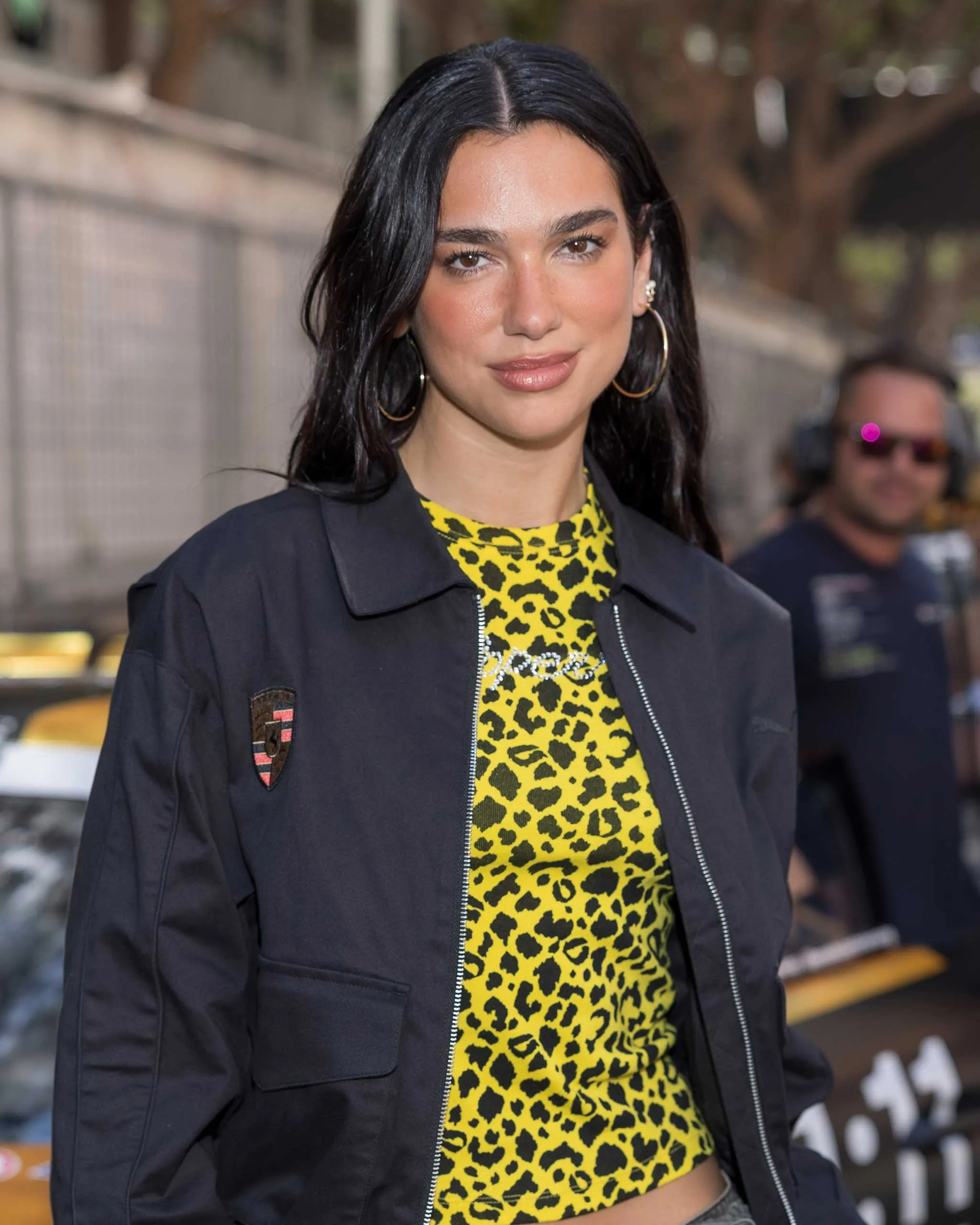 The pop star was photographed at the 2025 F1 Grand Prix Of Monaco in Monte-Carlo, touring the pit lanes and posing with racers on the grounds. She kept her overall look pretty casual—a bold yellow cheetah print cropped t-shirt from Coperni and black, loose-fitting jeans, and black and white Puma Speedcat sneakers. Her glam, too, was parred back and warm weather appropriate; with minimal eye makeup, a glossy caramel lip, and blossoming, warm pink blush. She wore her signature, raven-dark hair long and loose.