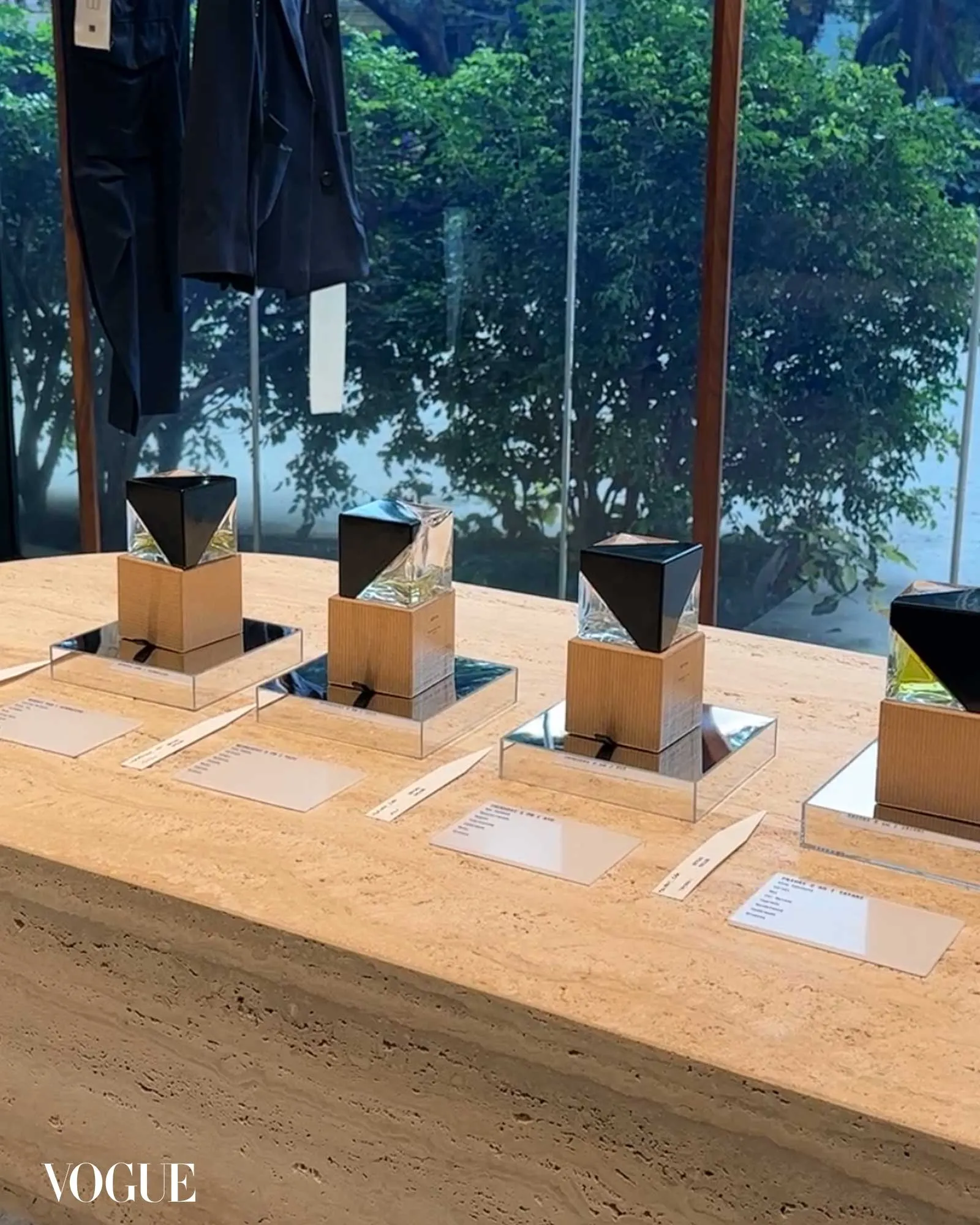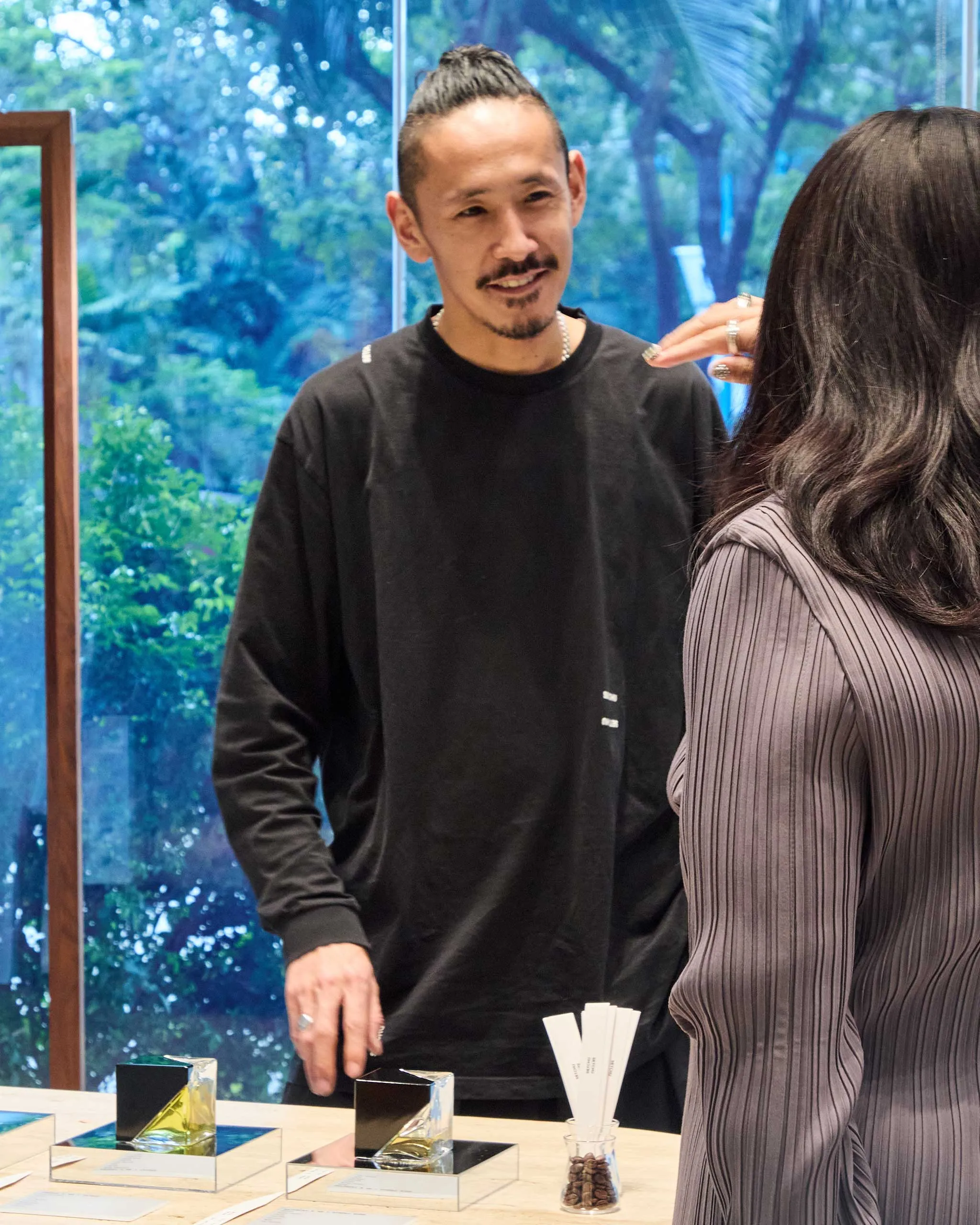 “First one is a Japanese green tea called Genmaicha. Genmai is rice, and that’s the top note. And then the bottom note is Western tea,” Kuwata explains during an in-store presentation of his collection. “So first you spray, you can smell the burnt rice smell. I said burnt because sometimes people think it’s negative, but we made it something with an interesting smell.”