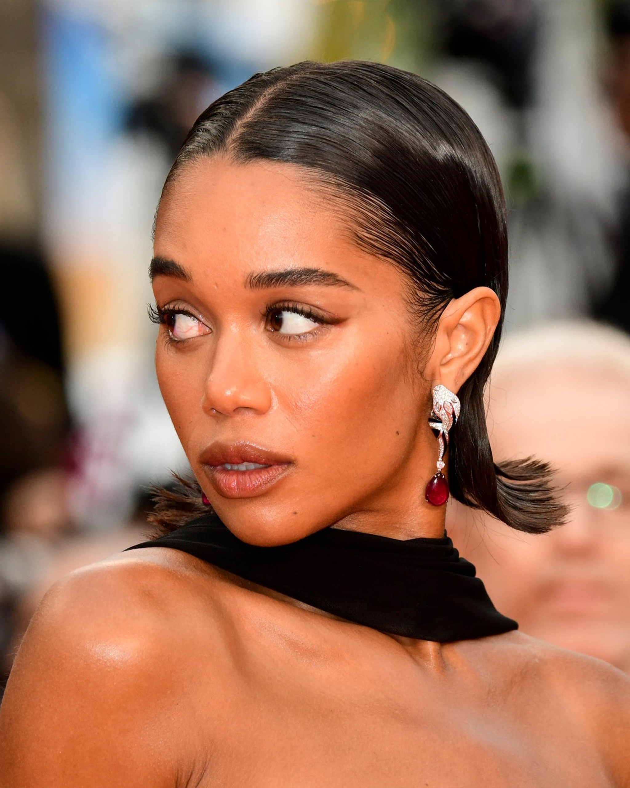 “This shape has become a staple for Laura and I in our collaboration,” says Redway, adding that she loves referencing classic Hollywood-inspired hairstyles on the red carpet. “The flip is inspired by versions worn in the ’60s that keep getting reinvented over time; in the ’90s, then the rebirth we are seeing now.” She points to the look as an “elegant way” to accent bare shoulders and has been workshopping iterations “with modern flairs like kiss curls, strong finishings, and dramatic, graphic angles.” Though for a star roaming La Croisette surrounded by paparazzi, Harrier’s easy Cannes version has its own appeal : “It looks amazing as a side profile,” Redway says. All the better for pretending you don’t notice the attention.