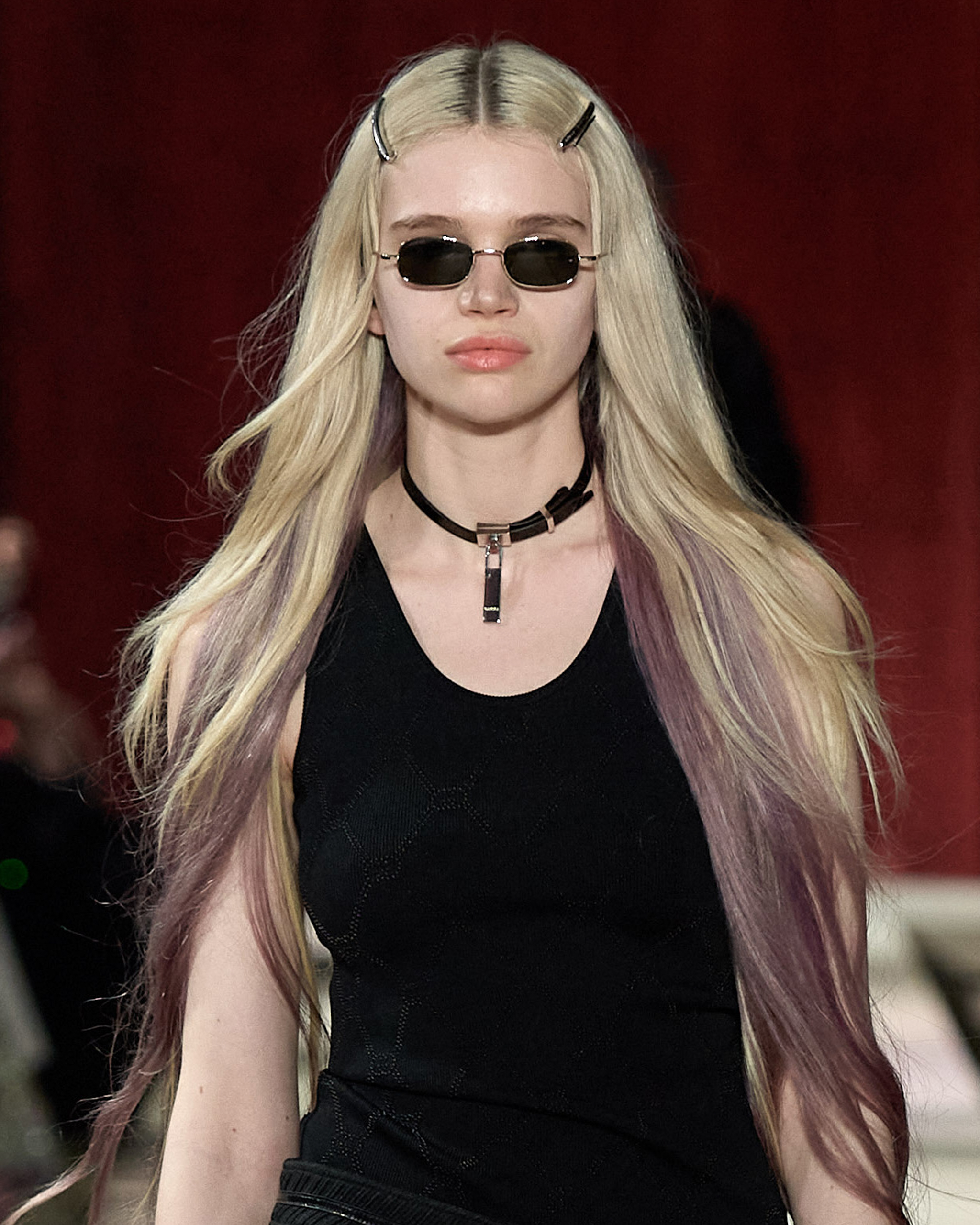 Model Sora Choi opened the show, her raven lengths straight and loose save for her bangs, worn swept (read: plastered) across her forehead as if she had just emerged from a riot of waves. City streets continued to wind toward Venice Beach with mussed micro-fringe, brushed waves, and sunglasses donned over hair like above-water goggles, arms slung over surfboards helping to cement the styling. Among our favorites? Waist-reaching peroxide featuring an underpinning of deep and muted lavender, the shade perfectly coordinated with a pair of purple patent leather boots.