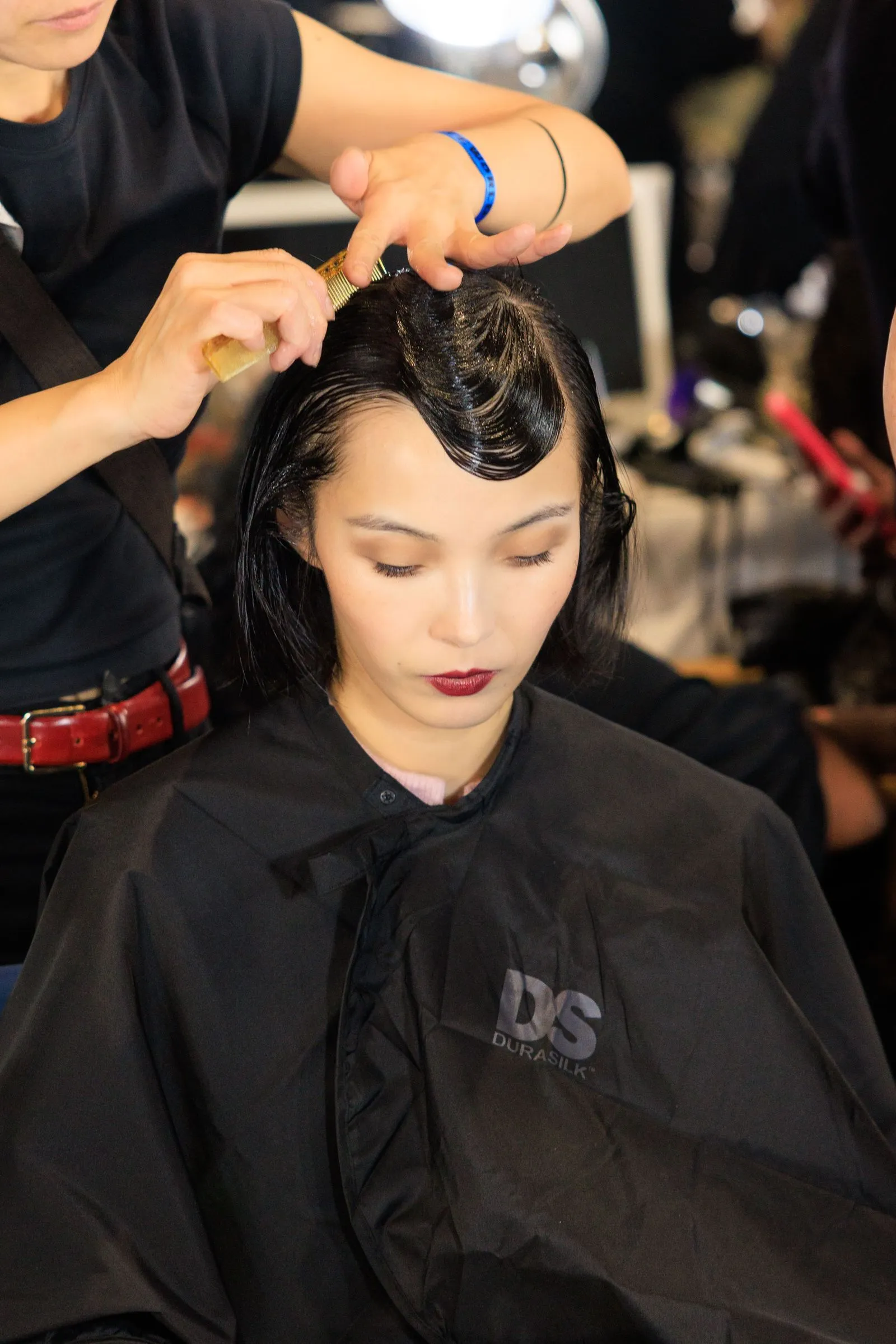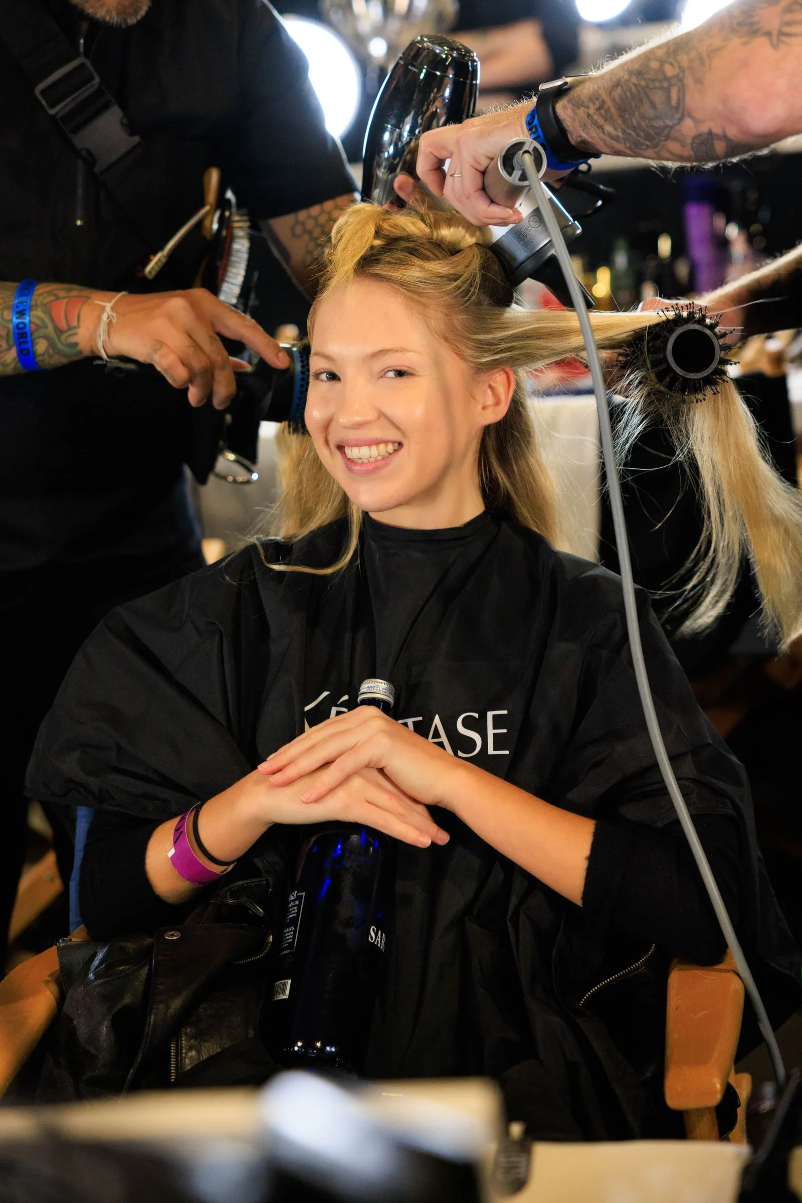 Backstage, puffs of VIP Strong Hold Texturizing Hair Spray filled the air while creaseless clips set curls and baby hairs into place. Silver foxes Kyle MacLachlan and Jeff Goldblum—two surprise talents for the night—were seated across from each other in the hair section (the last time the duo walked together it was at fall 2022 menswear) and it took two people spritizing Lila Moss’s hair with Genesis Heat Protecting Leave-In Treatment and round brushes to transform her into a Summer of Love hippie.