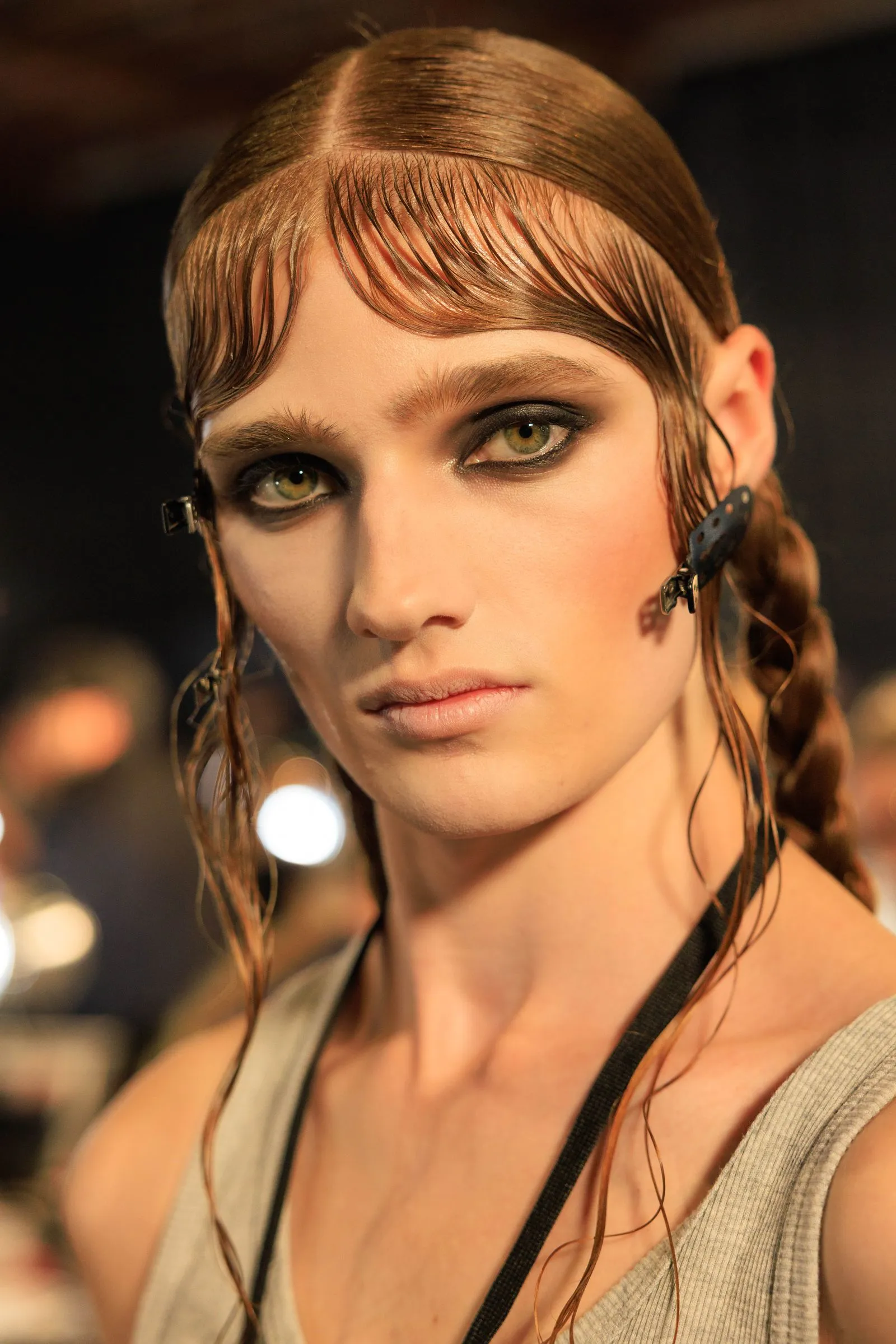 The punks are having fun—especially when it comes to glam. The film included Tim Burton’s Edward Scissorhands (seen on model Anok Yai) and Alice in Wonderland (worn by actor Kodi Smit-McPhee)—so there’s something playful about it all, too. Gabbriette, Colin Jones, Amelia Grey, and Alva Claire all had different variations on the punk theme: “There were braids, messy waves, a mohawk mullet, and an undone wig wrap completed with Bobby pins. It’s all meant to be a bit messy.”