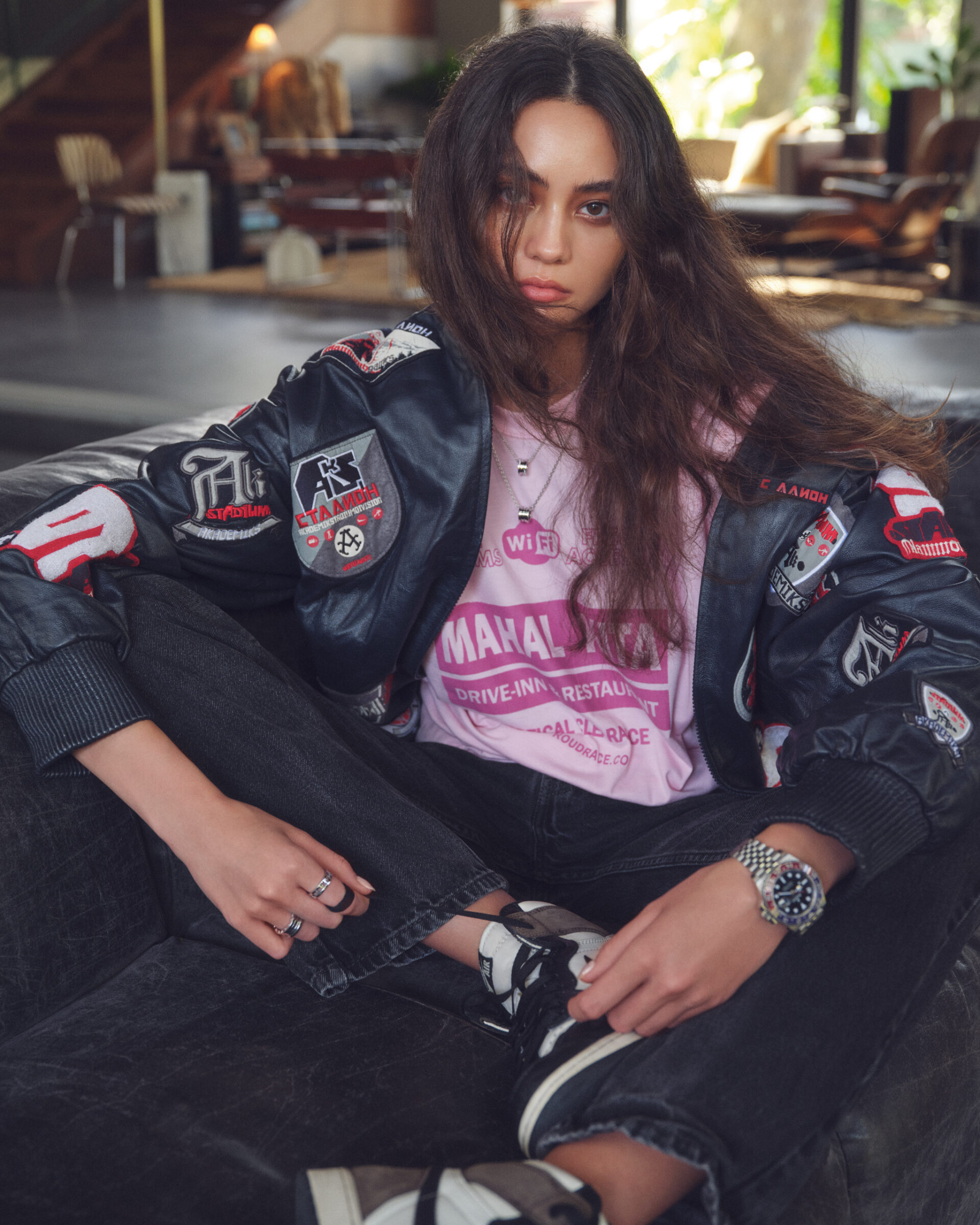 Daniela wears IT’S VINTAGE leather bomber jacket with embroidered patches, vintage LEVI’S dark wash denim trousers, PROUDRACE Mahal Kita shirt, NIKE Jordan 1 in Dark Mocha, BULGARI B.ZERO1 necklace in white gold. Photo by Sharif Hamza