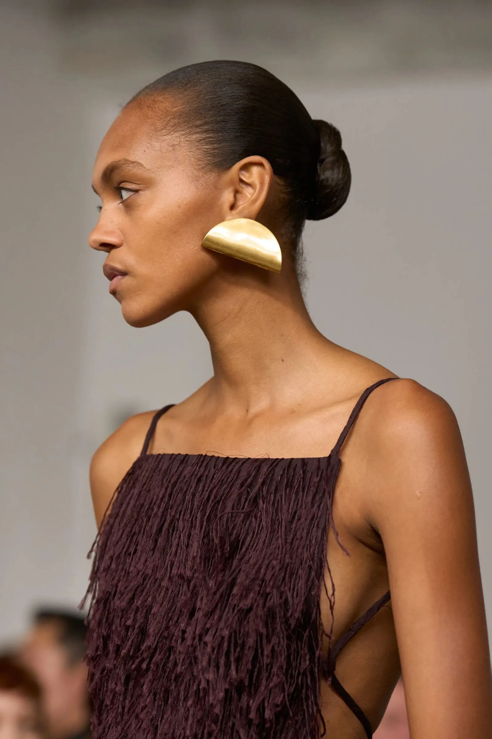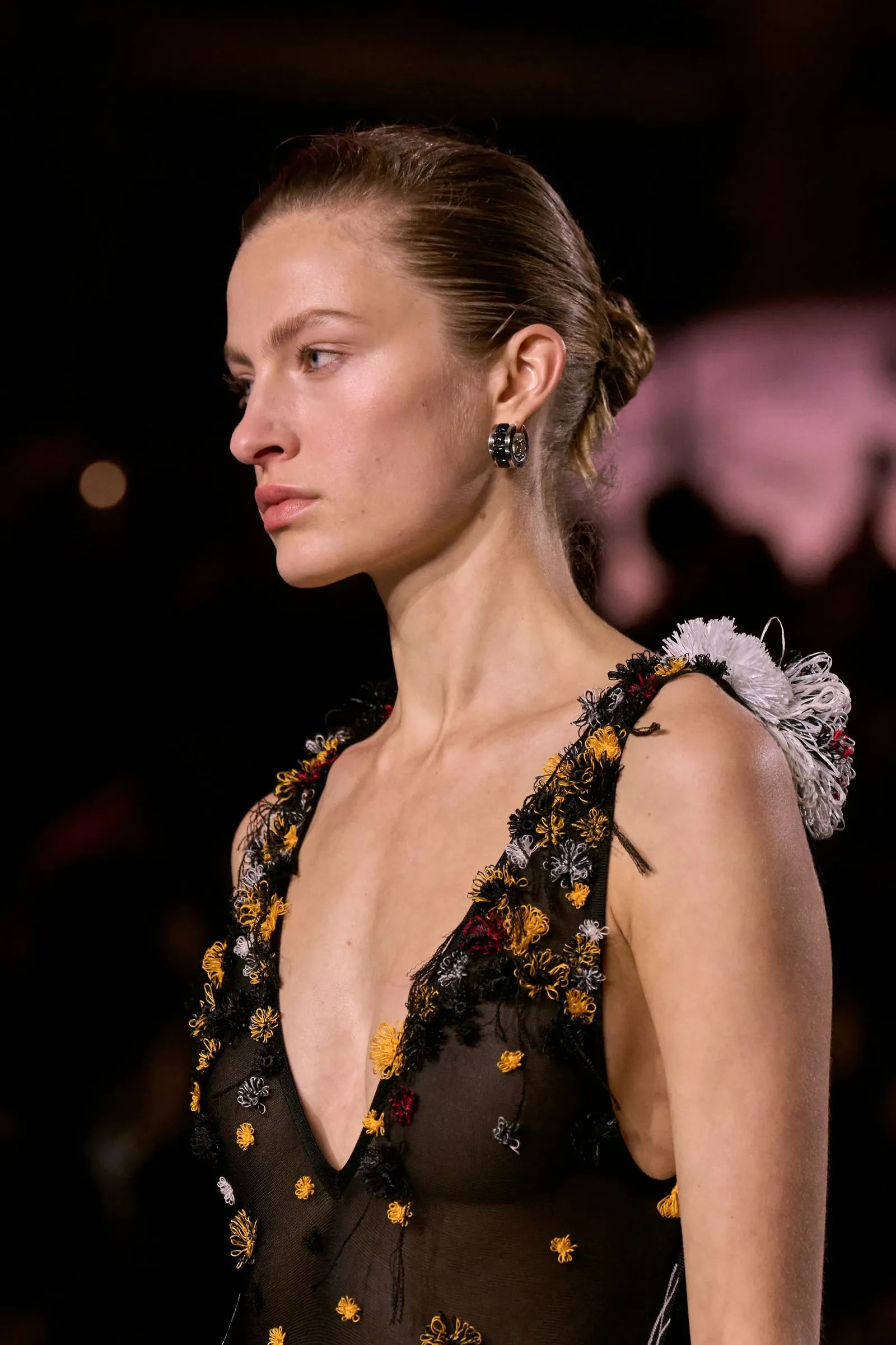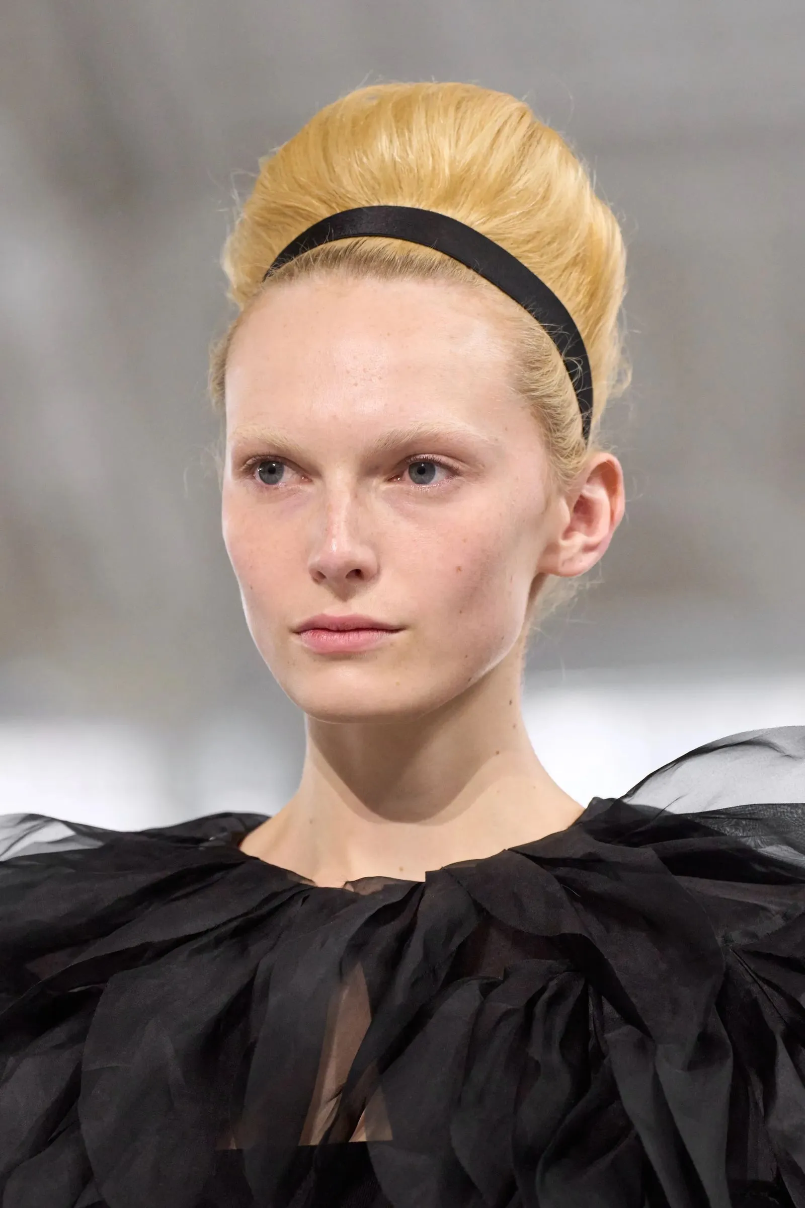 Max Mara’s black hair ribbons injected some playful ’60s energy into an otherwise low-key hairstyle. Seen here on model Alex Consani, it’s a retro slant that can be fun to play with.
