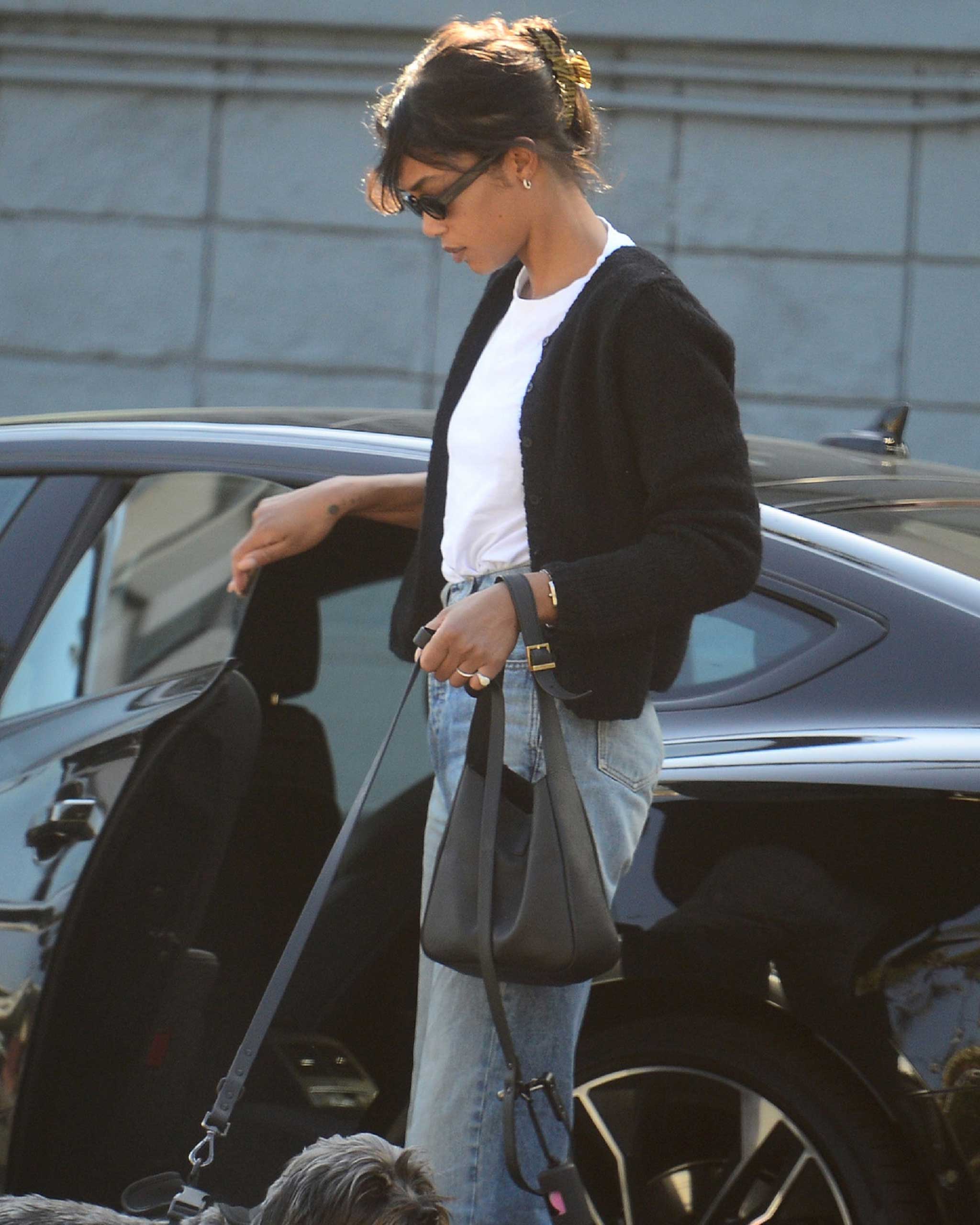 Laura Harrier’s curtain bangs work just as well when she wears her hair up as down. MEGA
