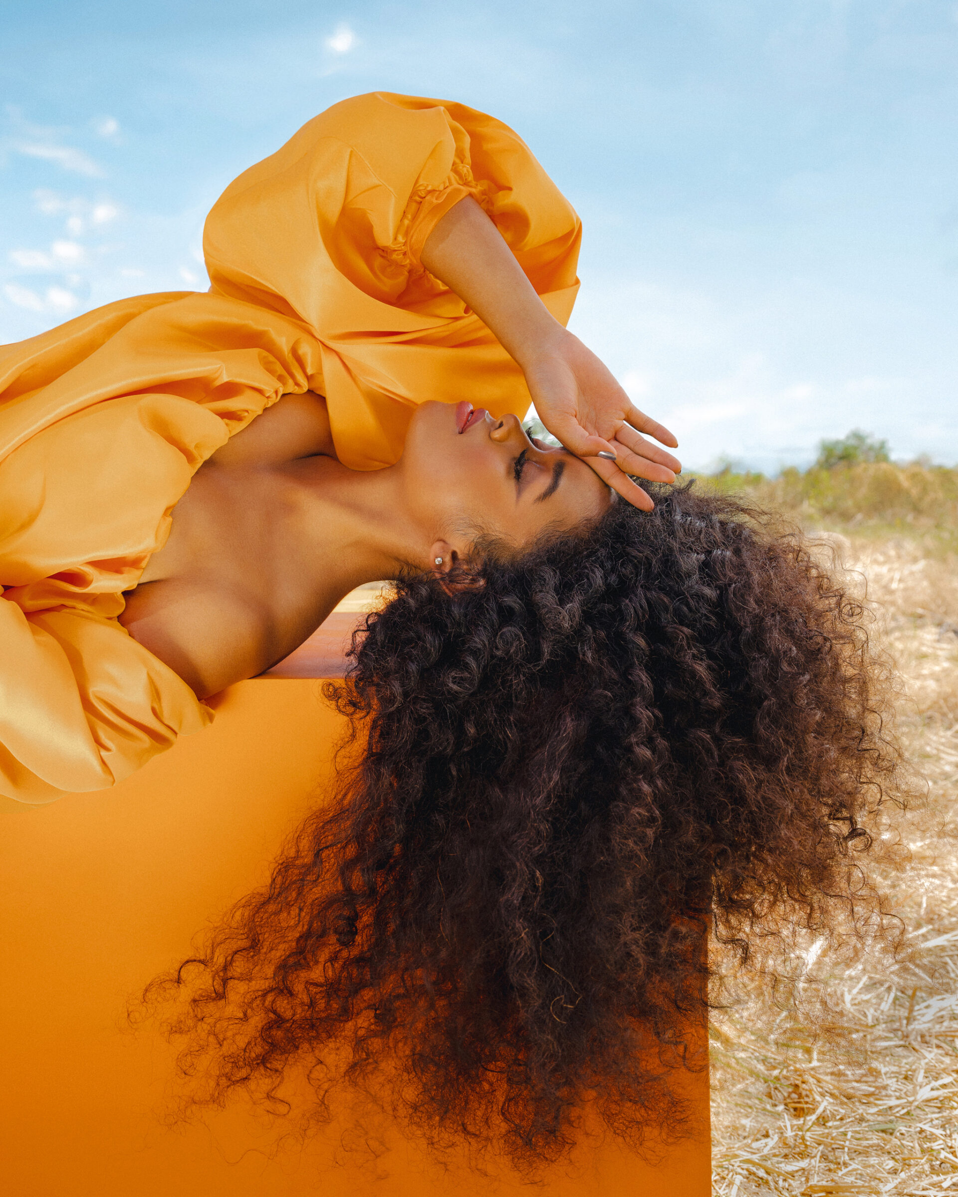 For the first, Nina and Gabi decided to go with H.E.R.’s signature look in big curls, but this time, with a dramatized shift. “Because it was Vogue, I wanted to up the ante a bit,” Nina says, “so we added some hair pieces in her hair to create more volume and movement and to create a bold look.” Here, Gabi is seen basking in the sun; carefree and hair free, with a playful, glowing aura.