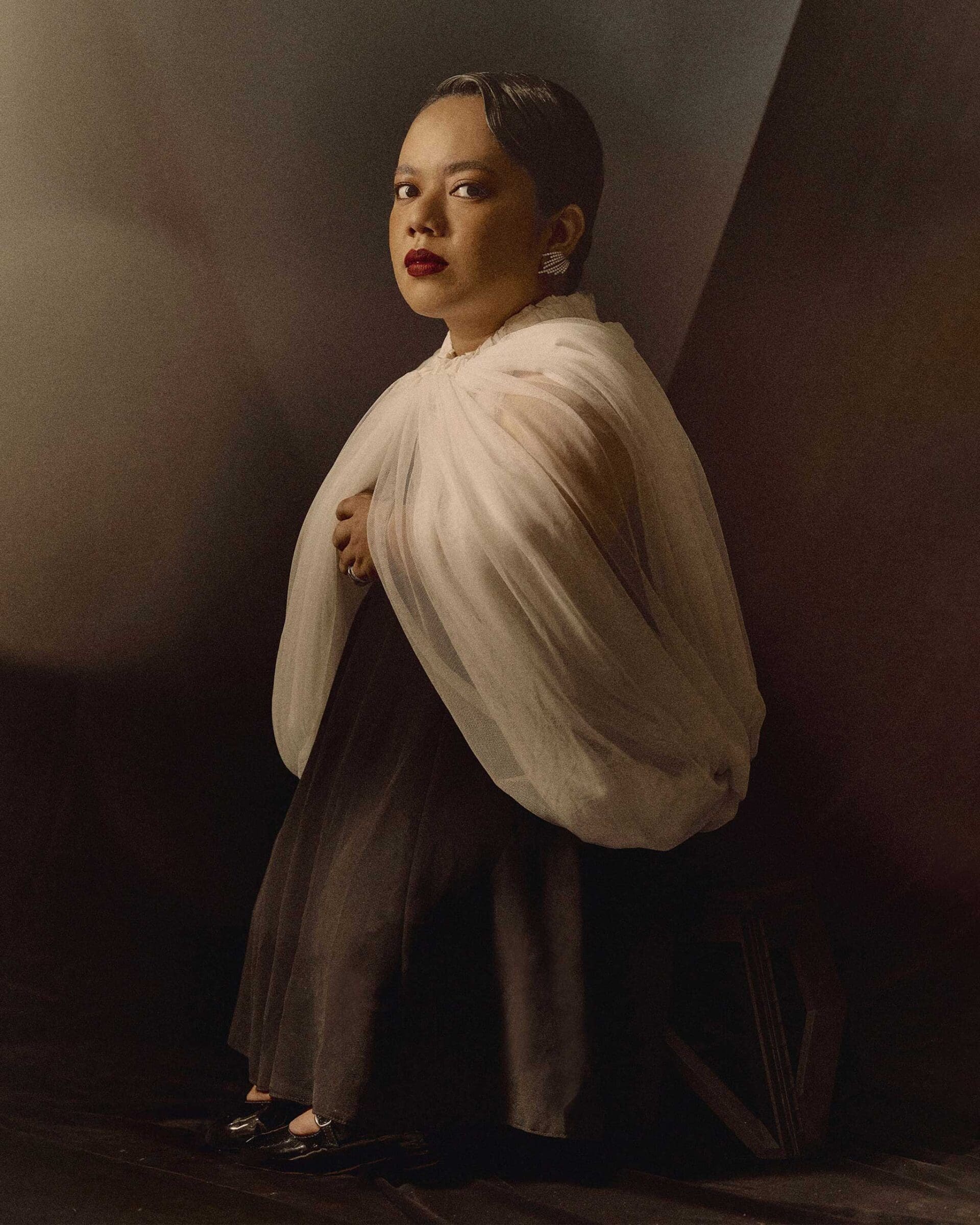 GAIL SORRONDA top worn as cape, DKNY skirt, NICOLE WHISENHUNT DESIGN earrings, CARTIER trinity ring, and JMC BRIDAL shoes. Photographed by Artu Nepomuceno for the March 2025 Issue of Vogue Philippines