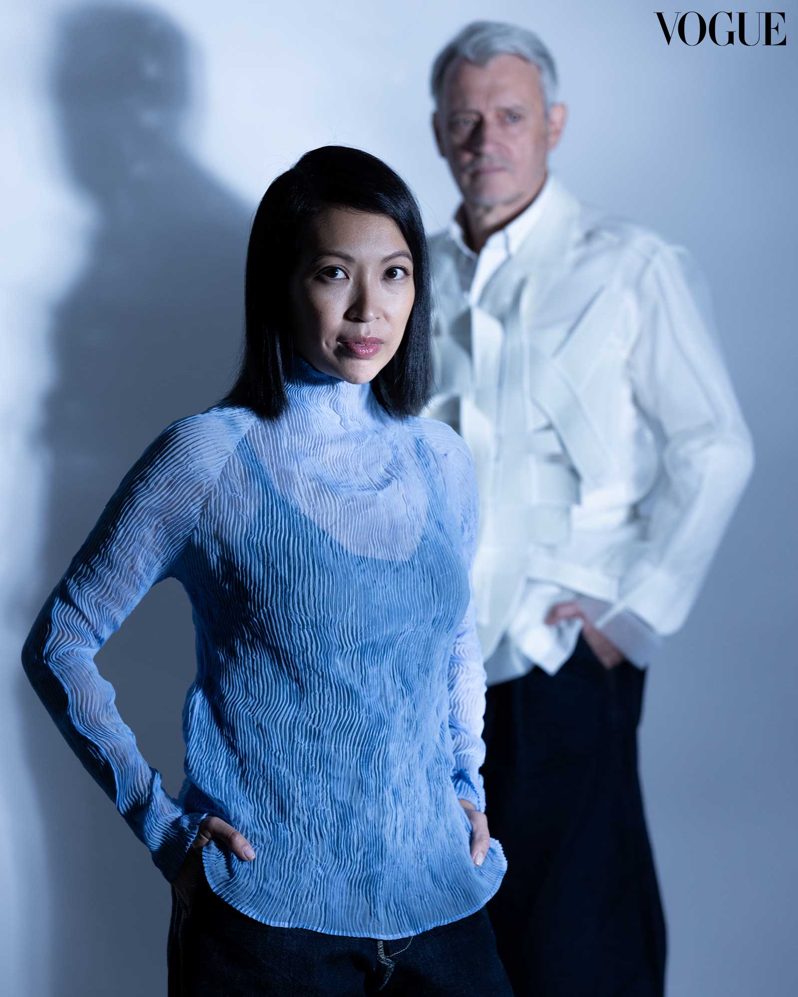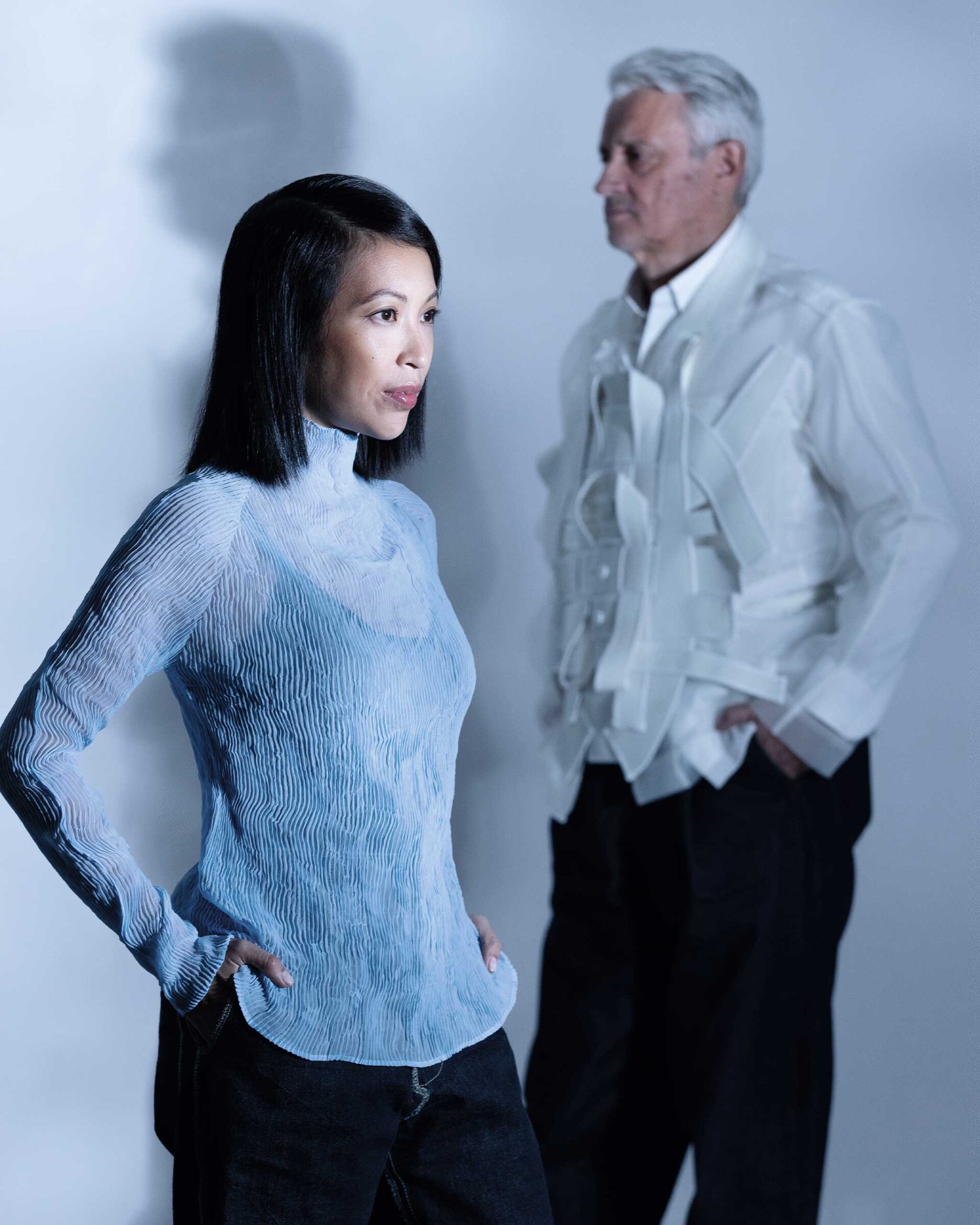 Giselle wears an ISSEY MIYAKE top. Philippe wears a HANSEN bib, NICOLÒ sheer shirt, UNIQLO shirt. Photo by Erwin Canlas