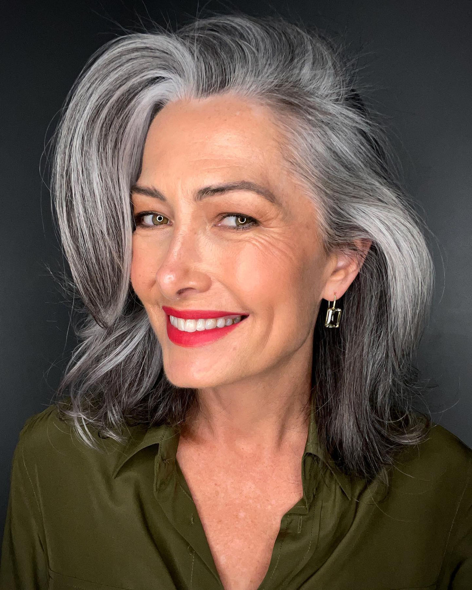 “What makes this process unique is that instead of the usual practice of concealing or covering gray hair, it works with the natural gray process to create a multi-tonal effect,” she says. “This technique mixes the gray strands with your natural hair tone, resulting in a subtle, blended look.”