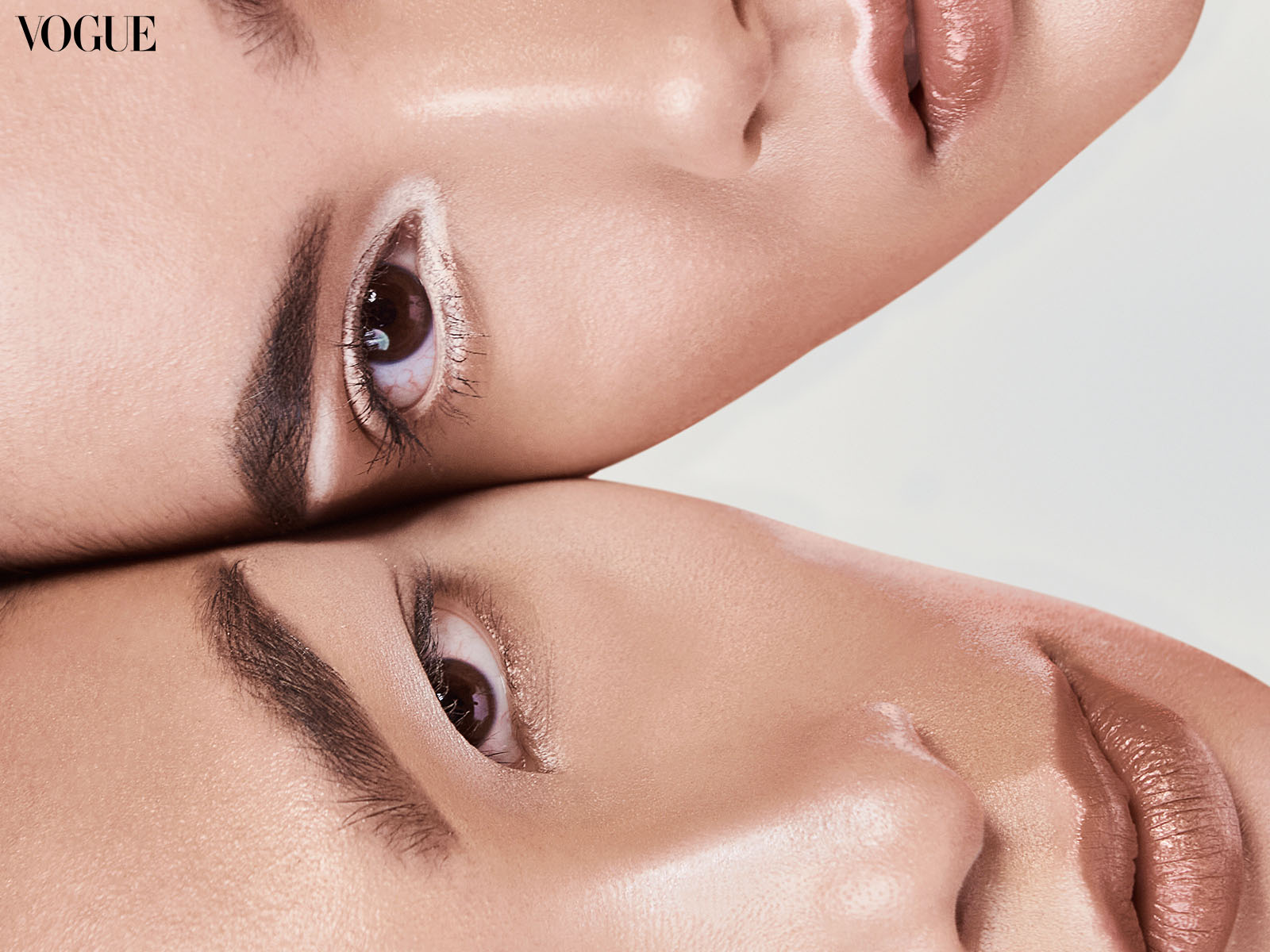 Usually, brows are mapped out using the three-point system from the crease of the nose, the outer part of the eye, and the edge of the nose to their parallel parts on the brow. “I don’t do it that way,” says Thomas. Instead, the artist follows the brow bone: plotting a line at the beginning of the brow and following the path where it curves. The method not only frames the ocular bone and the eyes but also “gives a natural lift on the ends and follows one’s precise face shape.”