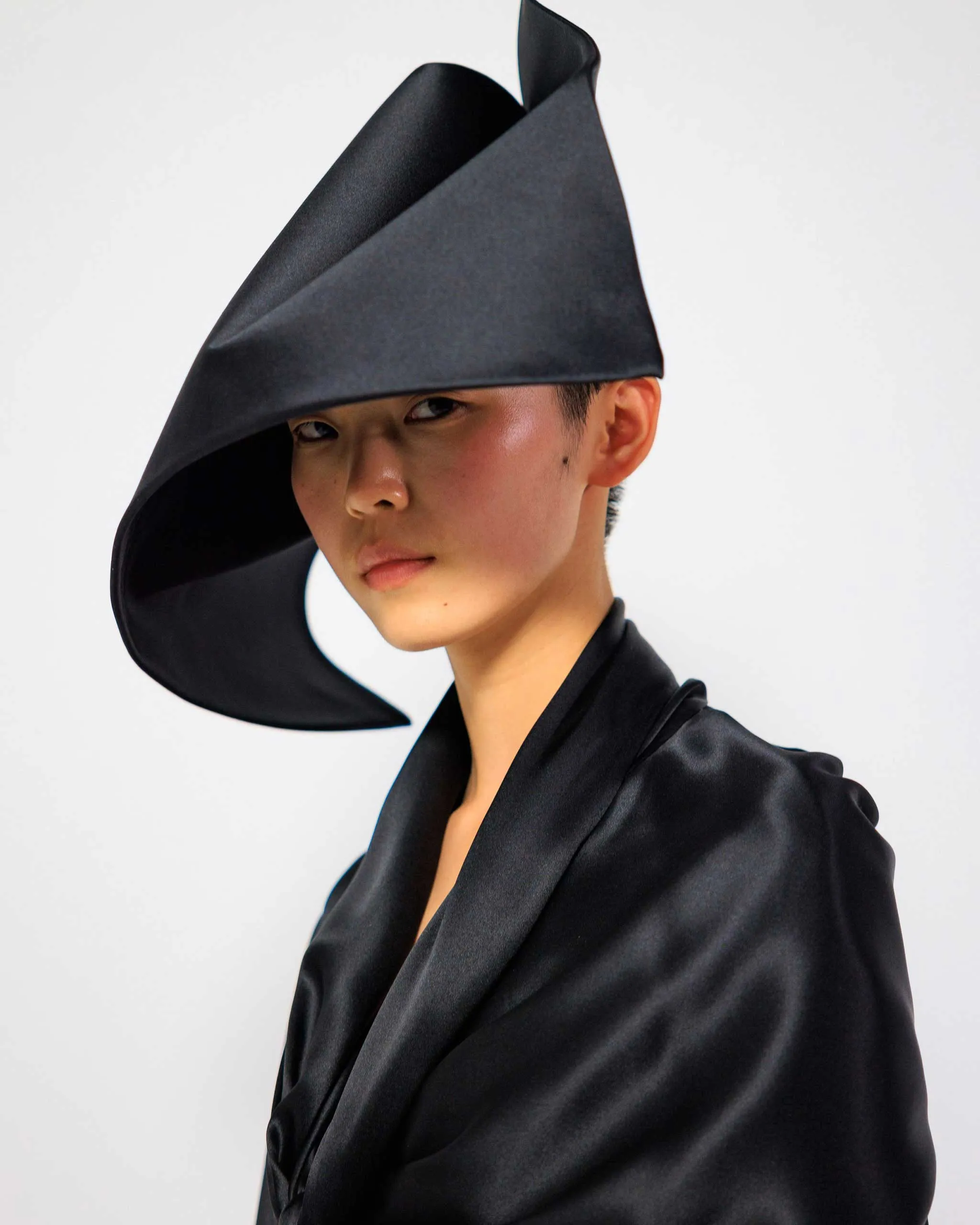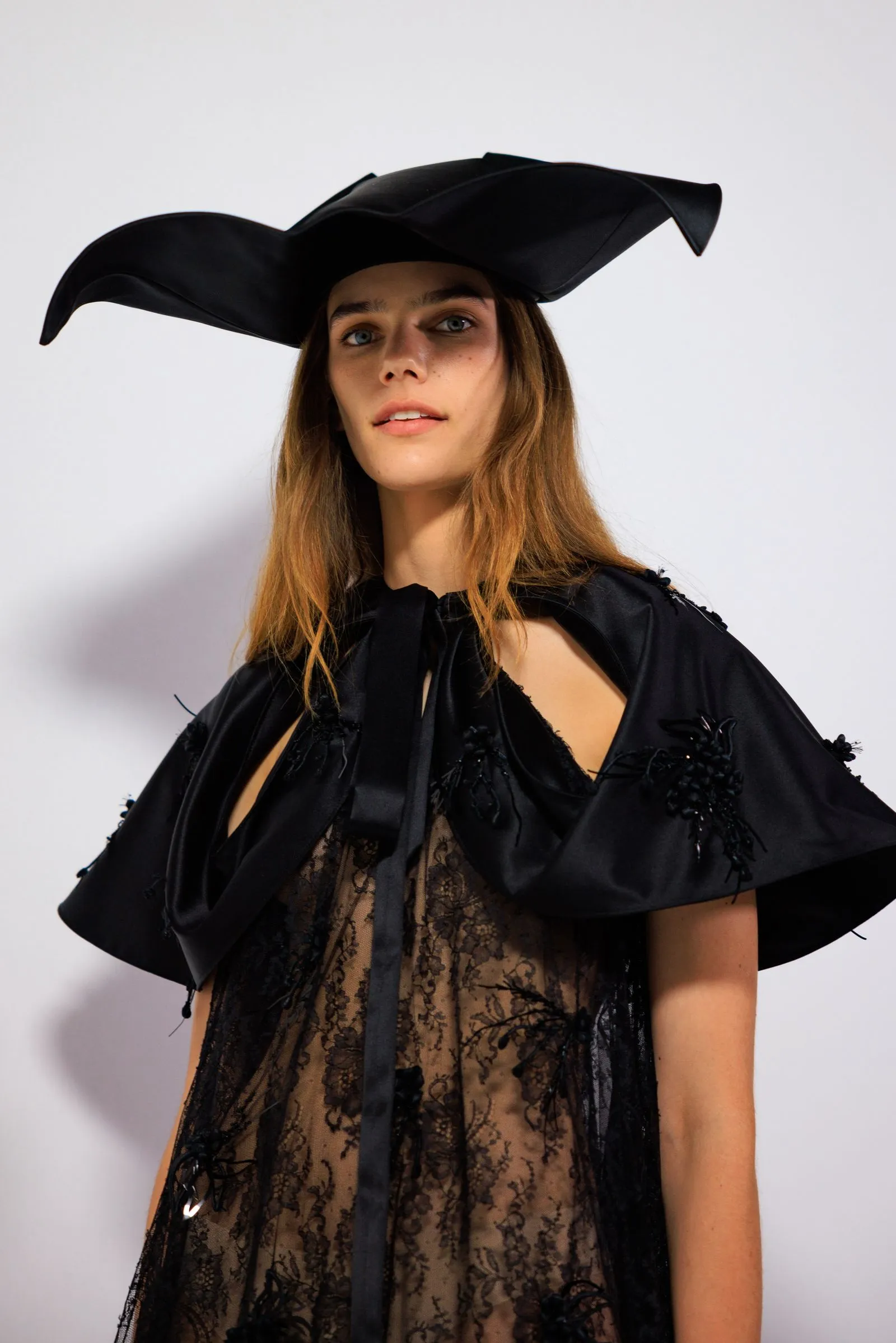 Outside, ushers at the Jardin des Tuileries dressed in relaxed gray Henley-style sweaters and drapey slacks showed guests to their seats. Jenna Ortega sat front row in a cutoff mini, while Jonathan Bailey smiled in a chill denim zip-up. When the show got underway, models walked under a glowing inverted pyramid suspended from the ceiling, wearing looks featuring exaggerated proportions and topped with milliner Stephen Jones’s hats, designed to “implode into themselves,” according to Anderson’s show notes. There were long knit capes, sheer lace gowns with floating fairy-wing-like structures, and dresses made completely of sequined petals; Philips’s “blossoming” beauty reflected this decisive vibe shift.