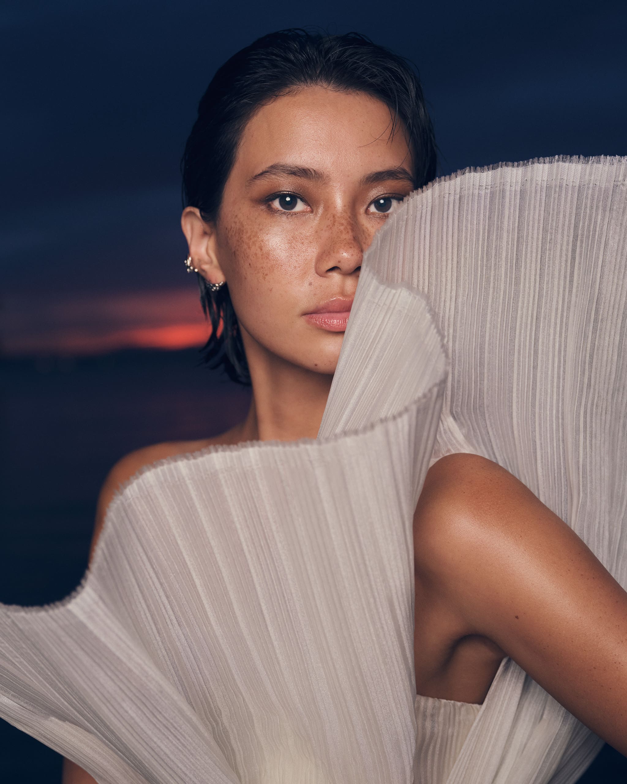 “We were engaging in a dialogue between all Filipinos—those within the Philippines and those outside the Philippines. There was a balance with how we came up with the beauty look for this shoot. I hope this mix—this unique look will be accepted in the global arena,” says Piñera. This global representation of Filipino beauty and identity underlined the entire beauty look. The conventional concept of the pearl was about its luminosity and its roundness. However, the Pearl of the Orient theme that informed the beauty look moved beyond this—it was a meeting of cultures, a forward-thinking perspective, and an understanding of the true essence of Philippine identity.