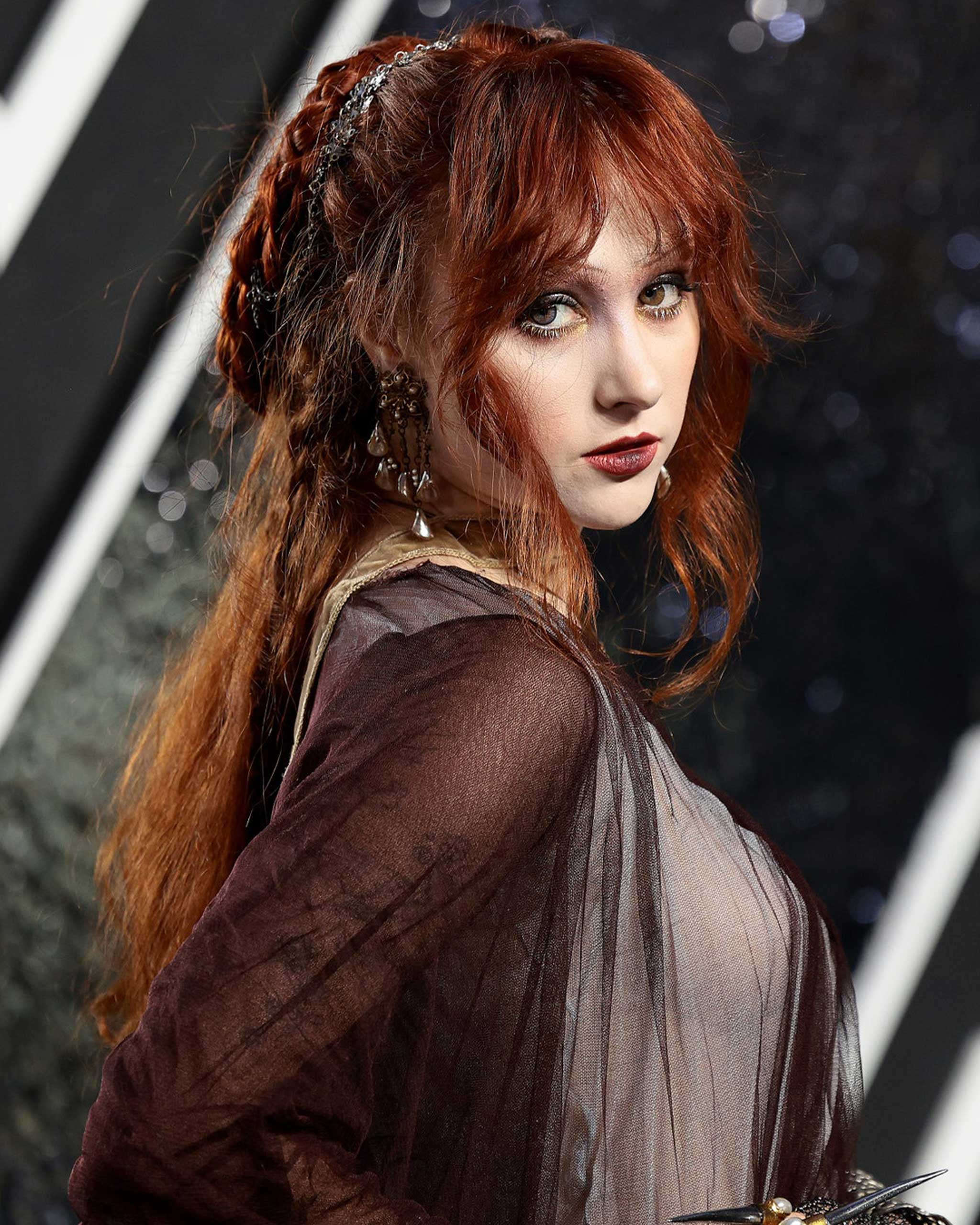 “The inspiration came from Chappell and [stylist] Genesis’s medieval royal fantasy visions!” Dahling says. “The tones in her hair and dress really inspired the tones of the makeup. And the character really inspires every aspect.” The night’s glam was all M.A.C., starting with the singer’s iconic painted base. Dahling took a porcelain shade of Studio Fix Fluid 24hr Matte Foundation (not far off from Roan’s natural complexion, honestly) and the MAC Paint Stick in white, buffing it across her face. From there, pencil-thin brows were painted on to create a sharp expression, while the application of colored contacts created an almost vampire-like effect. (Hello, Victoria from Twilight.) On her lips was a deep wine-red stain (a combination of Velvet Teddy and Sin) concentrated at the center of her mouth, which faded a bit as it bled out. “I wanted to create an ambiance of period makeup without being too costume, so matte finishes were better,” Dahling says. “I added highlights to the face to create an ethereal element to the makeup.”