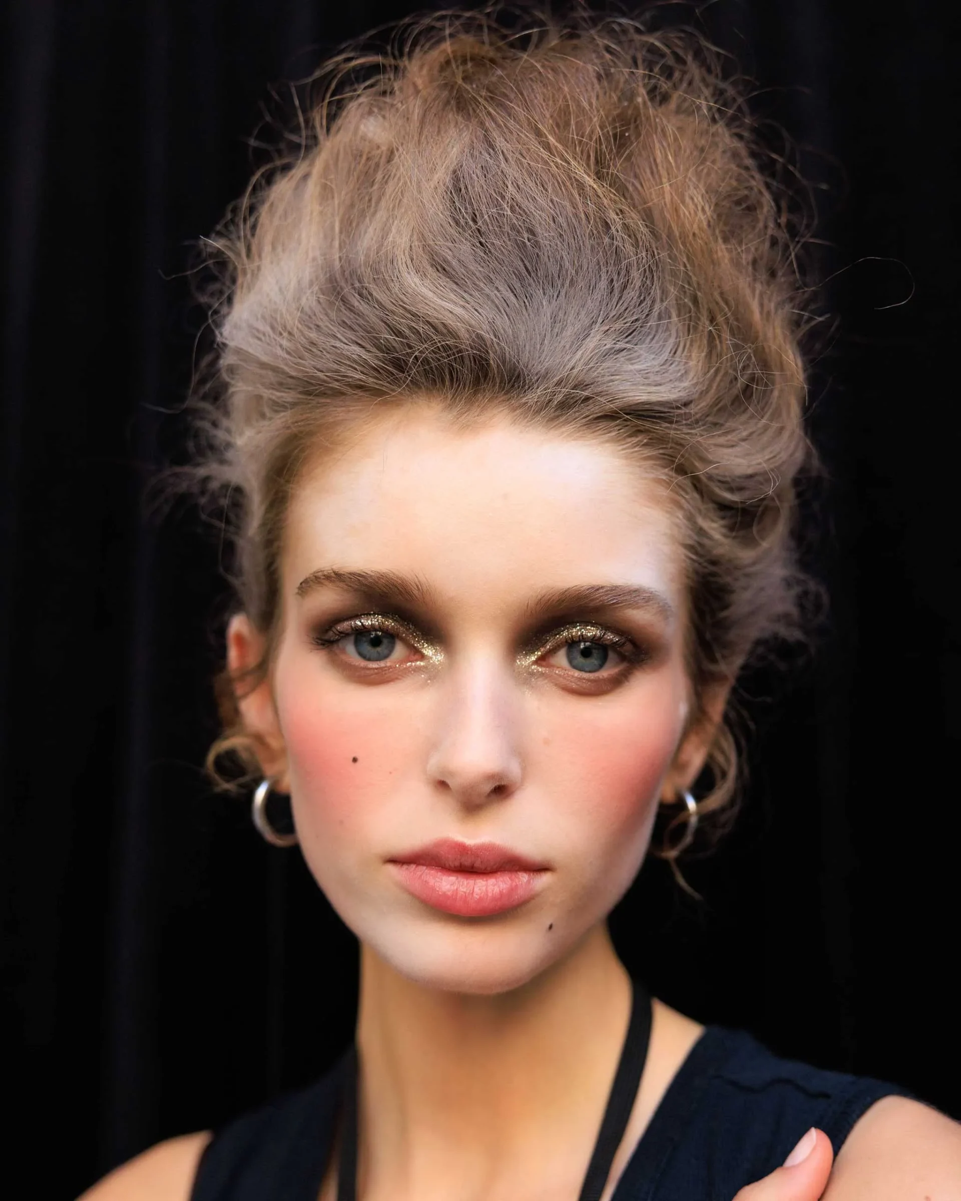 Back in the modern world, McGrath describes “Marie Antoinette blush” as a focus on that very same opulent, romantic flush. “Delicate yet dramatic. Refined, yet full of life,” she says. “It’s not a contour moment; it’s a bloom of color that radiates from the center of the face outward, like candlelight or porcelain.”