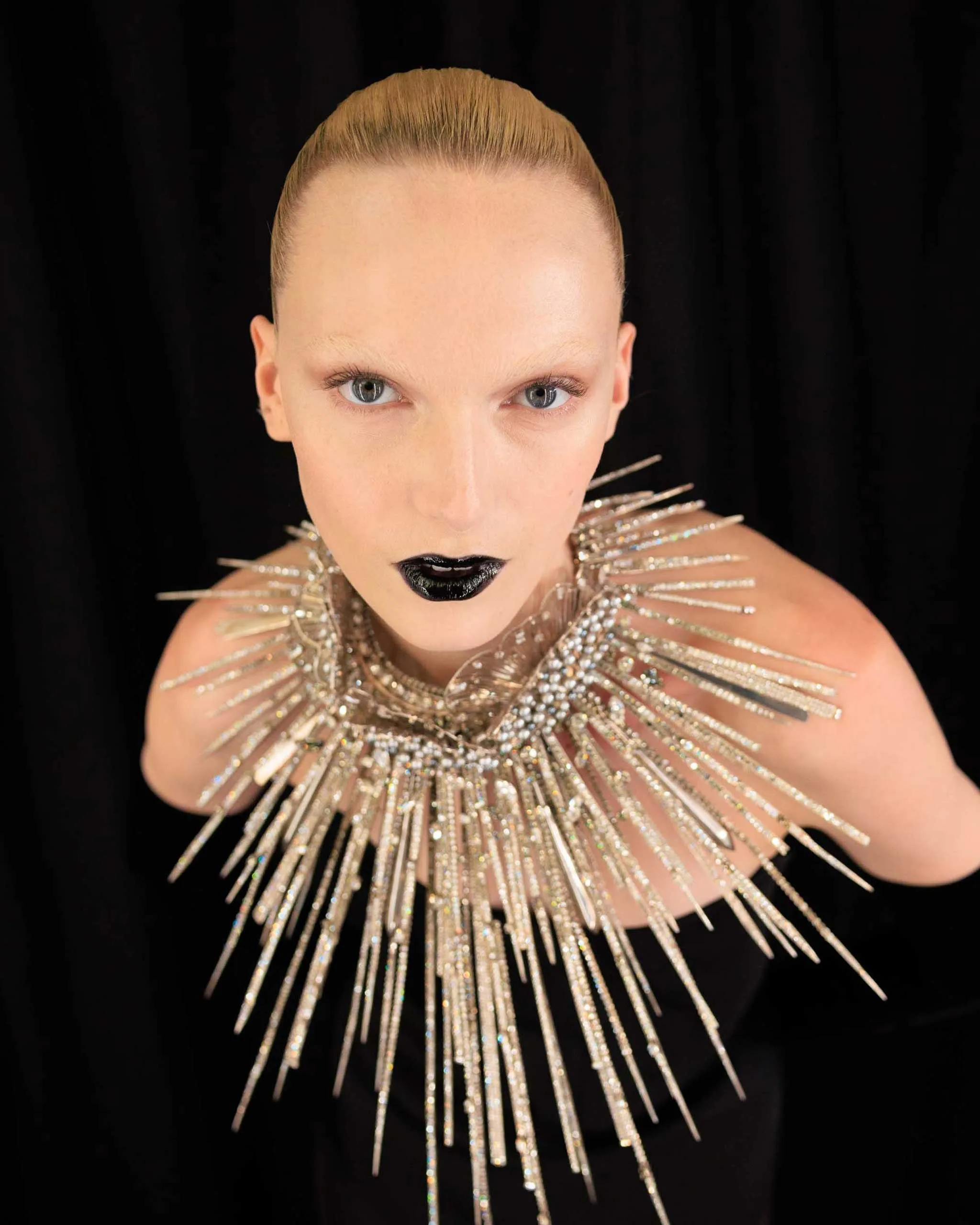“It’s almost a study of black and white photography,” McGrath shares, speaking to Vogue backstage. “So, as we always do at Schiaparelli, the skin is very angelic and highlighted with beautiful, gleaming skin texture with the glass skin spray (the Skin Fetish Glass 001) on the cheekbone area alone.” For the eyes, which were noticeably devoid of much adornment, McGrath used just one lick of her Pat McGrath Labs Fetisheyes Mascara on models’ lashes.