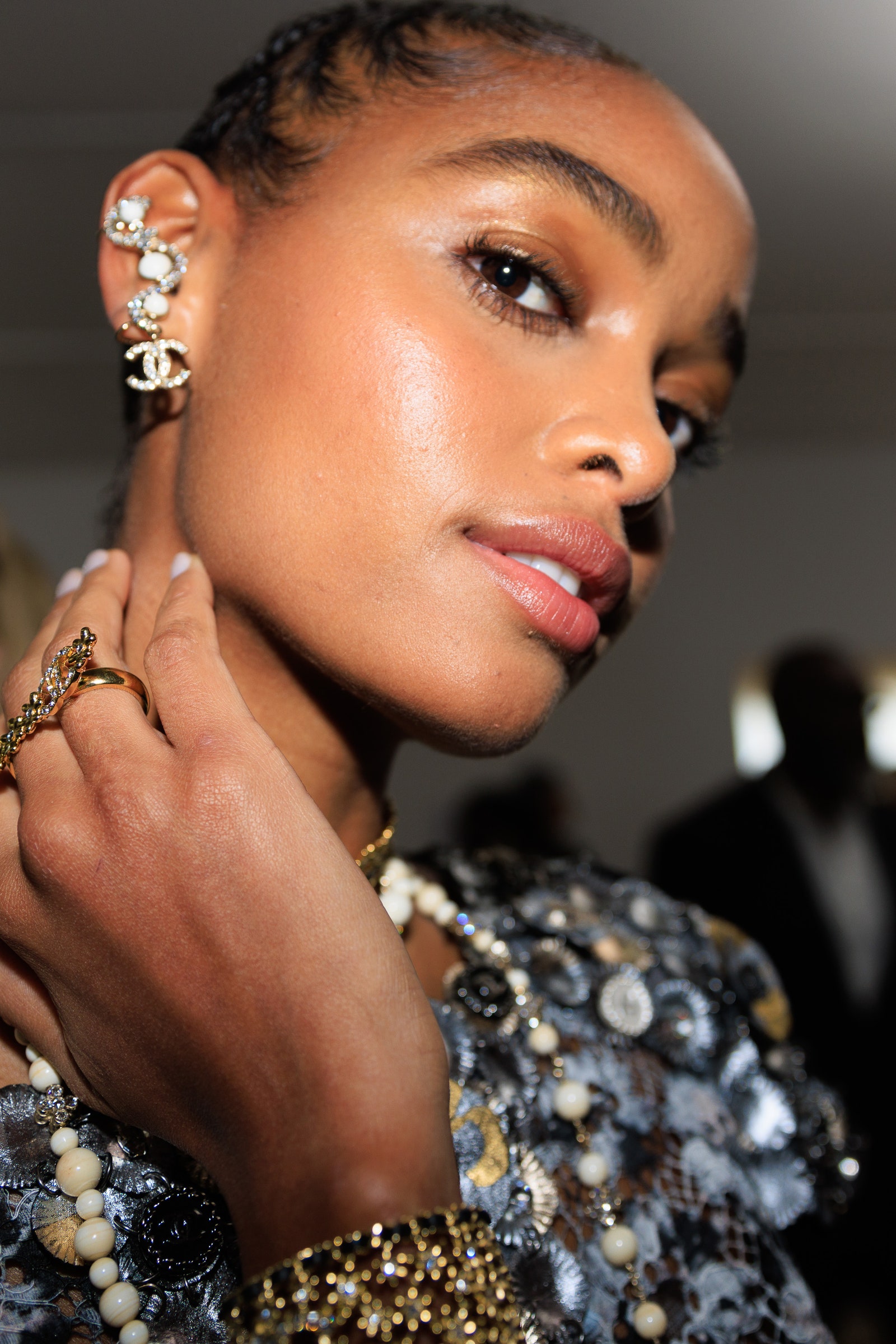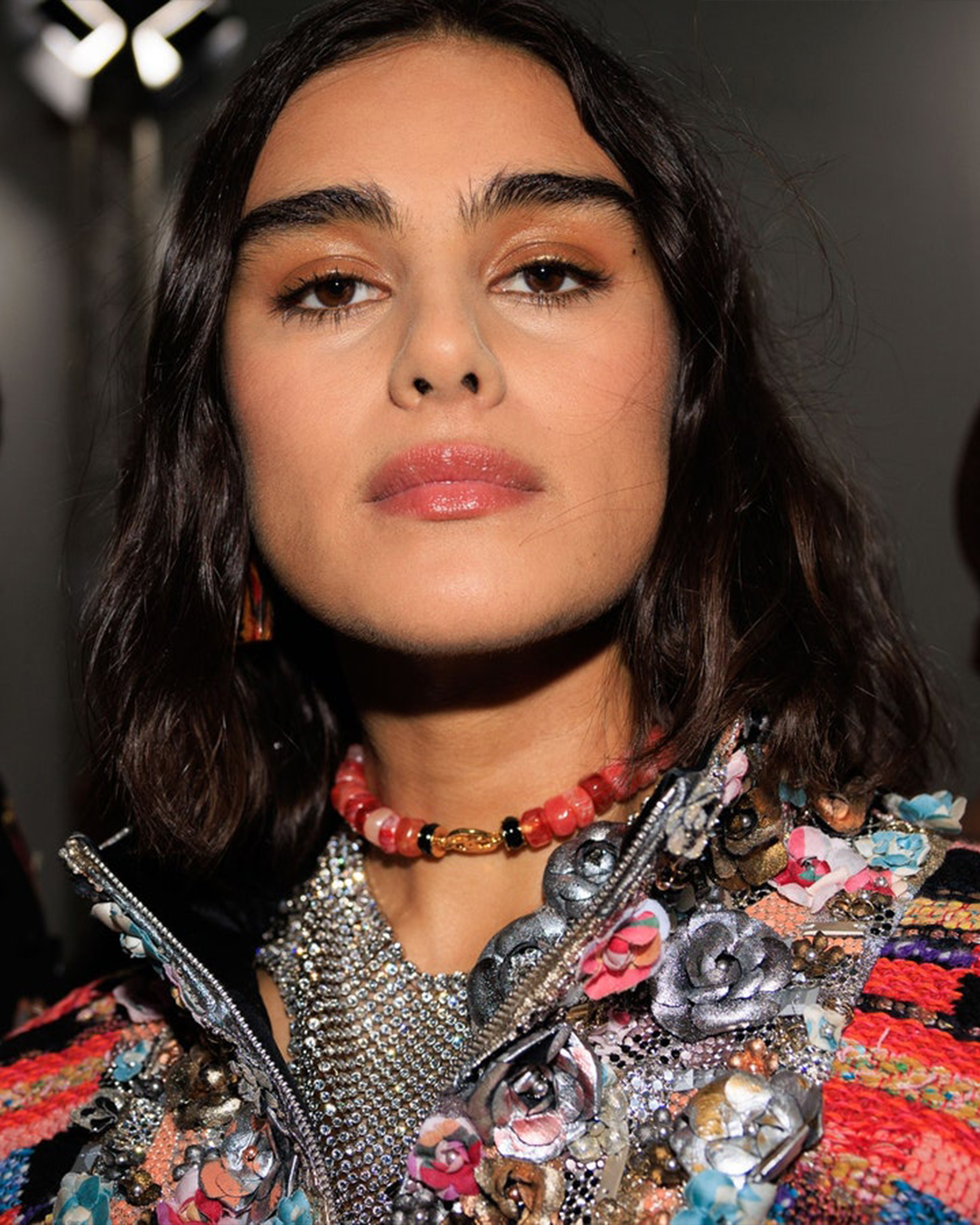 Above the neck was an array of hairstyles, including rumpled waves, center parts, buzz cuts, topknots, and cornrows, with beaded beanies and turbans in the mix. The makeup teamed balmy lips, dewy skin, and brushed-up brows with glossy and metallic eye looks. Backstage, the hero products included Chanel Les 4 Ombres in Codes Élégantes and Chanel Les Beiges shadows for subtle shimmer across gazes, while pouts were swept with Chanel Rouge Coco Flash in Immédiat, a soft but striking coral pink.