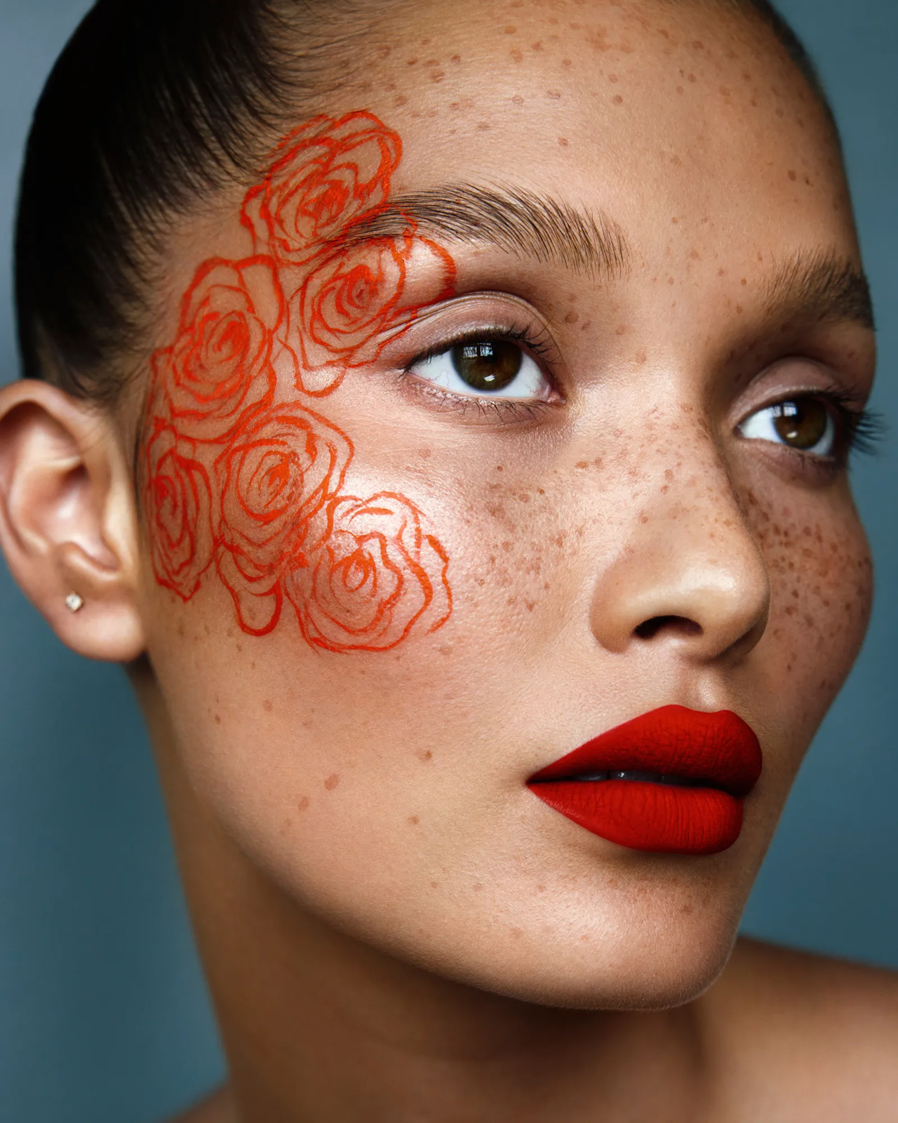 A raft of new liquid lipsticks—which go on as a liquid and dry matte—also make achieving an impactful pout super easy. One of Wolff’s favourites is Fenty Beauty’s Stunna Lip Paint, and Vogue also loves Byredo’s latest Liquid Lipsticks. “For foolproof results, apply a neutral-toned lip liner before applying lipstick to map out the lip shape,” recommends Wolff. The ultimate finishing touch? A little blush or contour along the cheekbones, and maybe even a few freckles, suggests Wolff, to balance the look.
