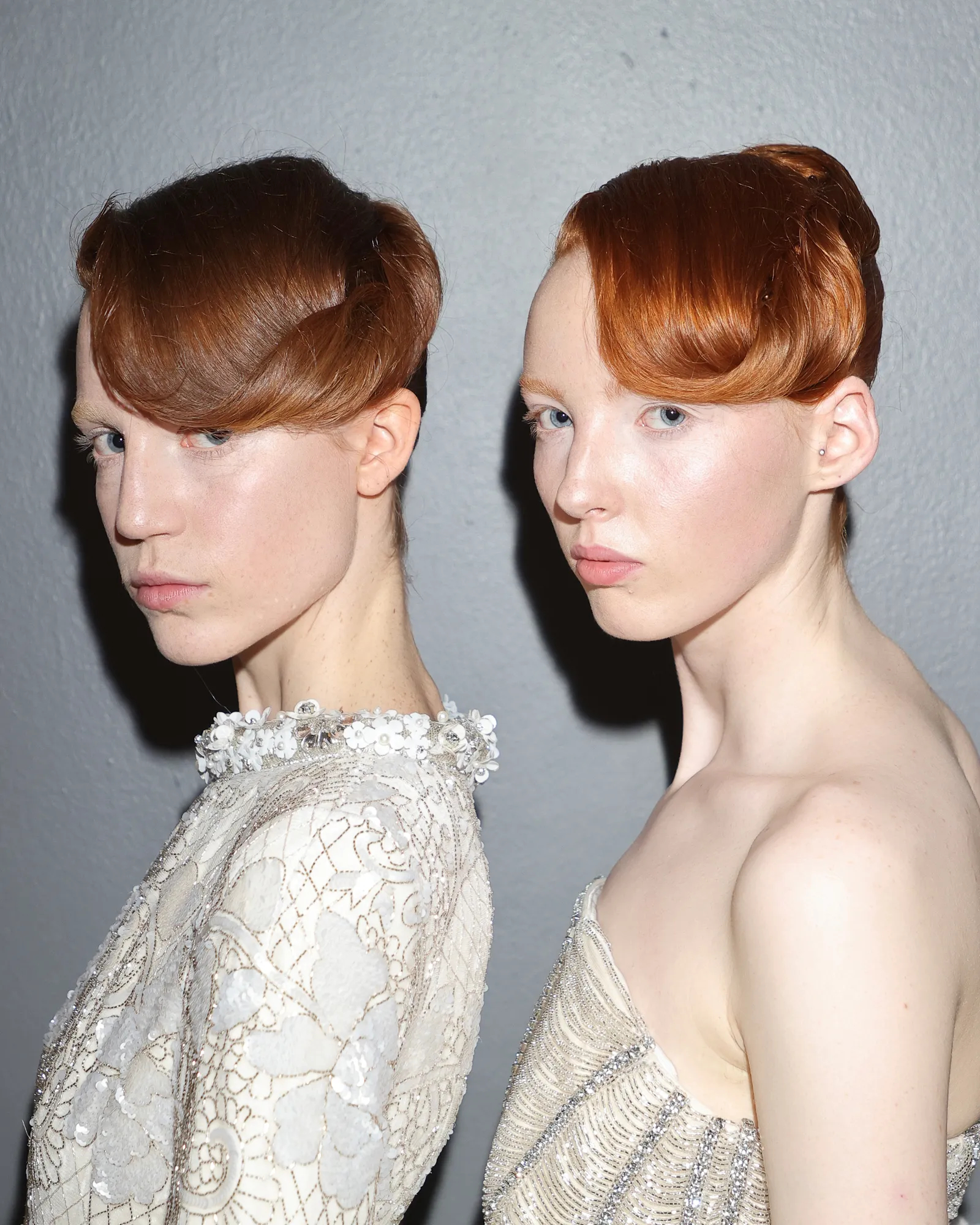 Hairstylist Sam McKnight’s sculpted up-dos, meanwhile, harked back to the hair seen on couture runways back in the ’80s. McKnight and his team created lacquered, precision styles for the Richard Quinn catwalk by carefully moulding models’ hair into two separate sections. The bottom section was styled into a French pleat and then the top section – from the temple back to the crown and round to the opposite temple – was curled using 25mm tongs (accuracy is key), brushed into a wave and pinned into place, and then finished with a dusting of McKnight’s Modern Hairspray to hold. Depending on texture, McKnight applied a finishing product to enhance shine.