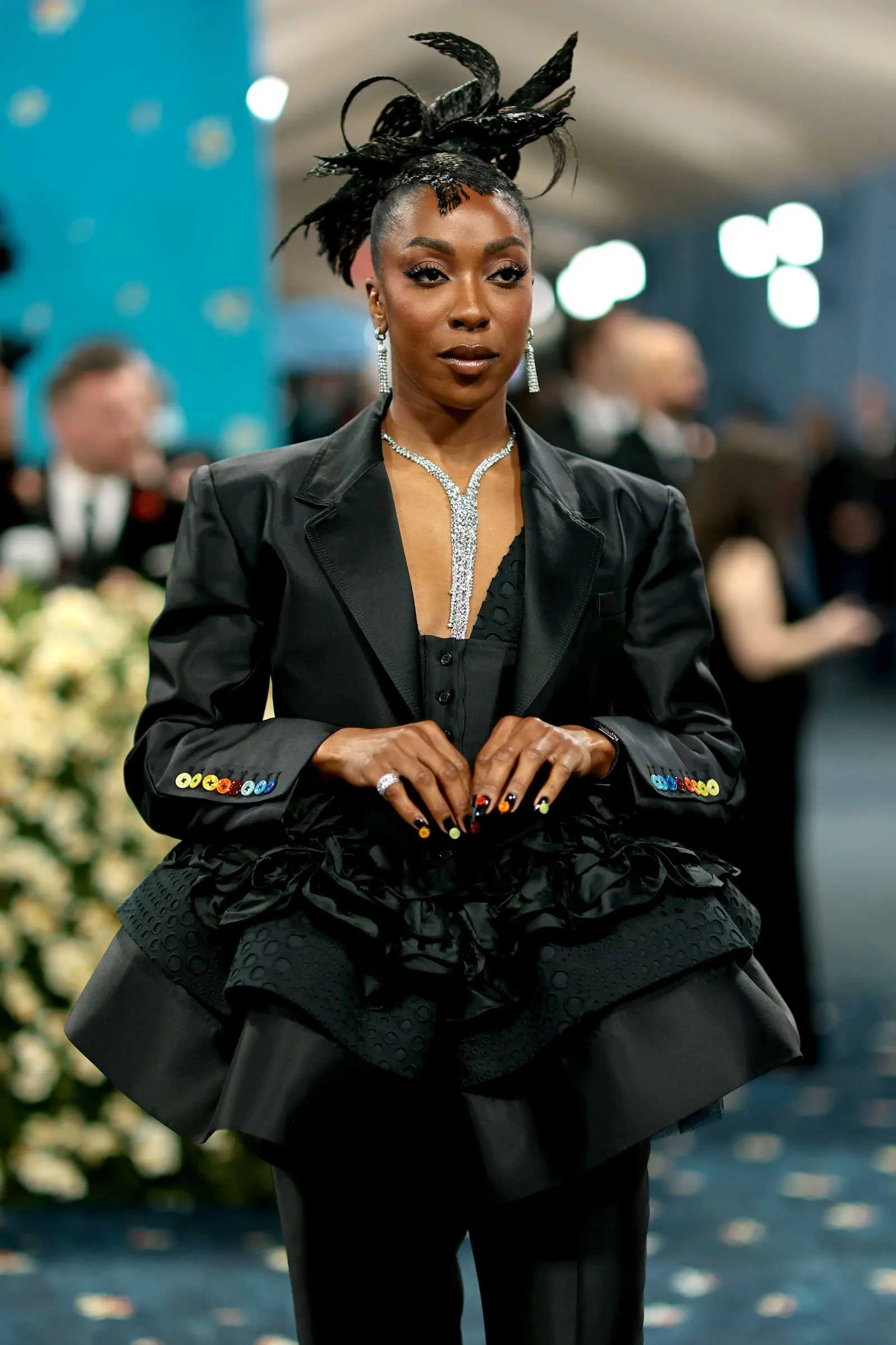 On the nails front, glimmering 3D manicures were on the menu. Cynthia Erivo did not disappoint and came ready to pose with her signature stiletto manicure – this time made up of black and red jewels – all while donning a subtle heart-shaped faux face tattoo.