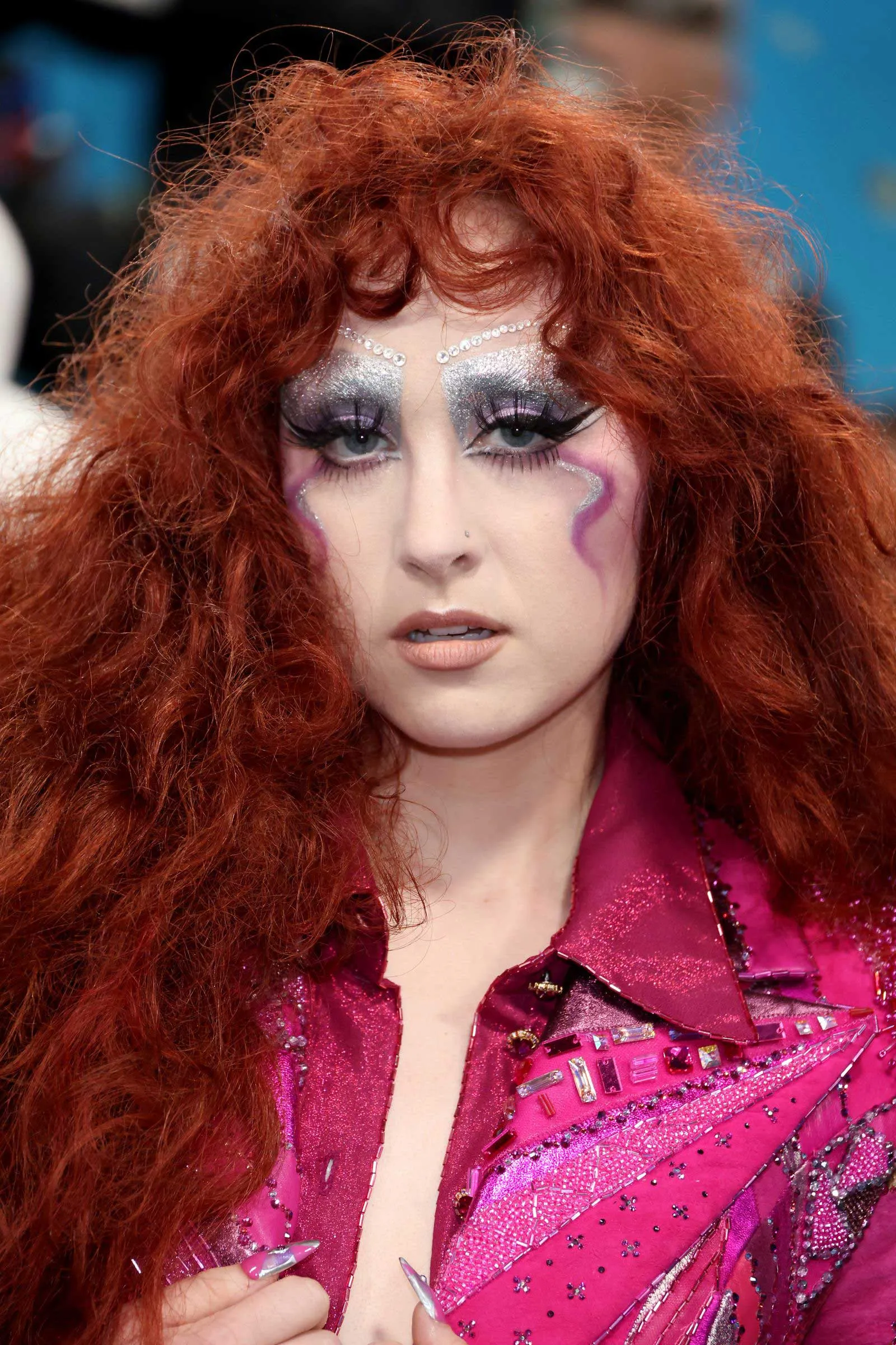 Chappell Roan also favoured a bedazzled brow look, opting for an angular outline, just above her highly placed glittery eyeshadow. The same silver shadow was used to draw faux tears down Roan’s cheeks, shaded with a bright purple colour that was also dotted on the base of her eyelids. “We channelled the glamour and freedom of the disco era – think Sylvester, Superfly, superfine tailoring, and unapologetic shine,” make-up maestro Pat McGrath told Vogue.