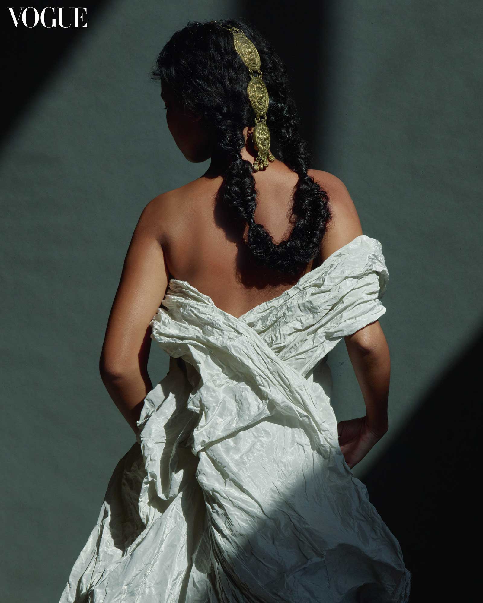 On set that day, Abdur and fellow casting call models Alyannah “Yanna” Gutierrez, Criza Mae Gallardo, Pamela Myco Agustin, Romechelle “Rommy” Escrin, Krystahl Guina, and Kurt Vicencio were swept up in swaths of silk crepe, taffeta, and gauzy fabric, and decorated with gold, brass, and straw. Styled by David Milan and Vogue Philippines fashion director Pam Quiñones, sculptural volumes were meant to depict a sense of regality, something that felt necessary in translating traditional Mindanaoan dress for the modern eye.