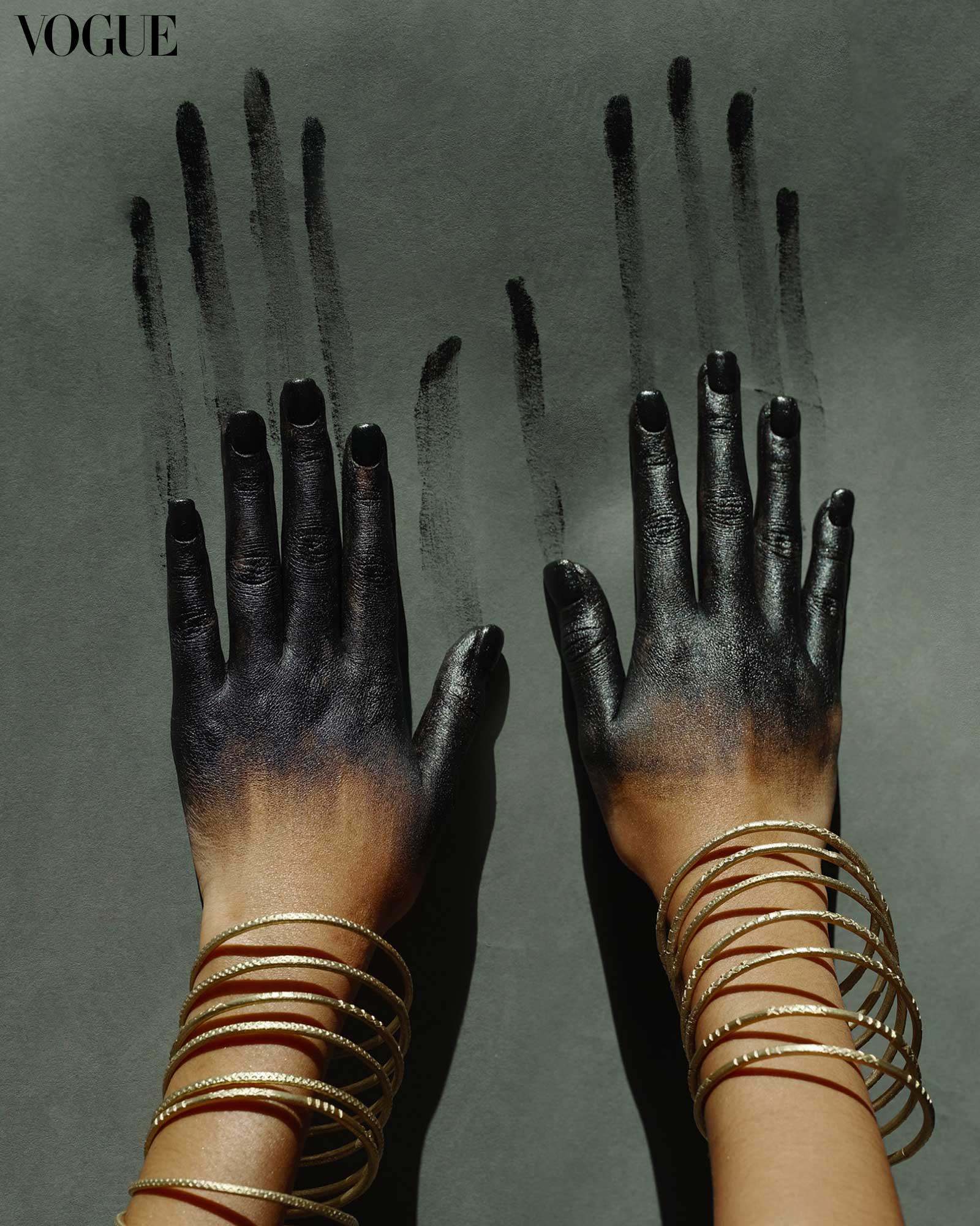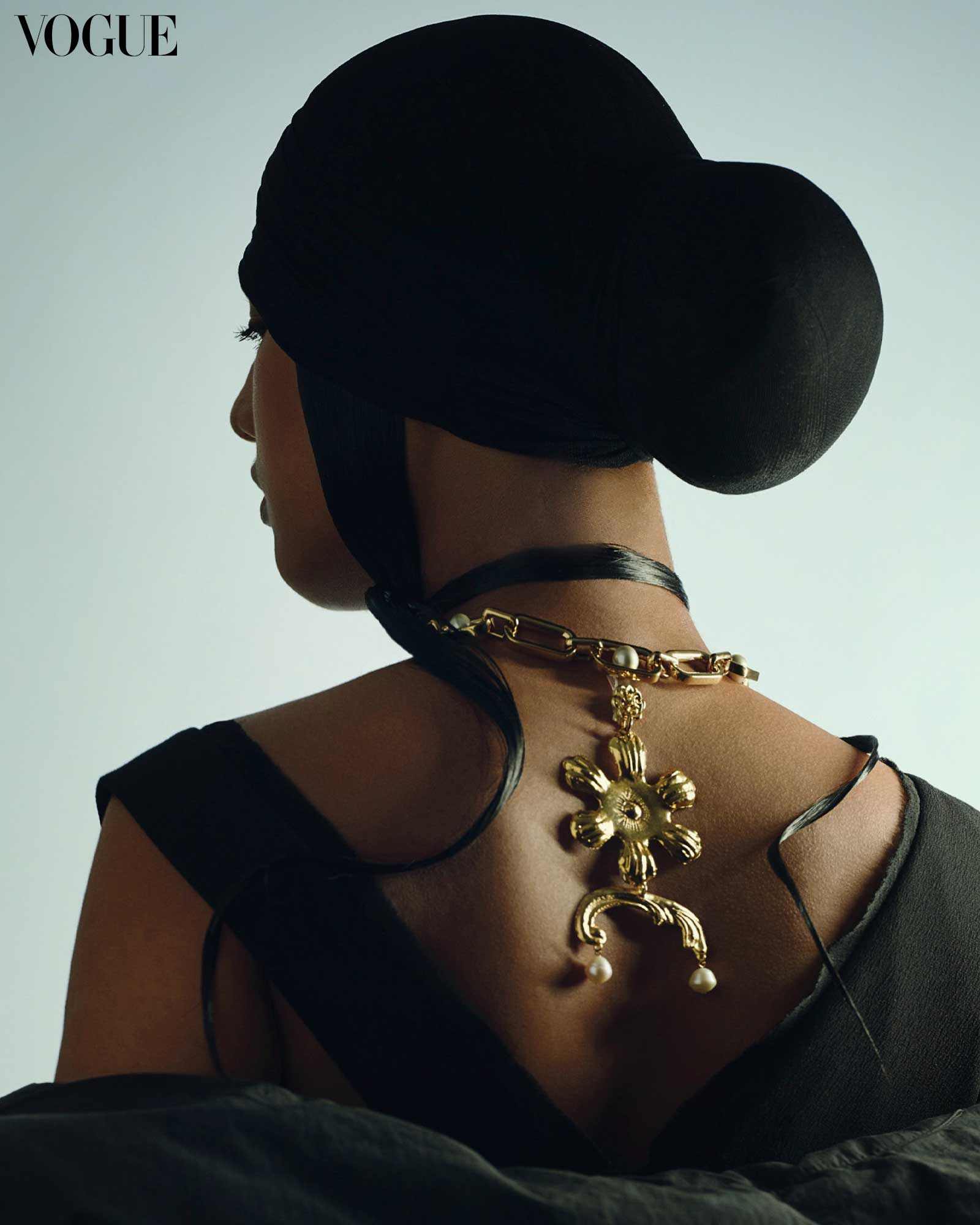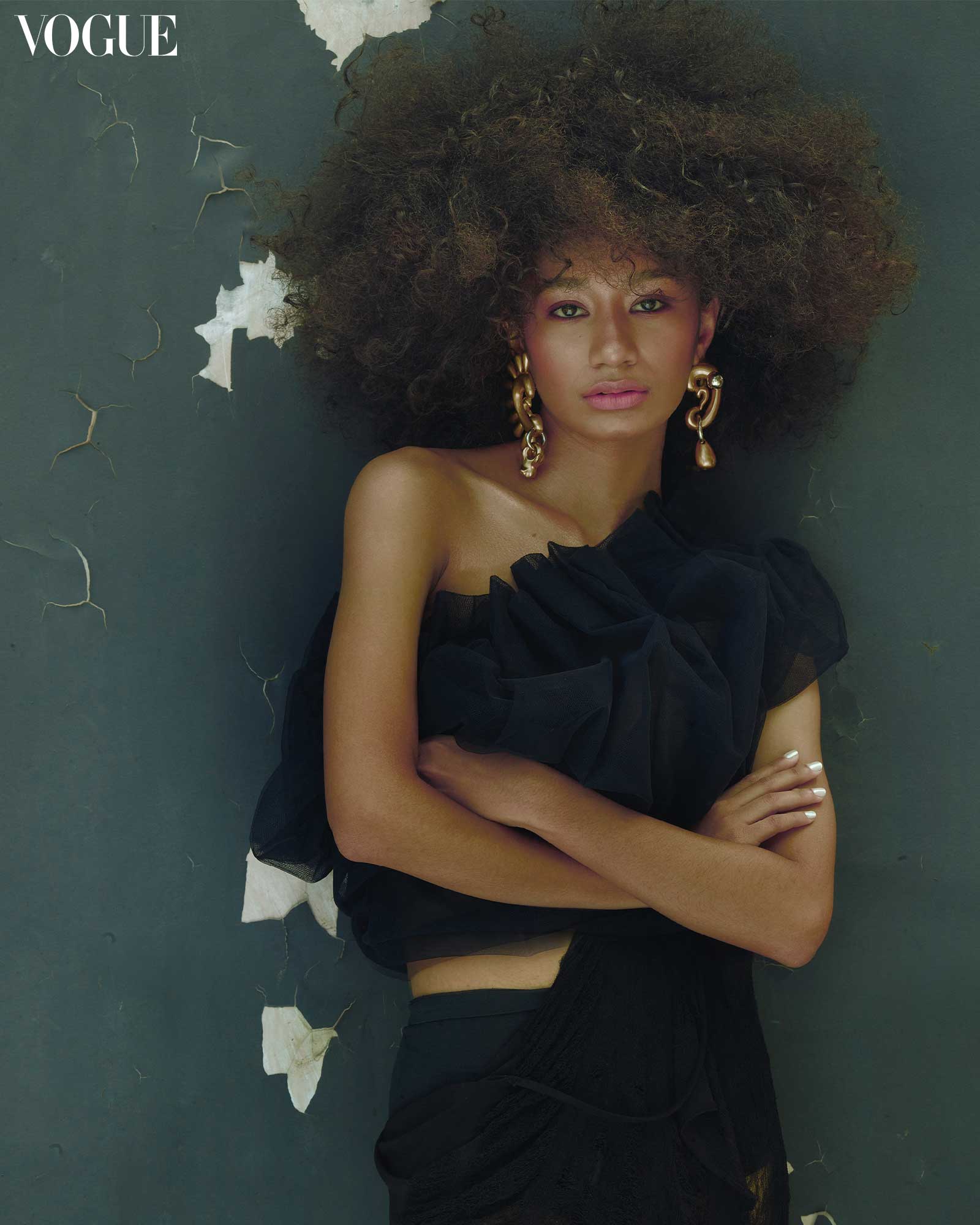 “How do you take inspiration from a culture that is so colorful?” David poses. In any case, he says, this story was more about highlighting each of the models’ individuality. He and Quiñones stick to a palette of oatmeal and black to keep the focus on their beauty. “What I thought was, just really focusing on the features of each talent, not really taking away too much or distracting from their hair or their distinct features.”