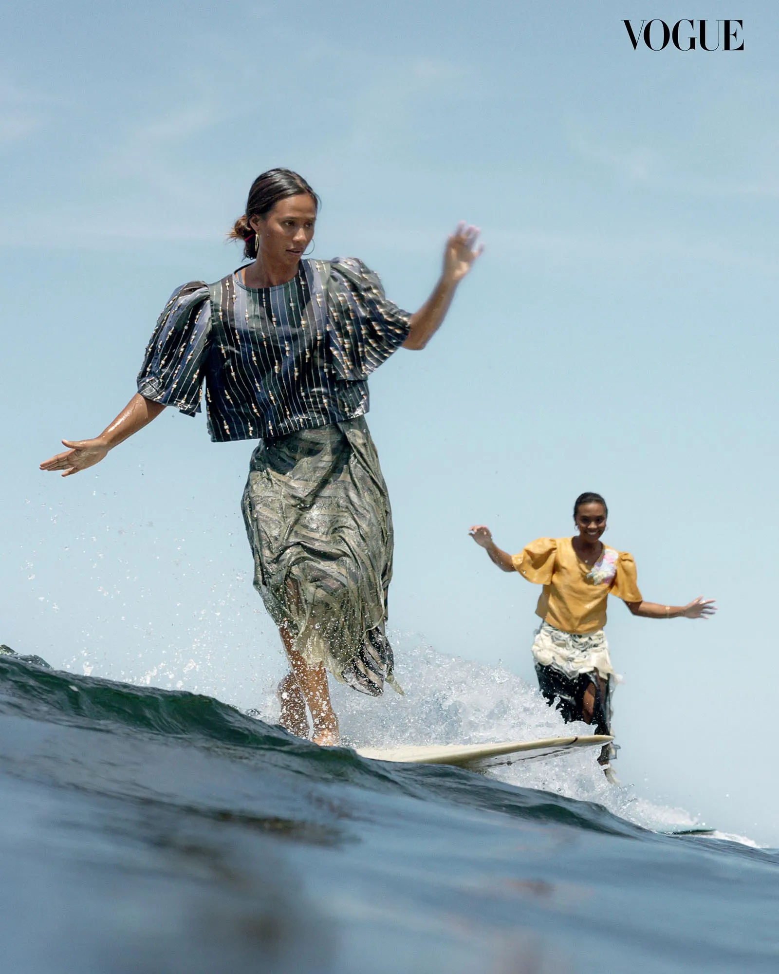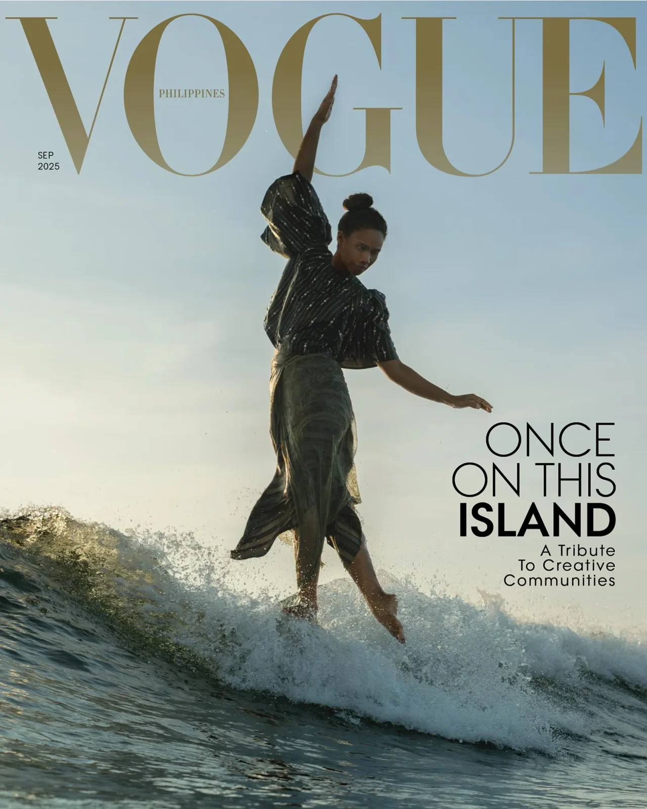 Ikit Agudo wears a JOR-EL ESPINA top and skirt, surfing along the shores of Siargao Island, Surigao Del Norte, Philippines. Photographed by Archie Geotina and Yerg, Vogue Philippines, September 2025.