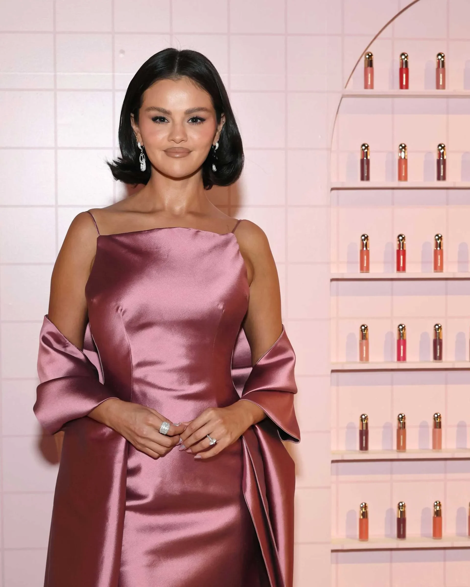 For last night’s event, Gomez also sported a coiffed bob, styled with flicked out ends and a center part by her longtime hairstylist Renato Campora. It wasn’t unlike her sleek bridal bob, which was similarly elegant and featured just a bit more of a nostalgic, silver screen-like wave. For the rest of her glam, Gomez experimented with a more ’00s inspired lip combo, opting for a darker, taupey lip liner and cooler-toned brown gloss, finishing the look with a smoky gray eye and blooming pink blush.
