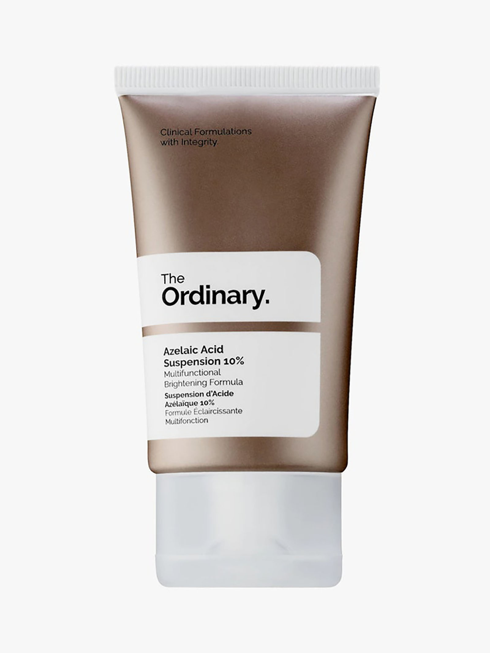 Beta-hydroxy acids (BHAs) are oil-soluble and go deeper into the pores than AHAs to clear excess debris and sebum. Mattioli likes azelaic acid, such as The Ordinary’s Azelaic Acid Suspension 10%, as its high molecular-weight effectively kills bacteria while also reducing redness and swelling, making it gentle enough for treating acne and rosacea.