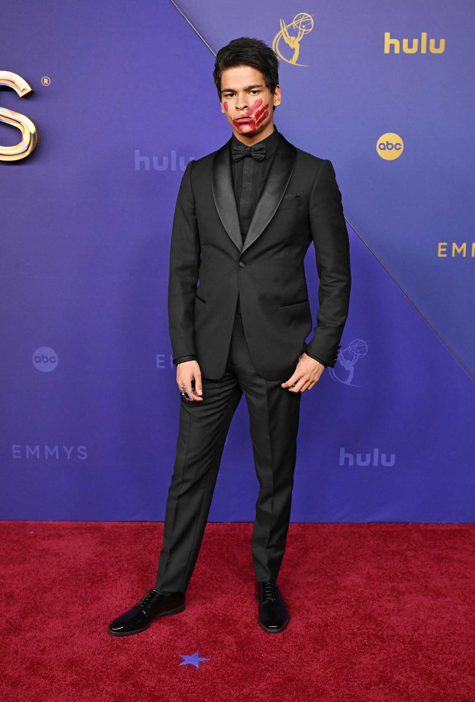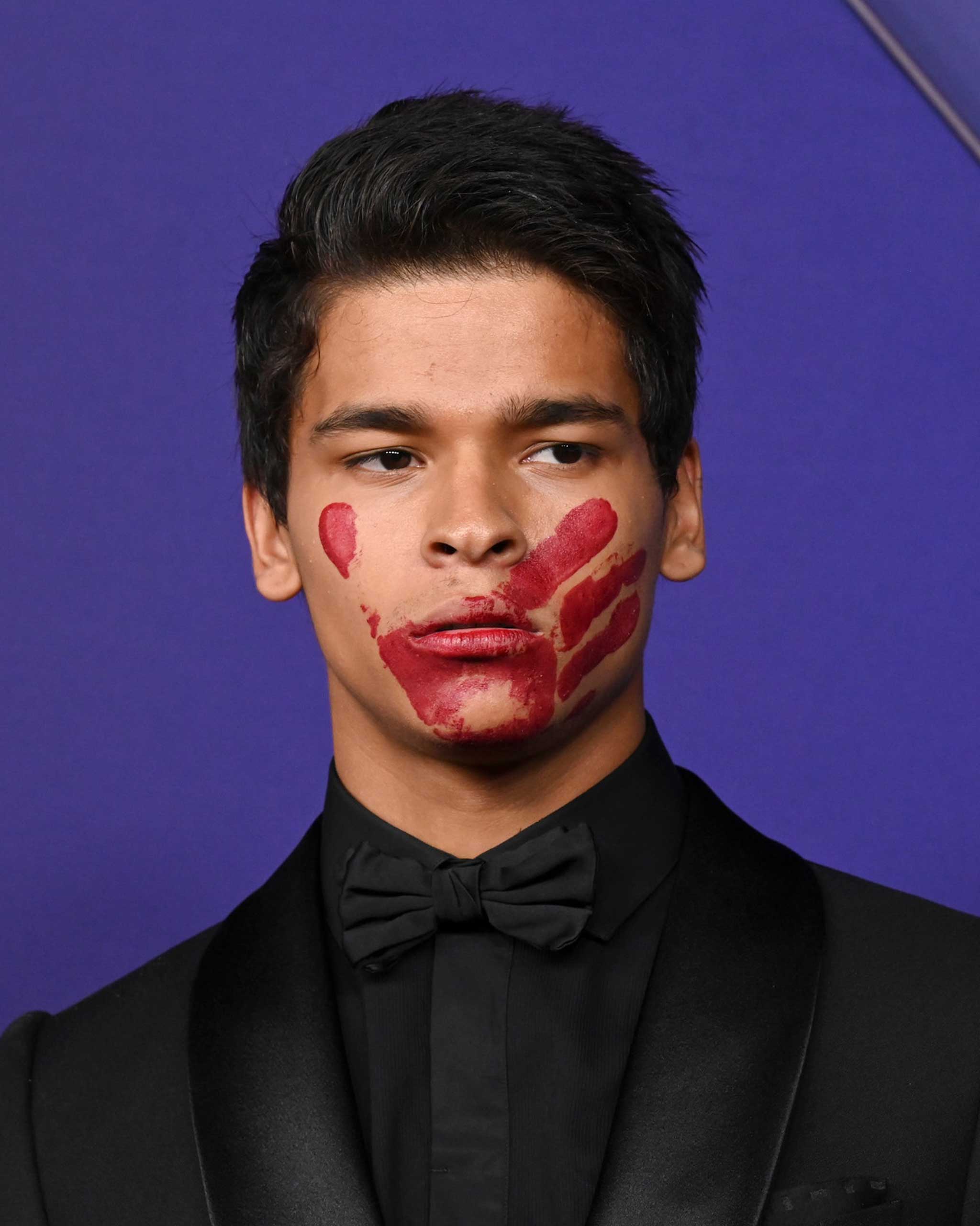 Reservation Dogs star D’Pharaoh Woon-A-Tai made history with his nomination for outstanding actor in a comedy series at tonight’s 2024 Emmy Awards, becoming the first Indigenous actor ever to be recognized in the ceremony’s leading acting category. It was a powerful milestone—and Woon-A-Tai was sure to bring an equally powerful statement to the red carpet before the ceremony. He walked the the step-and-repeat in a classic Armani suit, with jewelry by Indigenous designer Lionel Thundercloud—but it was the red handprint painted onto his face that was the true focal point.