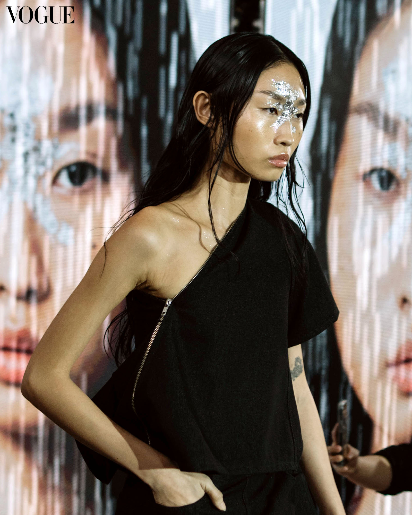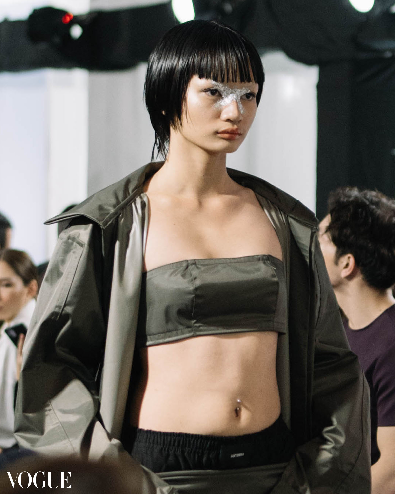 Accompanied by sounds of rain, Antonina’s latest collection is storm-inspired. Dewy looks, rained-on hair, and sleek, structured updos reminiscent of the aftermath of a storm grace the budding brand’s runway looks. Silver and blue foliage and icy-white accents around the eyes emulate soft water splatters on the center of the face, while a touch of brutality makes its way into the mix with facial piercings and sharp winged flicks.