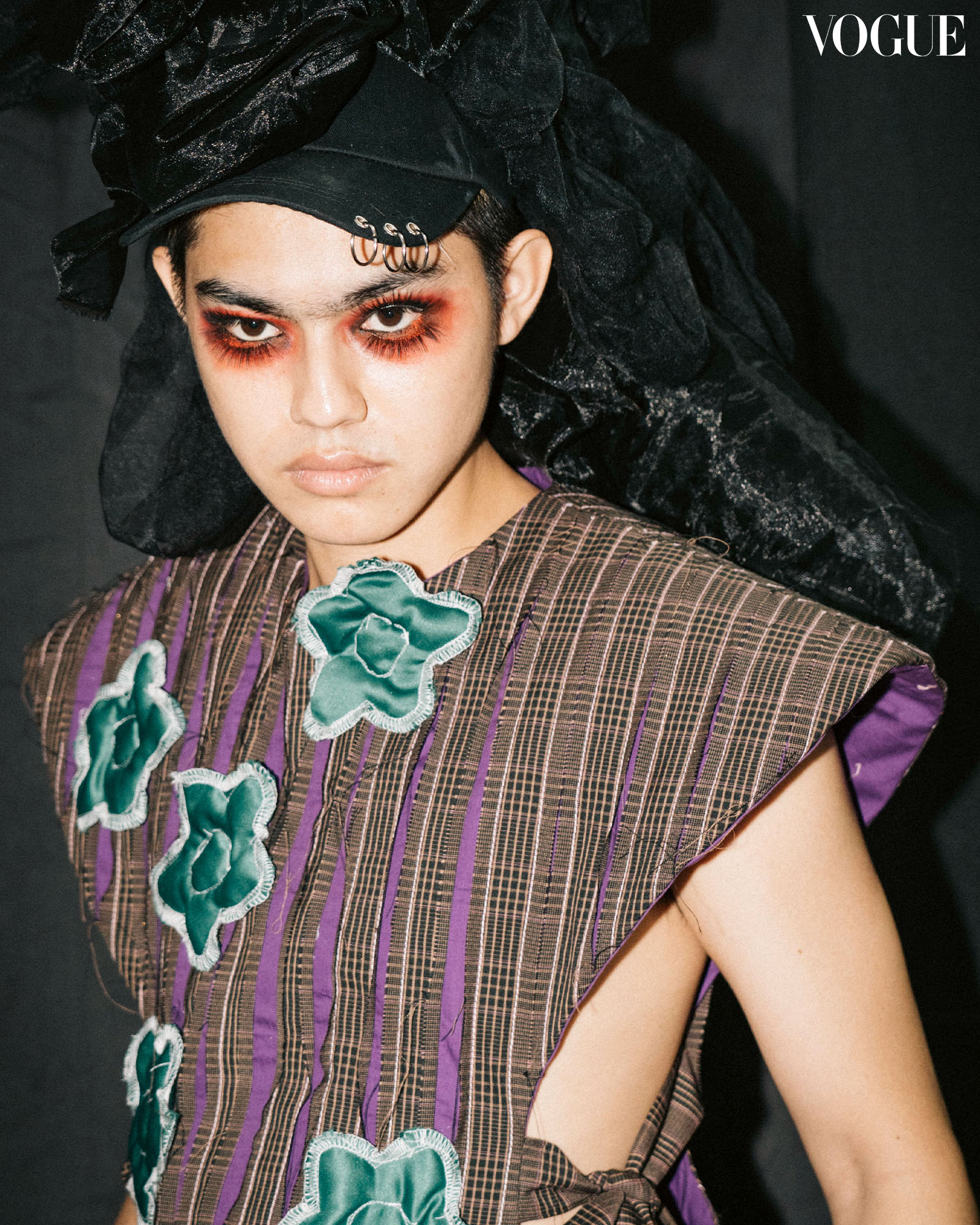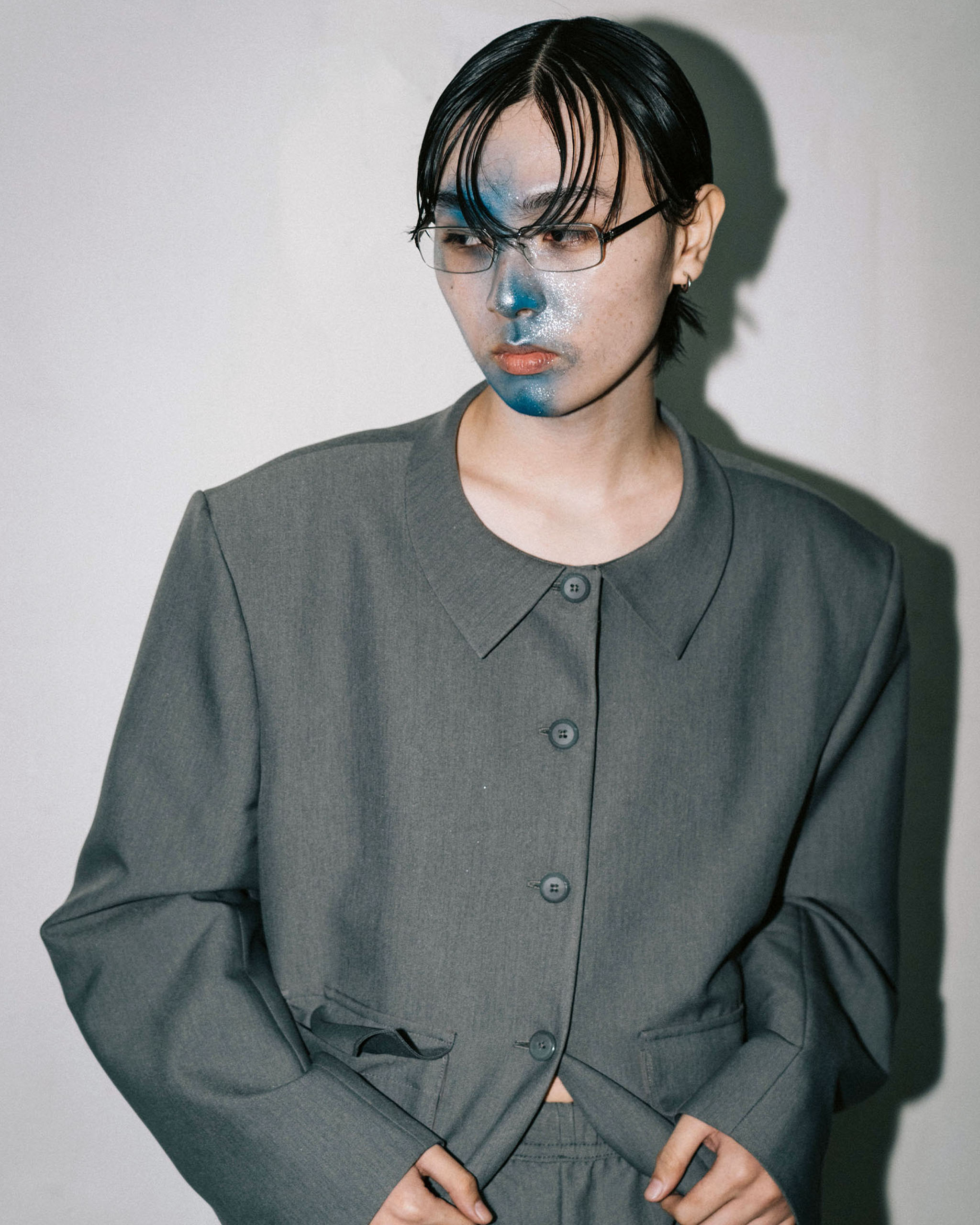 In their collection entitled “Ready to Serve”, Randolf brings to life a diner full of customers through the sleepy eyes of diner staff slipping in and out of wakefulness. In this dream-like reimagining, models are adorned in a range of whimsy and theatrical makeup. A splash of color on the inner corners, graphic liner in the shape of stars, glitter under eyes, and a full-face of rhinestone embellishment — Randolf was all about loud character. Hairstyles harkened back to the vibrant fun of the ‘90s, with spiked buns and sleek sides. Male models joined the fun, embracing flushed cheeks in peachy hues and perfectly tousled, fluffy brows.