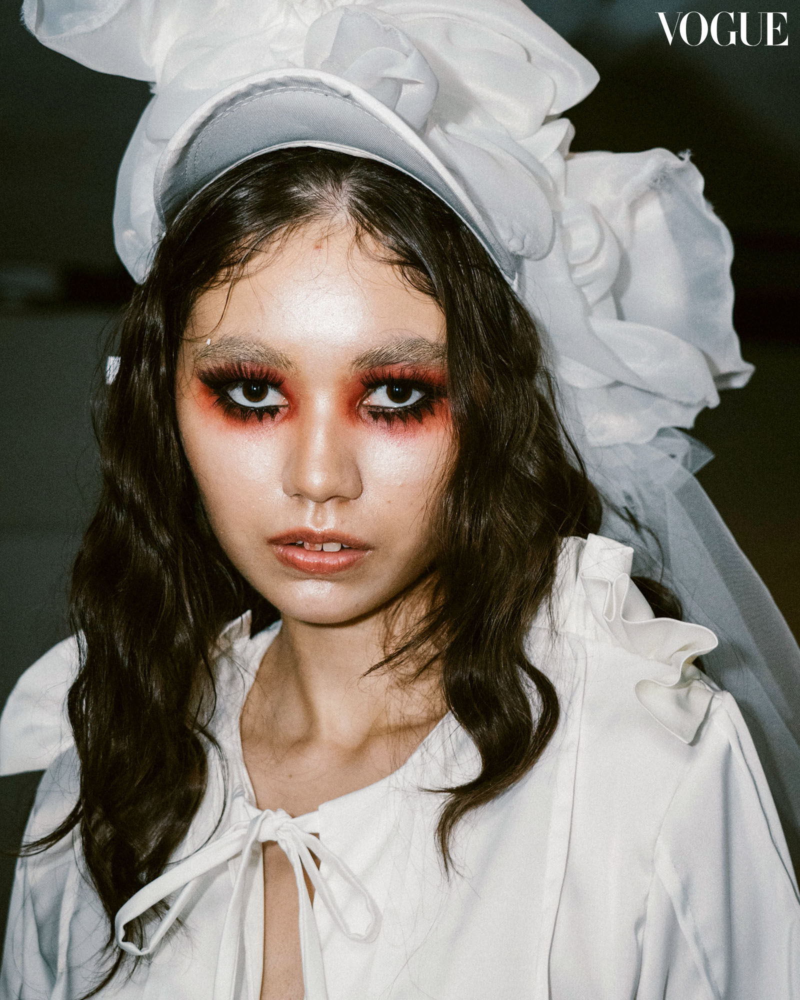 Ha.Mu brought drama to the forefront with uniform shades of deep red shadow and full dramatic lashes that frame the eyes, invoking an air of dark fantasy – an interesting juxtaposition with the collection’s otherwise soft, bright, and whimsical colors and textures. Complementing the bold eye makeup, the rest of the face remained bare save for a subtle gloss. Models were notably styled with either bold, statement-making brows or the daring choice of none at all, leaving no room for the in-between.